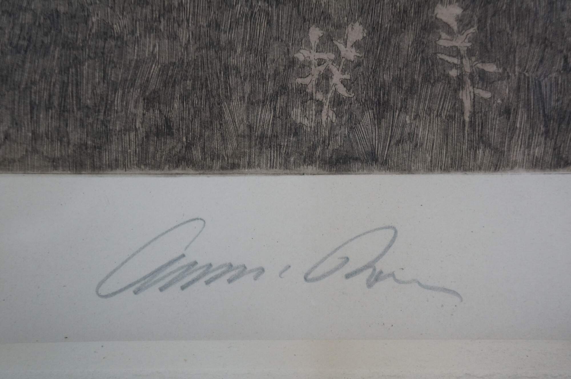 Late 19th century black-and-white etching by Ernest C. Rost. Country road at the edge of a forest, passing through a stone wall towards a village in the distance. Signed in plate “ E.C. Rost 1890,” lower left. Remarque of a tree, lower left. Copyright 1890 by Fishel, Adler & Schwartz, New York. Pencil signature, lower right. Wood frame; no mat.