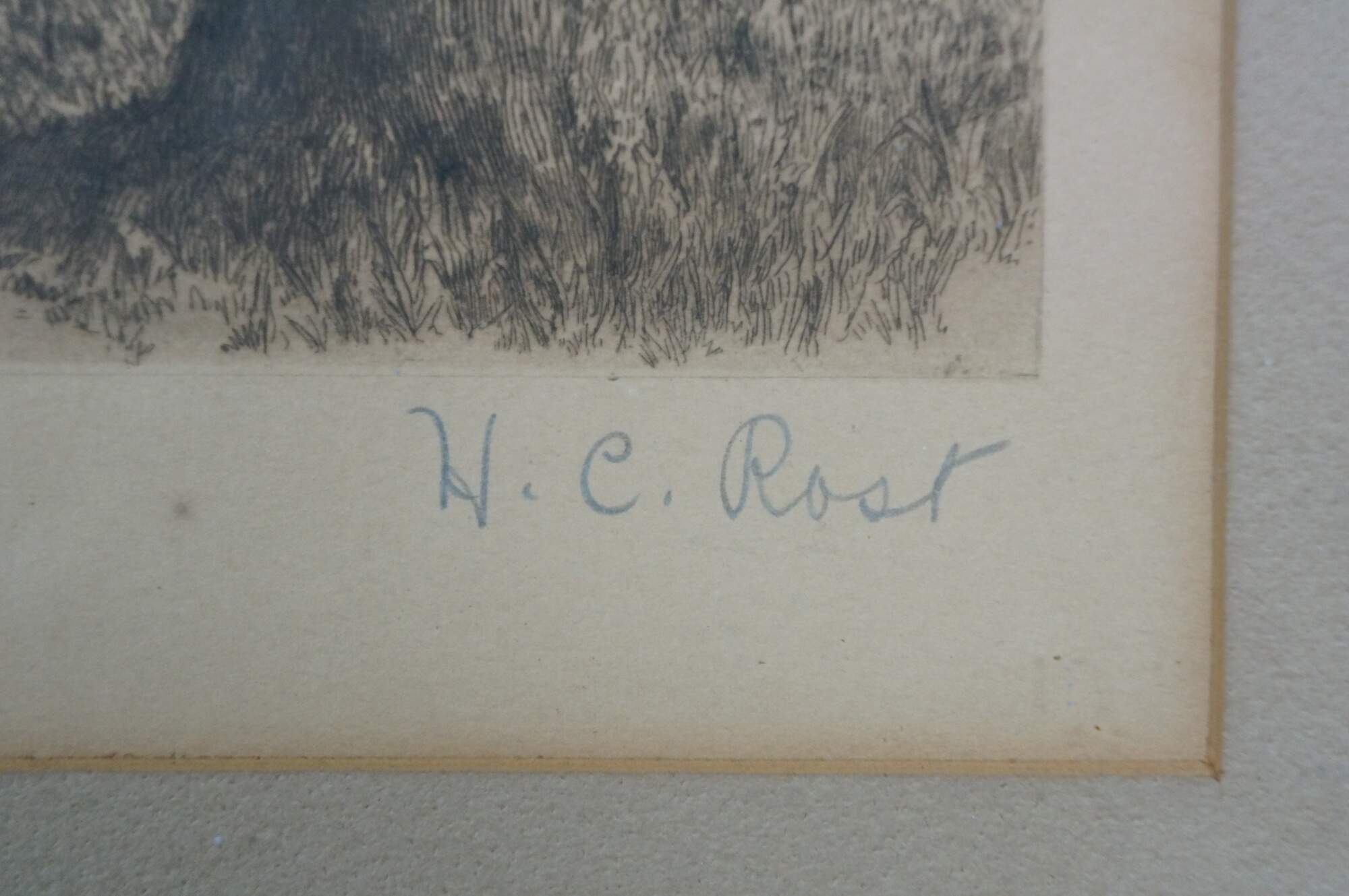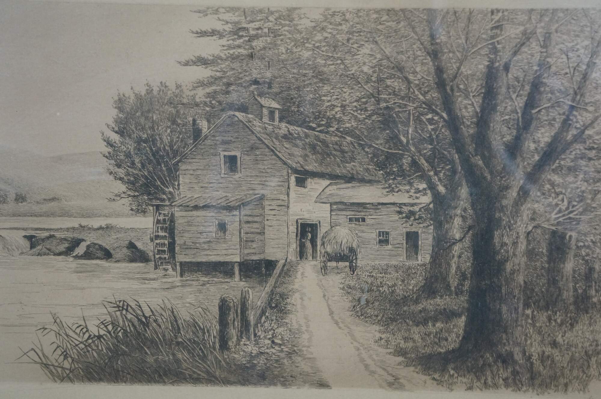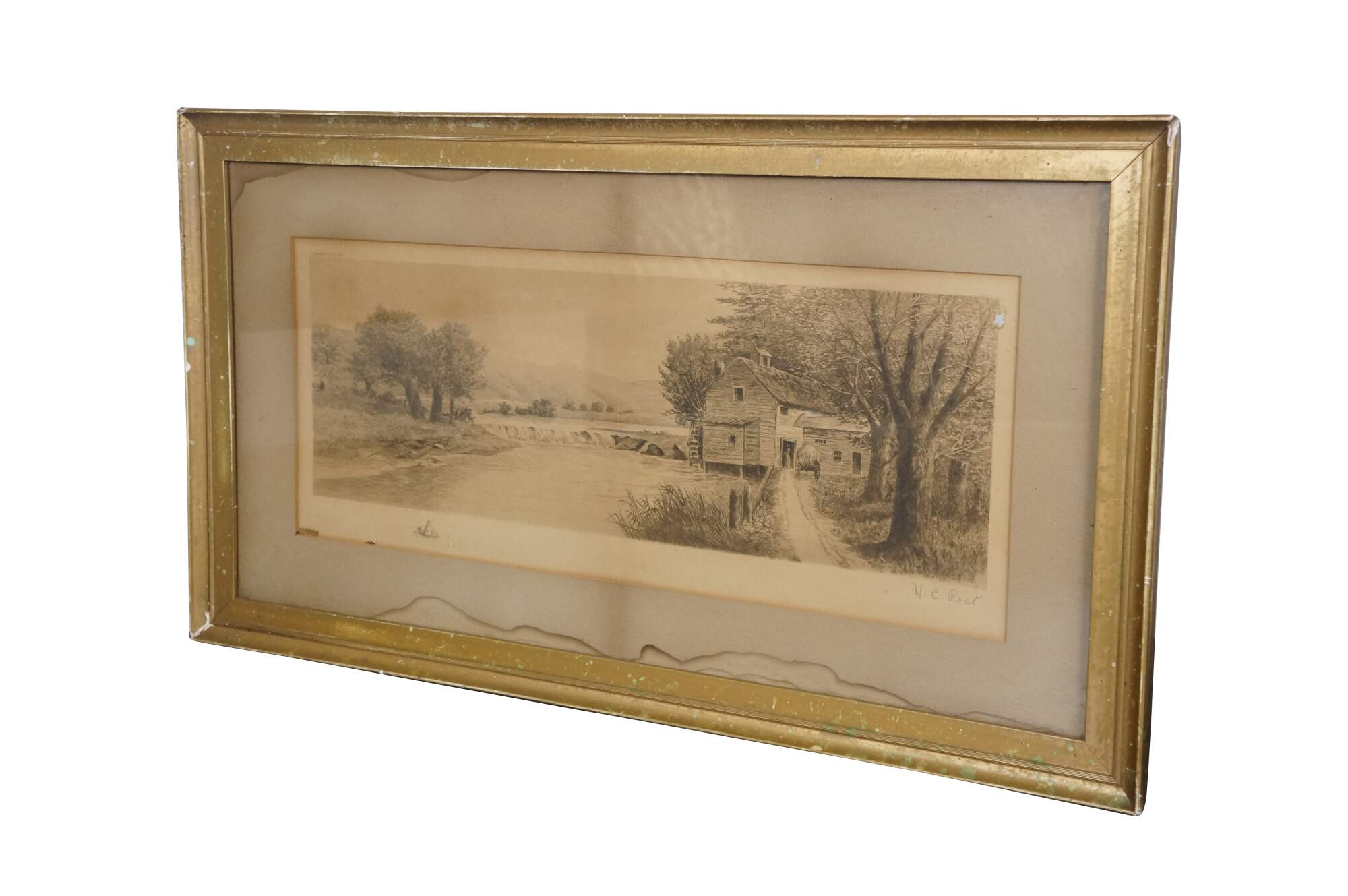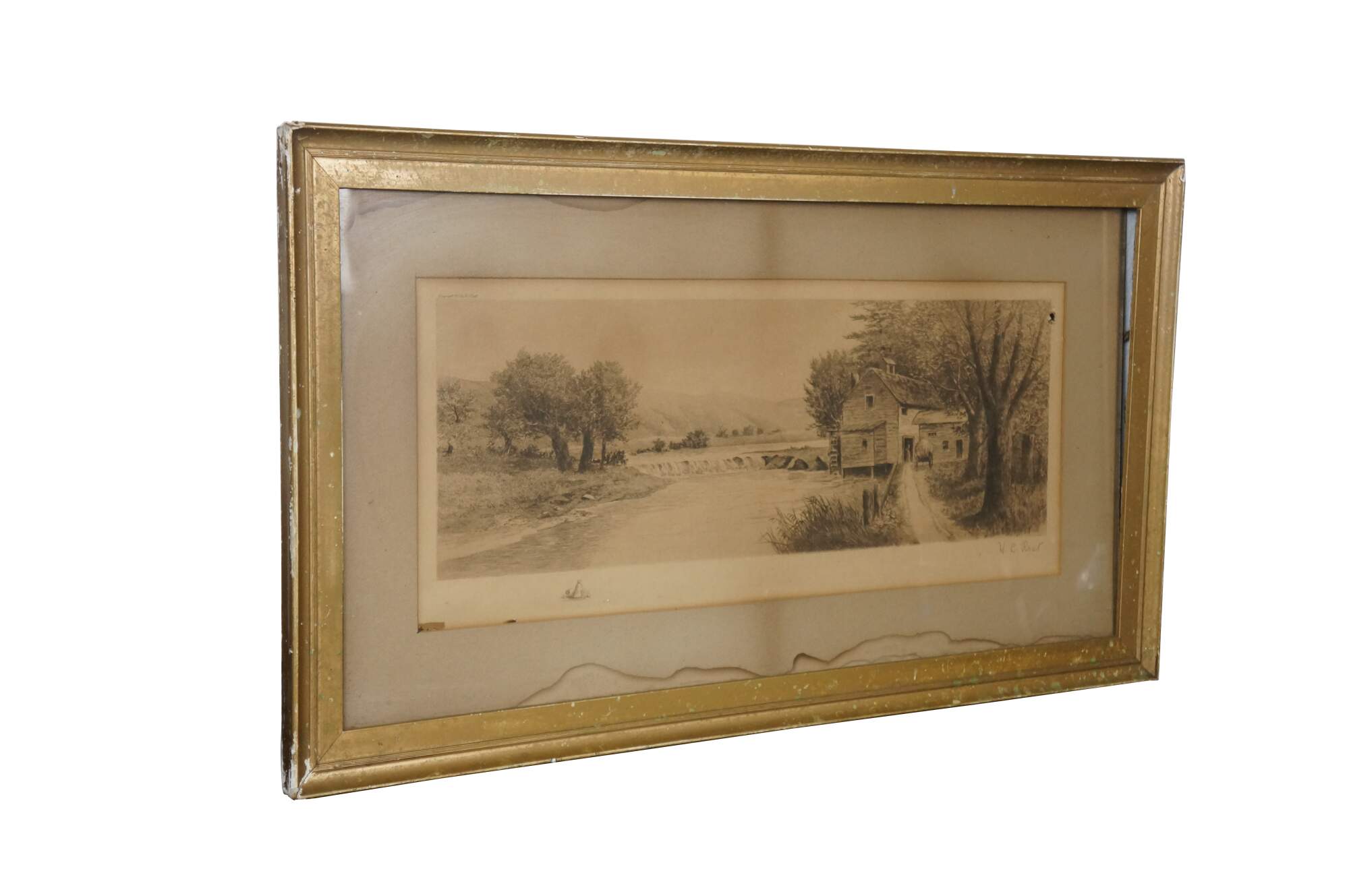 Late 19th century black-and-white etching by H.C. Rost. Panoramic country landscape showing a water mill by a river, with a figure in the doorway. Remark of a pair of mice and small sacks along the lower edge. Copyright 1895 by H.C. Rost. Pencil signed in the lower right corner. Beveled giltwood frame; gray mat.