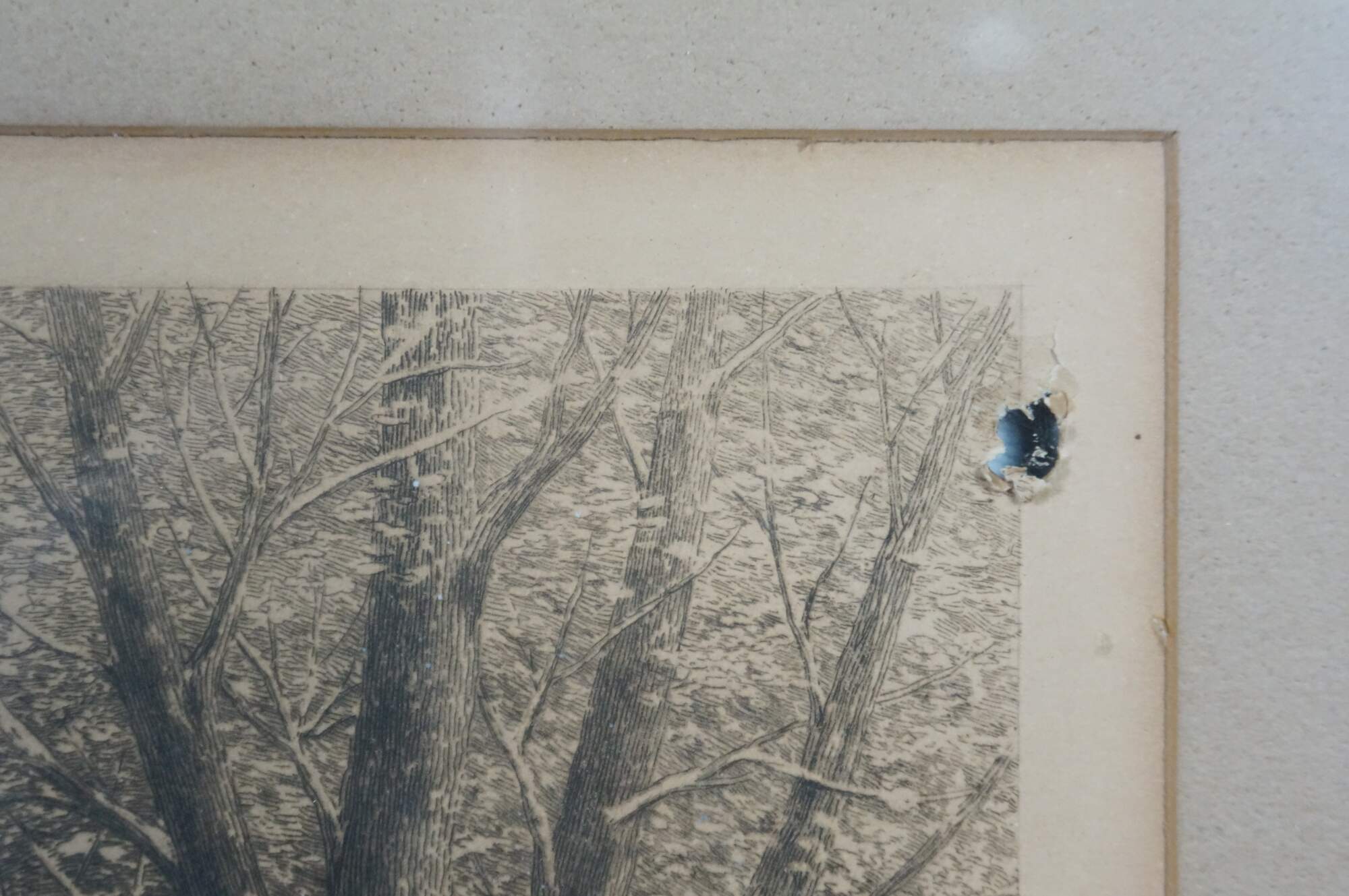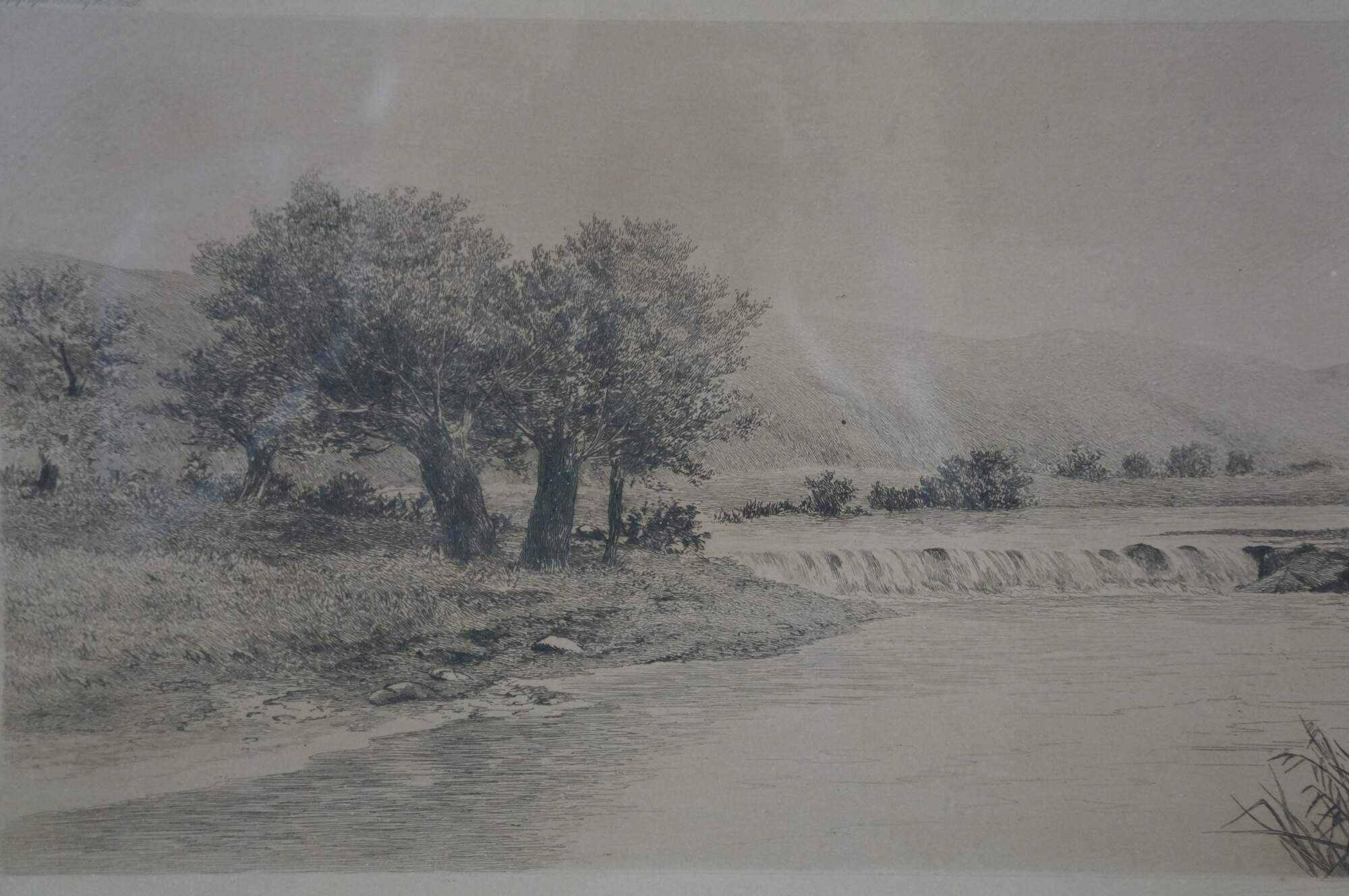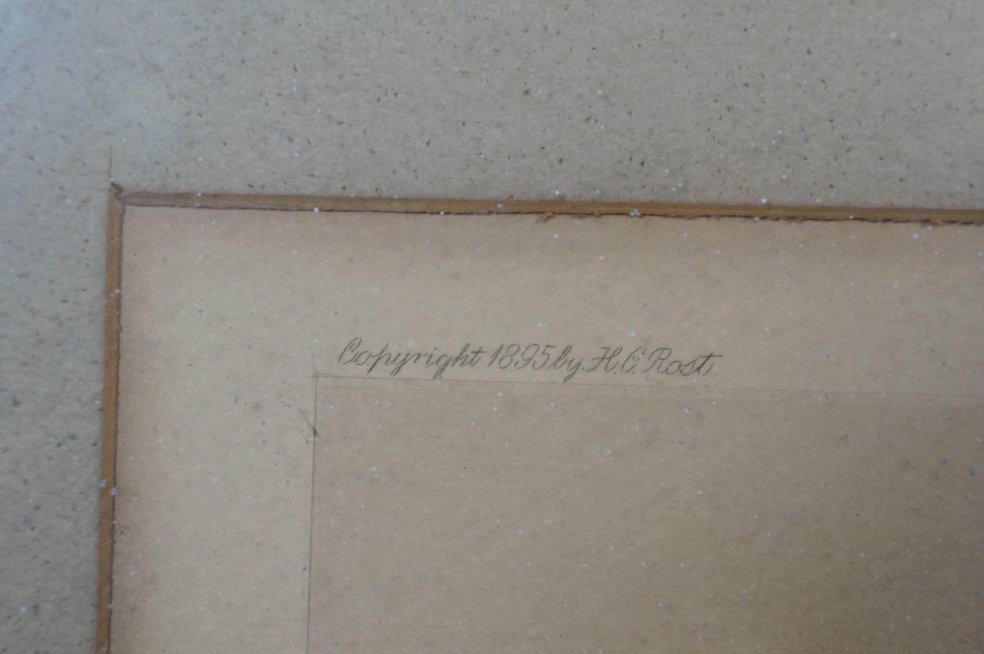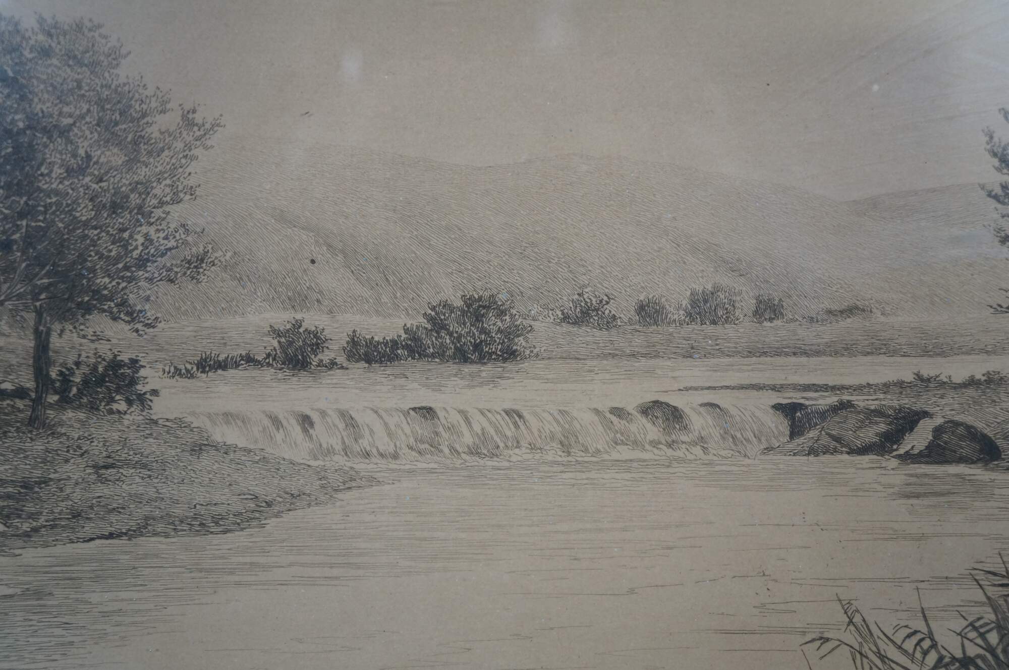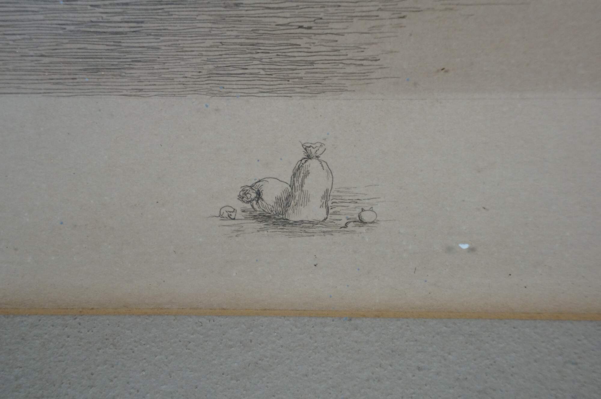 Late 19th century black-and-white etching by H.C. Rost. Panoramic country landscape showing a water mill by a river, with a figure in the doorway. Remark of a pair of mice and small sacks along the lower edge. Copyright 1895 by H.C. Rost. Pencil signed in the lower right corner. Beveled giltwood frame; gray mat.