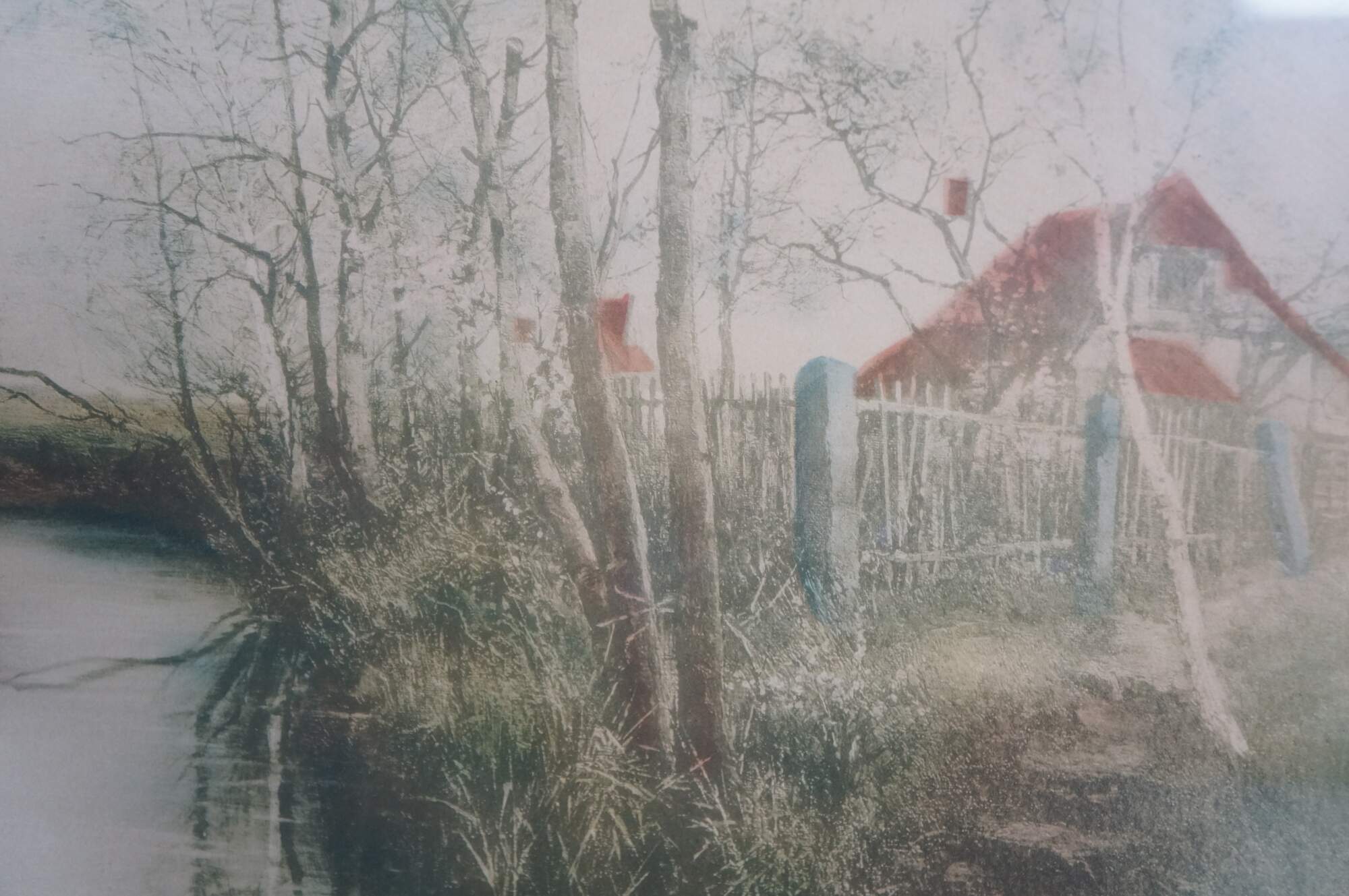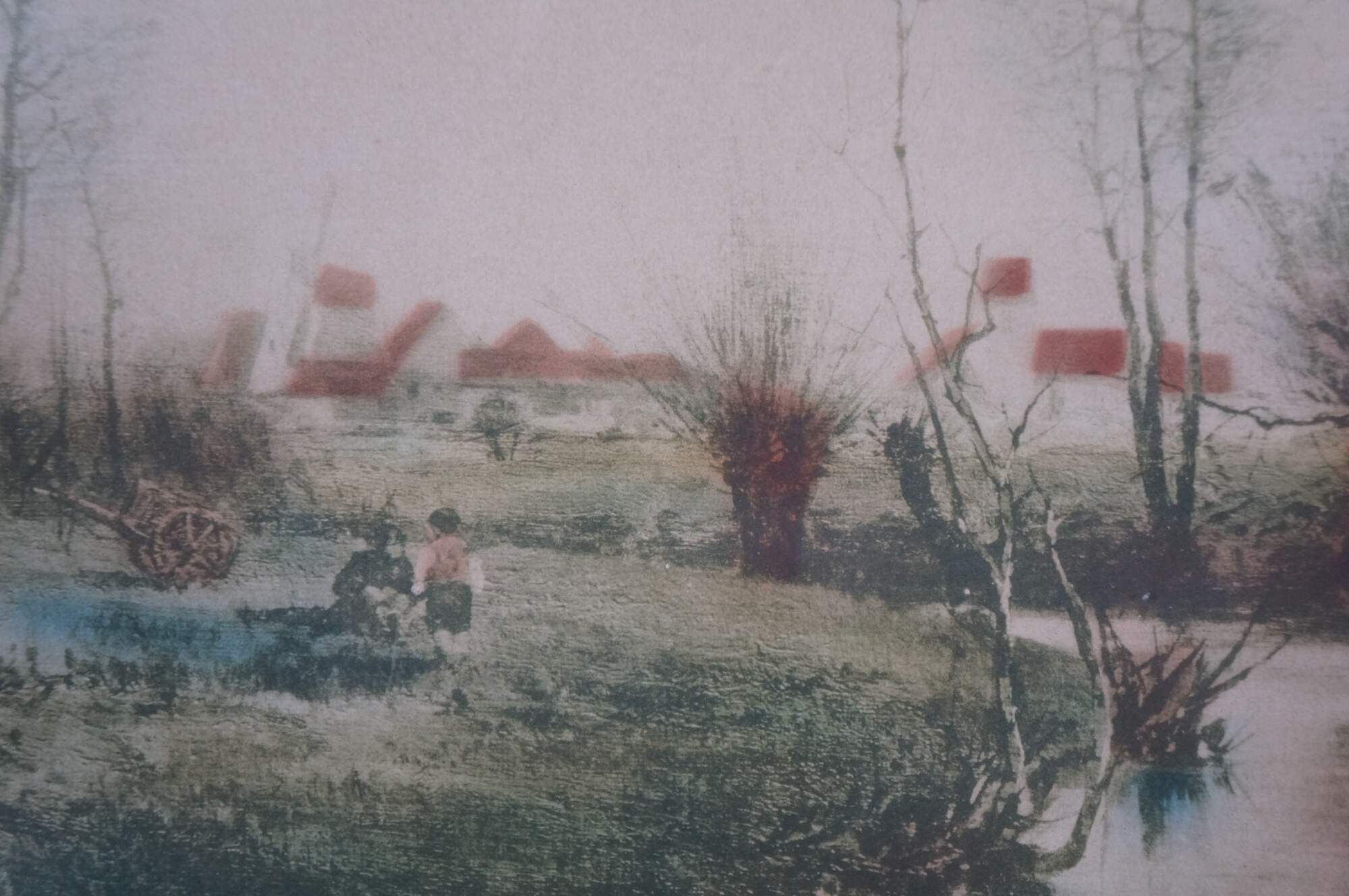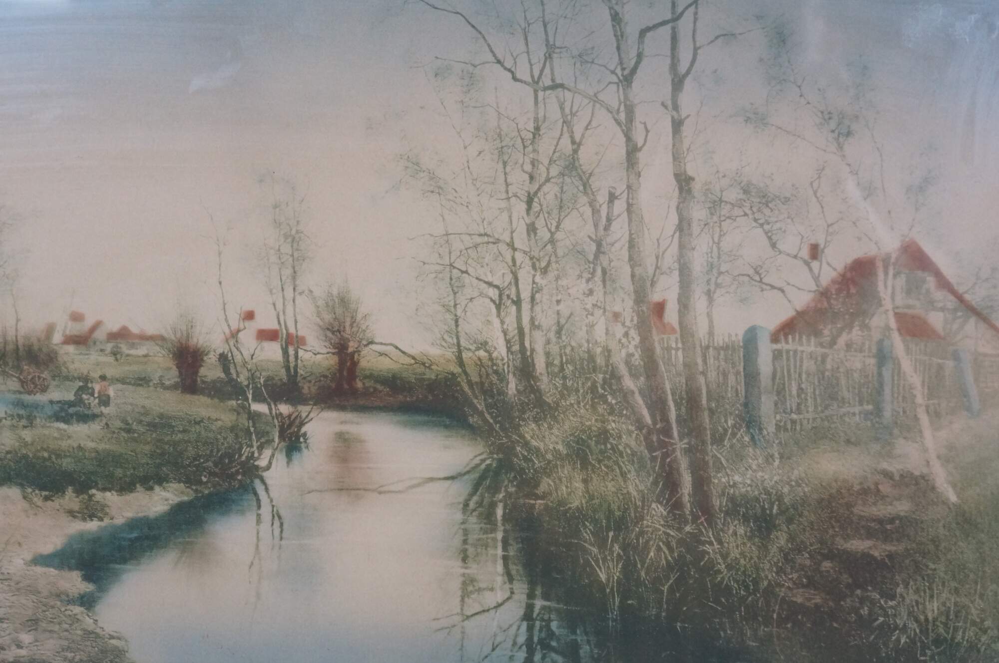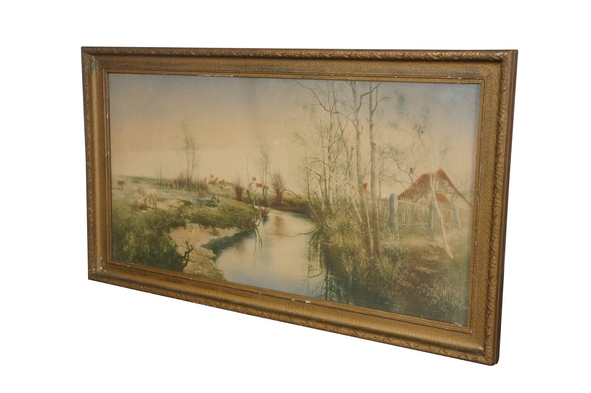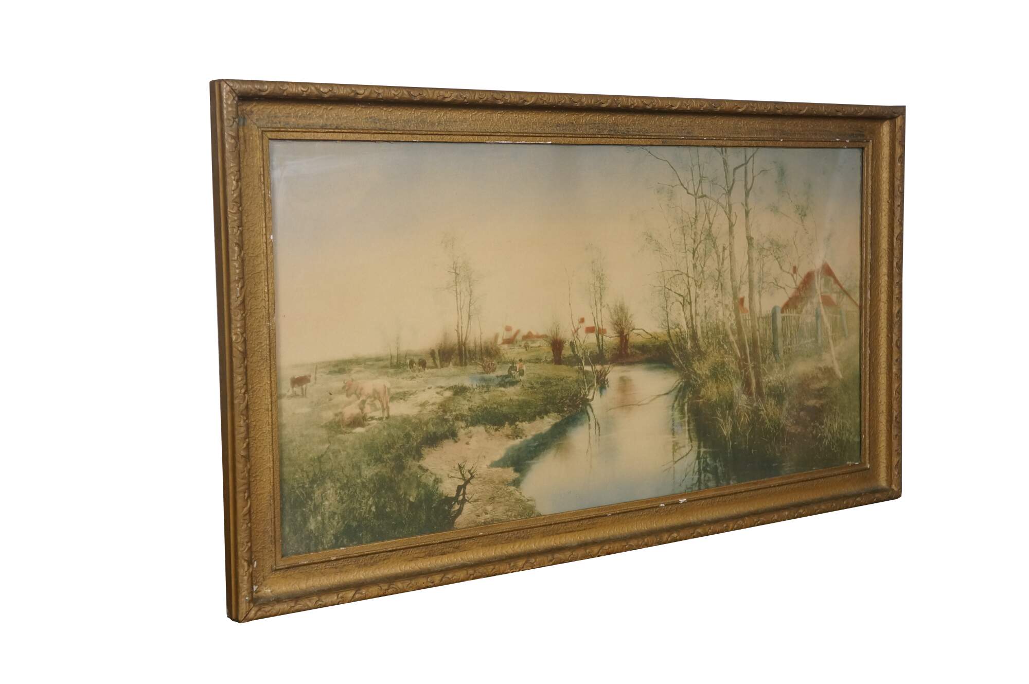 Early 20th century hand colored print. Country landscap showing a pair of figures minding a herd of cows by a river, with a red roofed farm in the distance. Partially obscured copyright mark in lower right corner. Beveled giltwood frame with carved border.