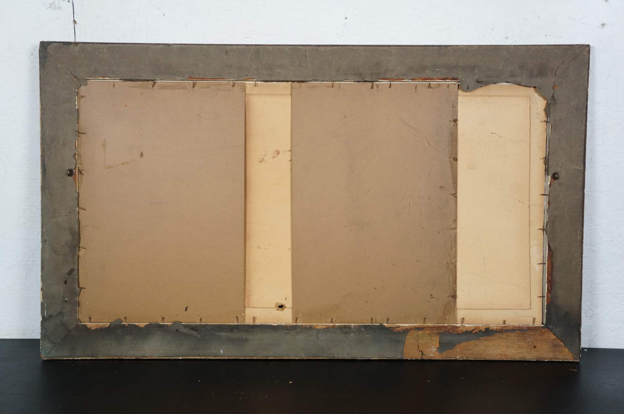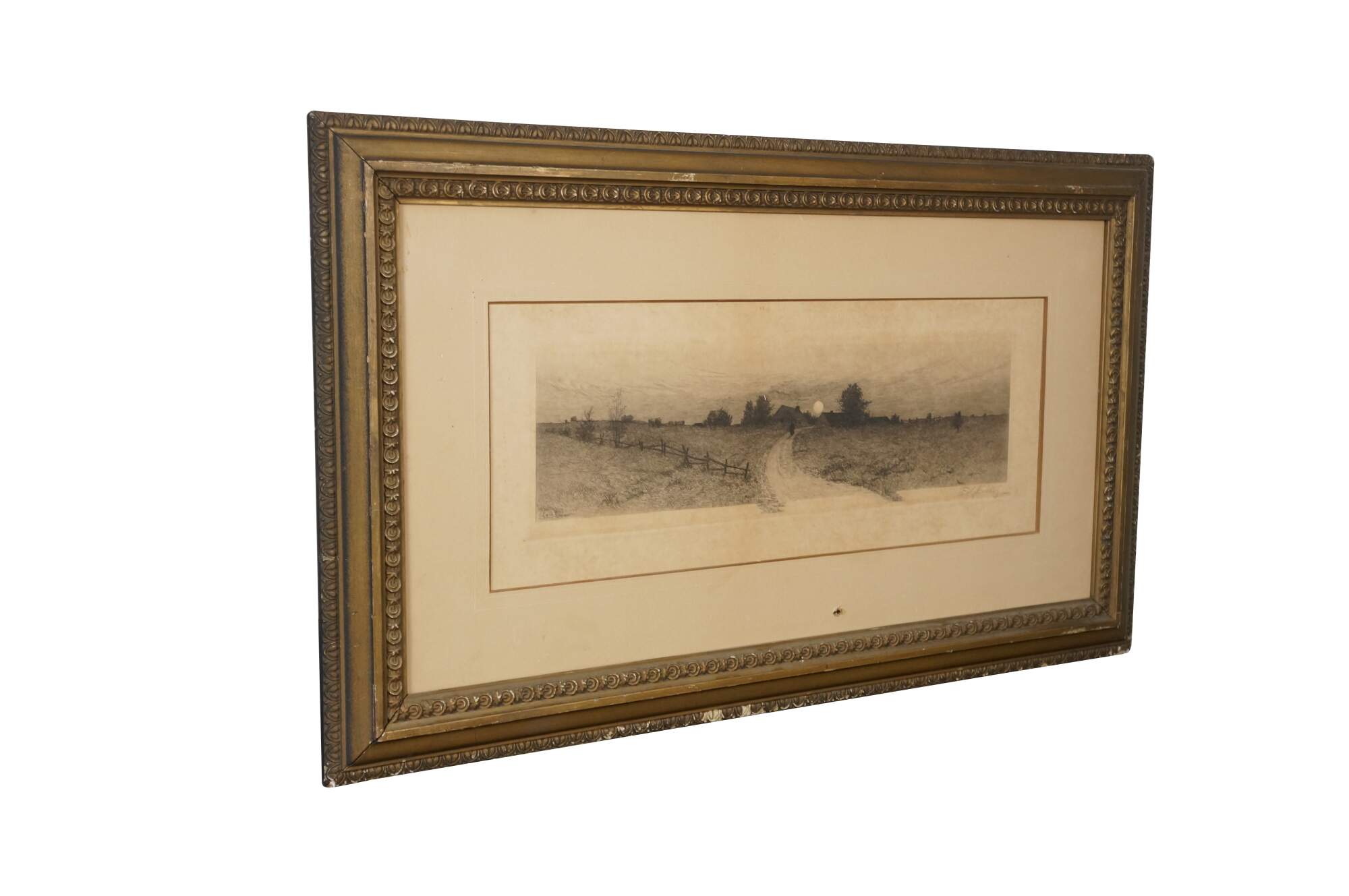 Wear and distressing to frame, chipping, paint loss, no glass; discoloration, foxing to print, puncture to mat.