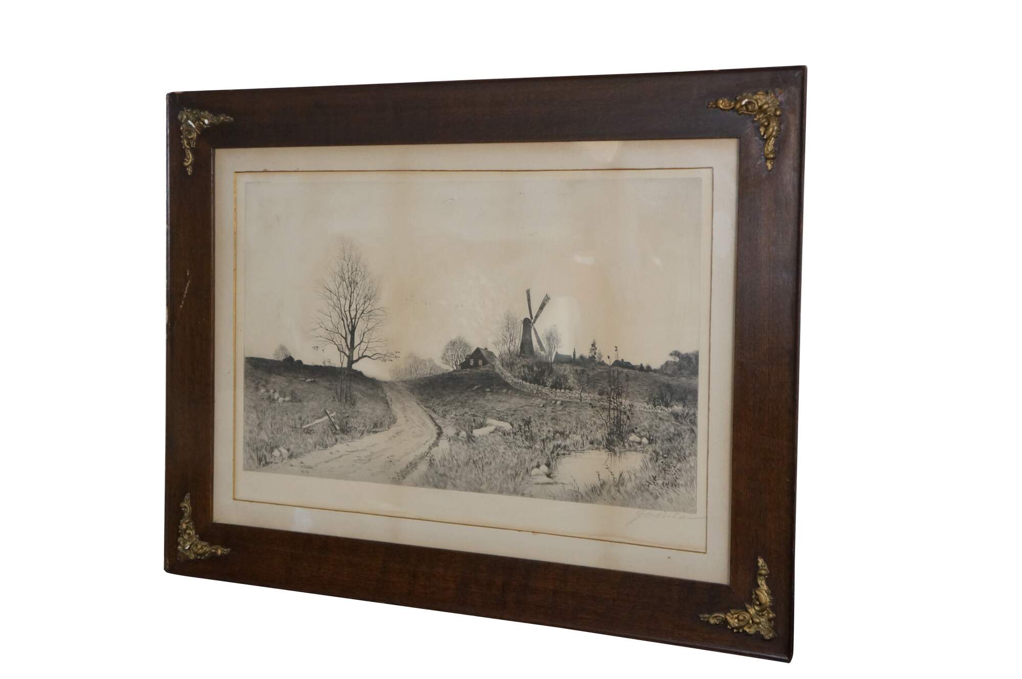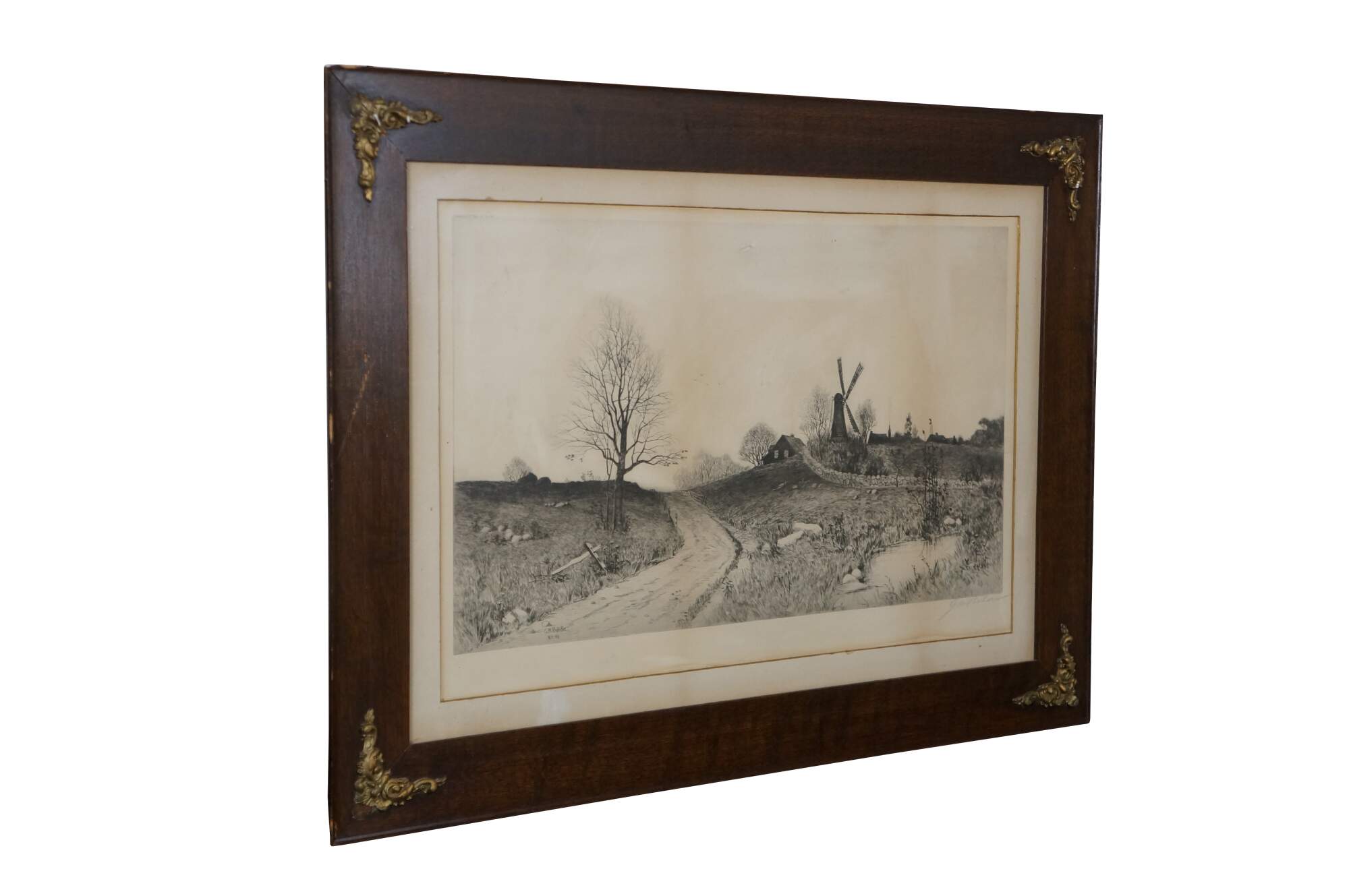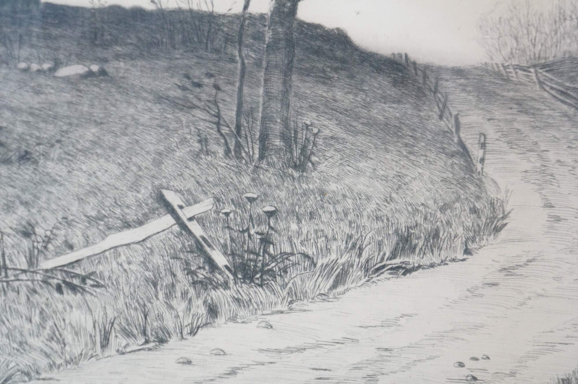 Late 19th century black and white countryside landscape etching by George William Bohde (American, 1870-1939). Landscape showing a dirt road and a village / farmhouse / farm windmill on a hill. Pencil signed, lower right. Signed in plate G.W. Bohde N.Y. 90, lower left. Copyright by G.W. Bohde, New York 1891. oak frame with gilt, scalloped applique corners; white mat.