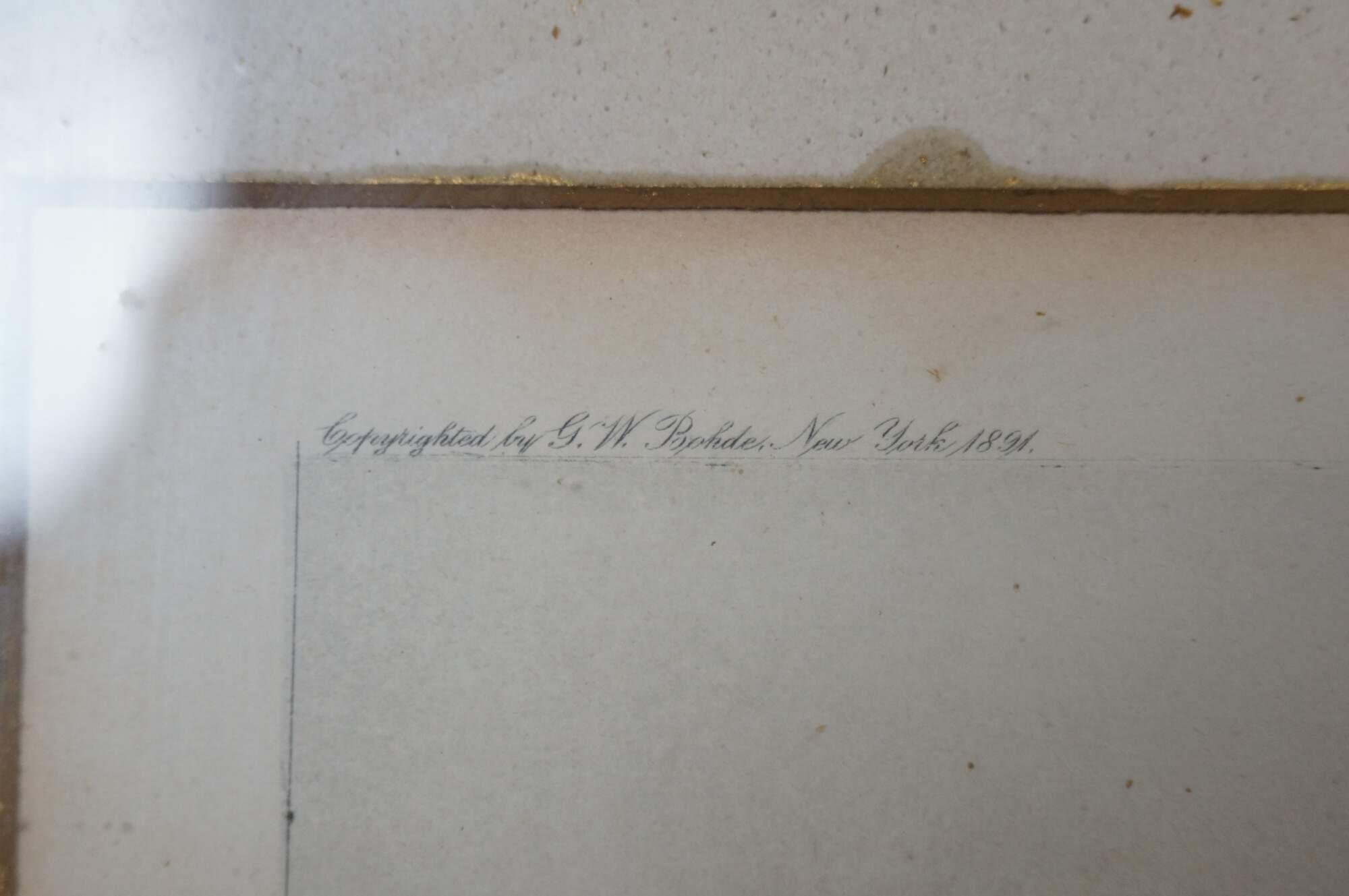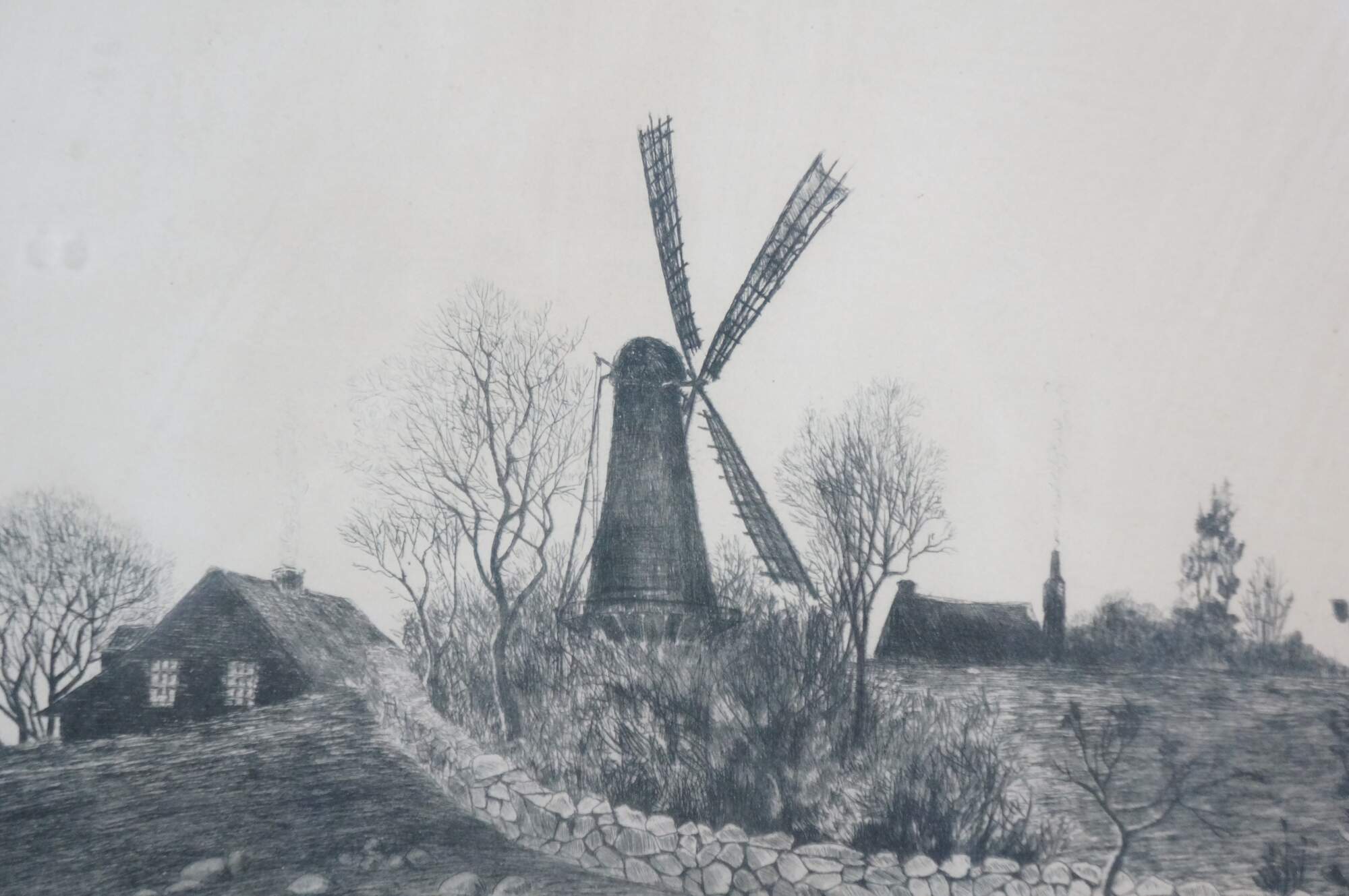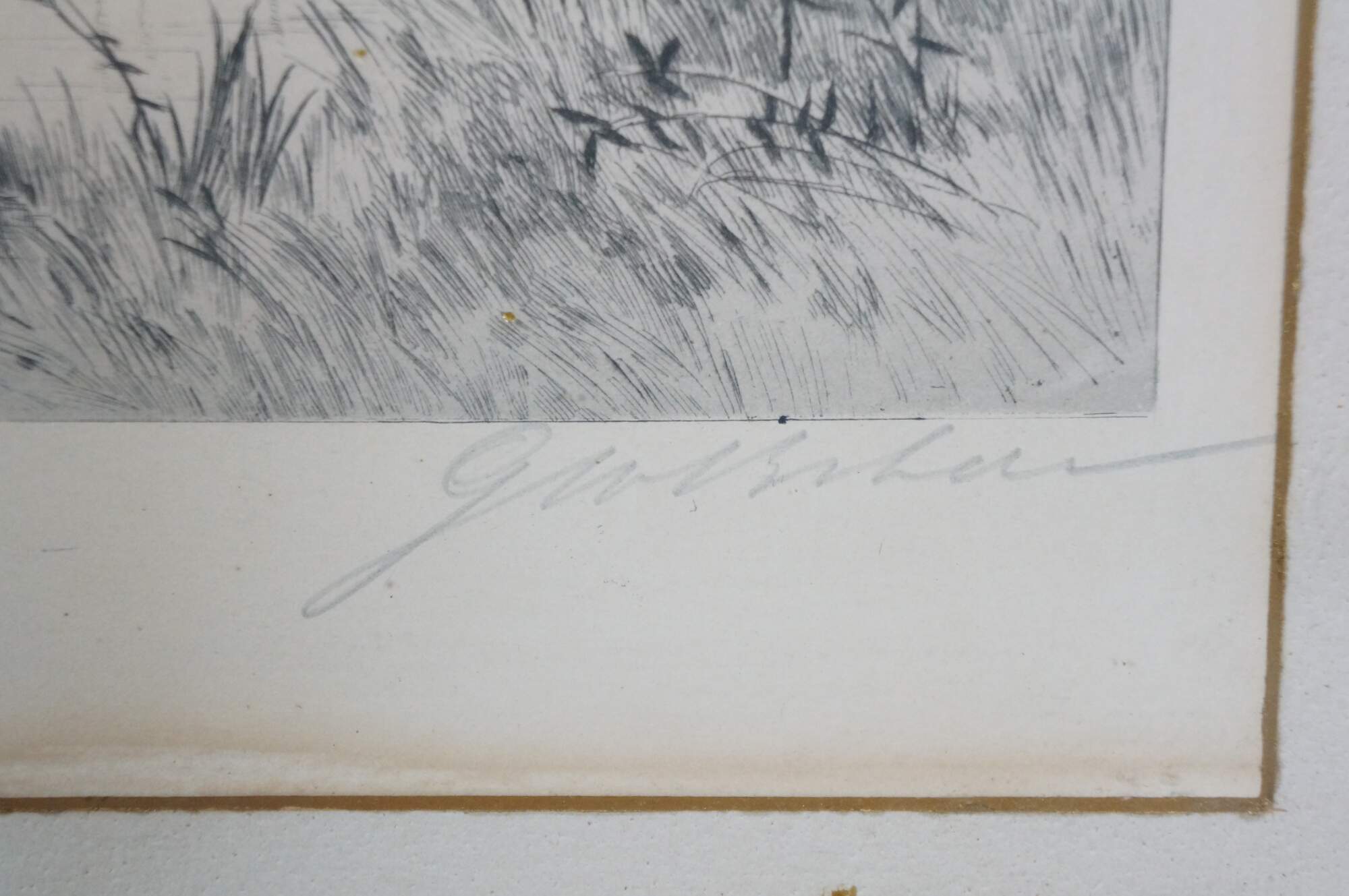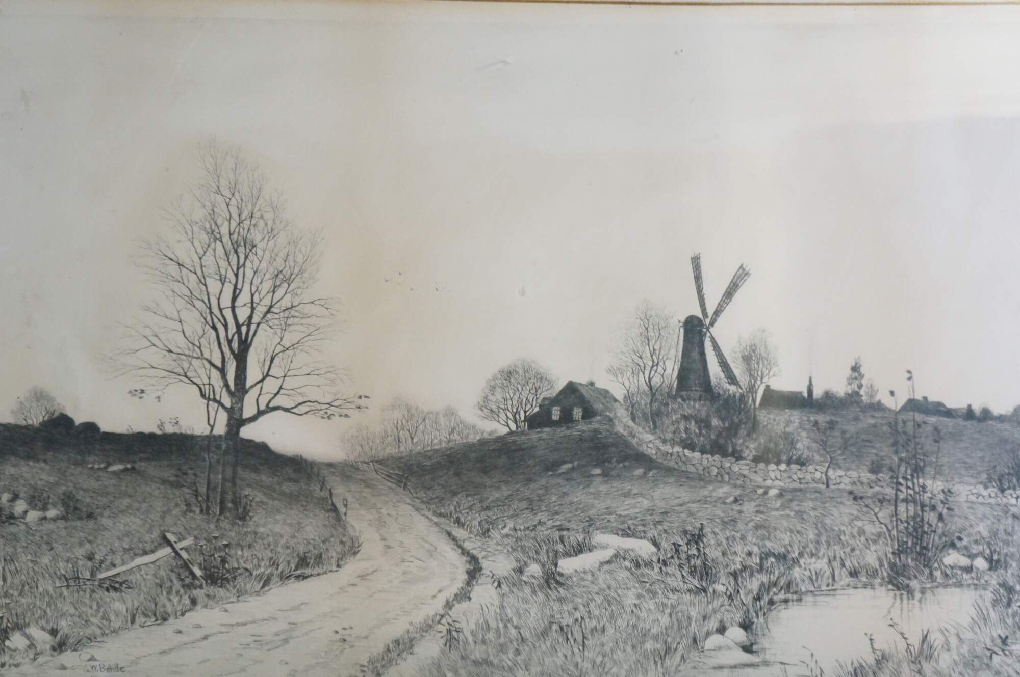 Late 19th century black and white countryside landscape etching by George William Bohde (American, 1870-1939). Landscape showing a dirt road and a village / farmhouse / farm windmill on a hill. Pencil signed, lower right. Signed in plate G.W. Bohde N.Y. 90, lower left. Copyright by G.W. Bohde, New York 1891. oak frame with gilt, scalloped applique corners; white mat.