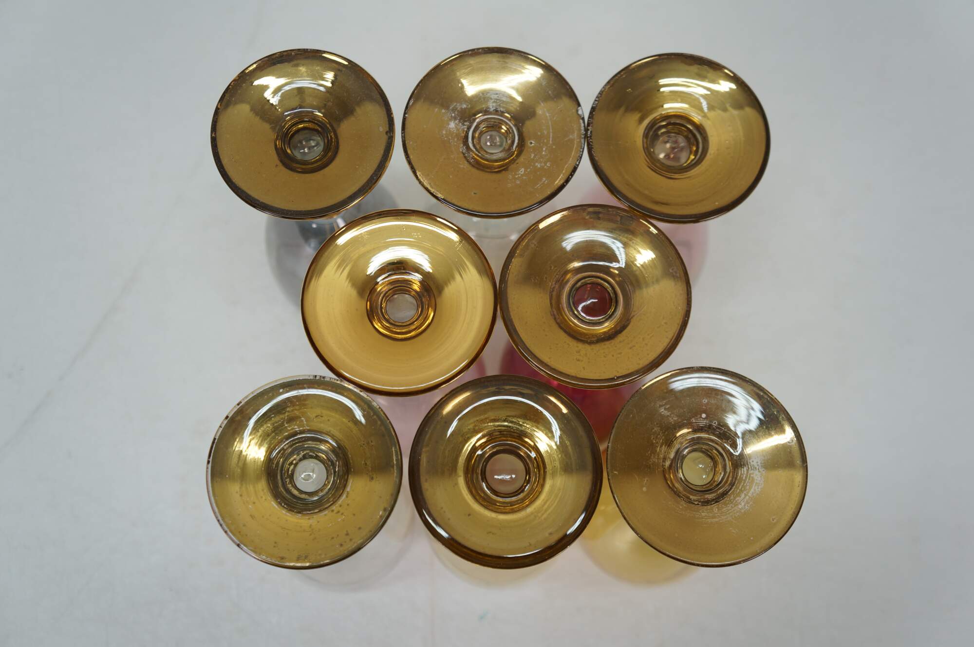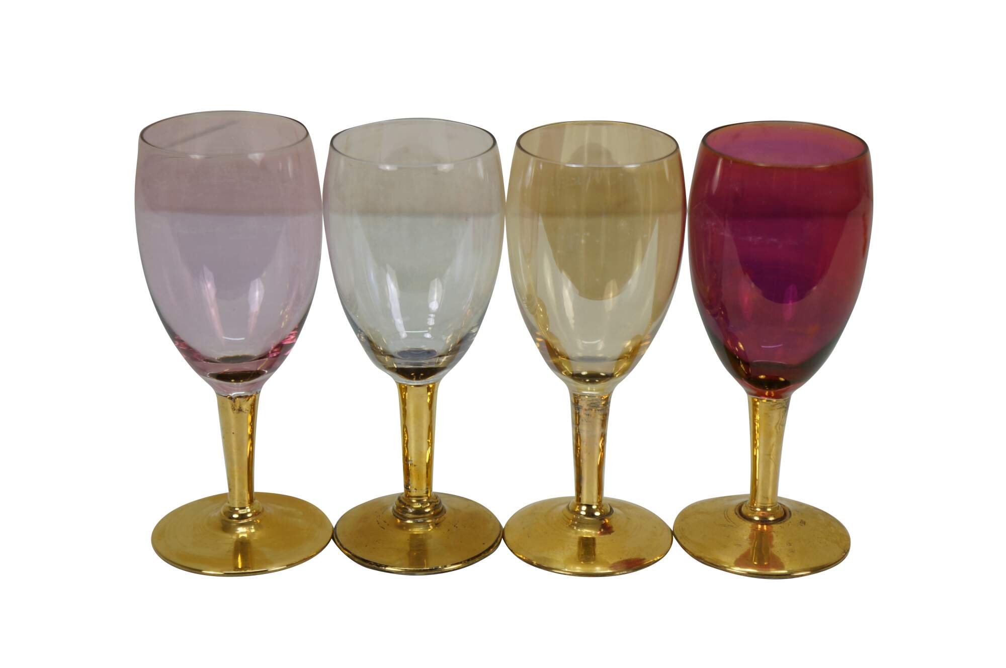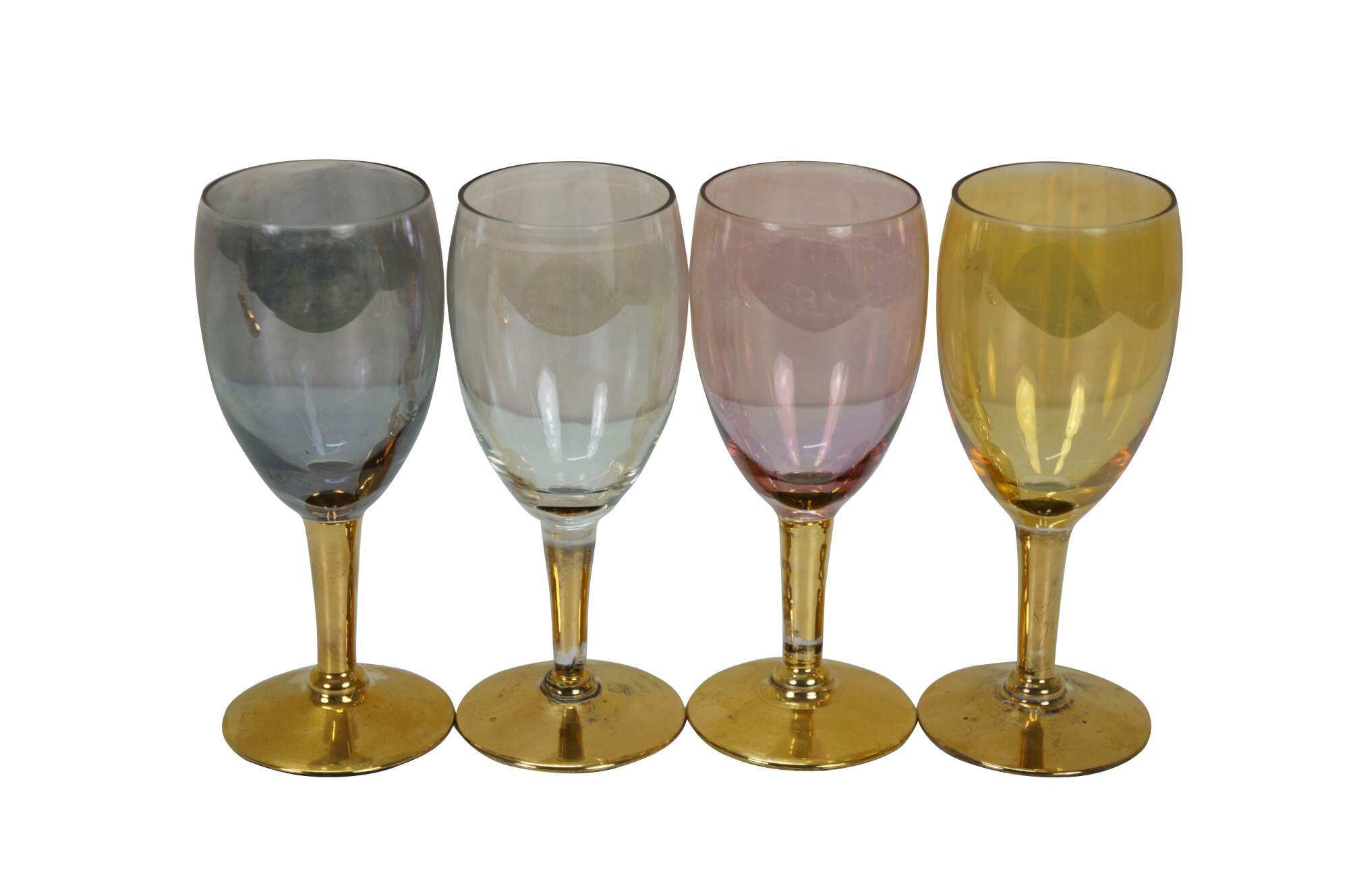 Set of 8 circa mid 20th century Arlecchino / Harlequin fiestaware white wine glasses with iridescent, multi-colored bowls and gilt stems. Rupel Boom.