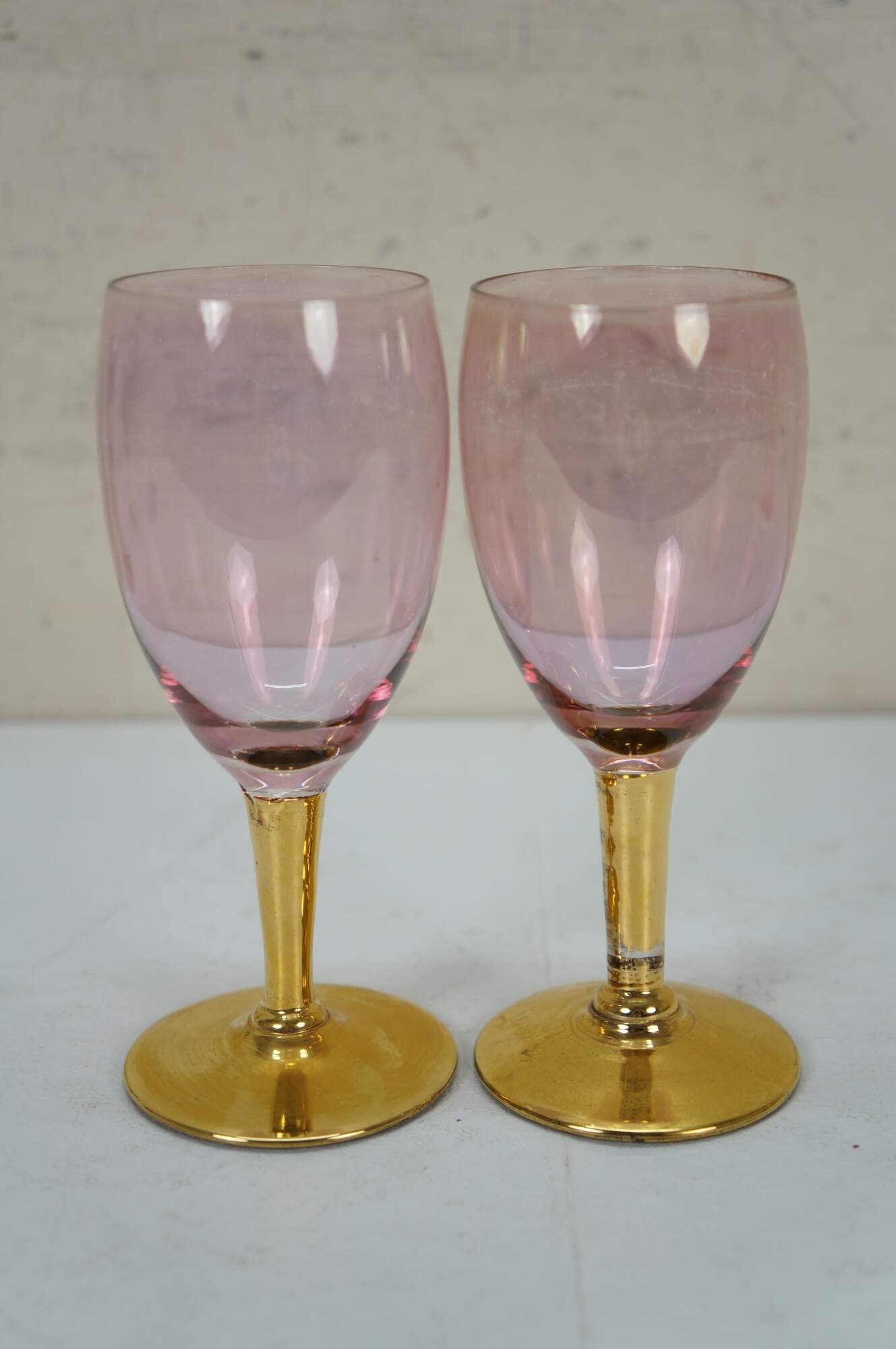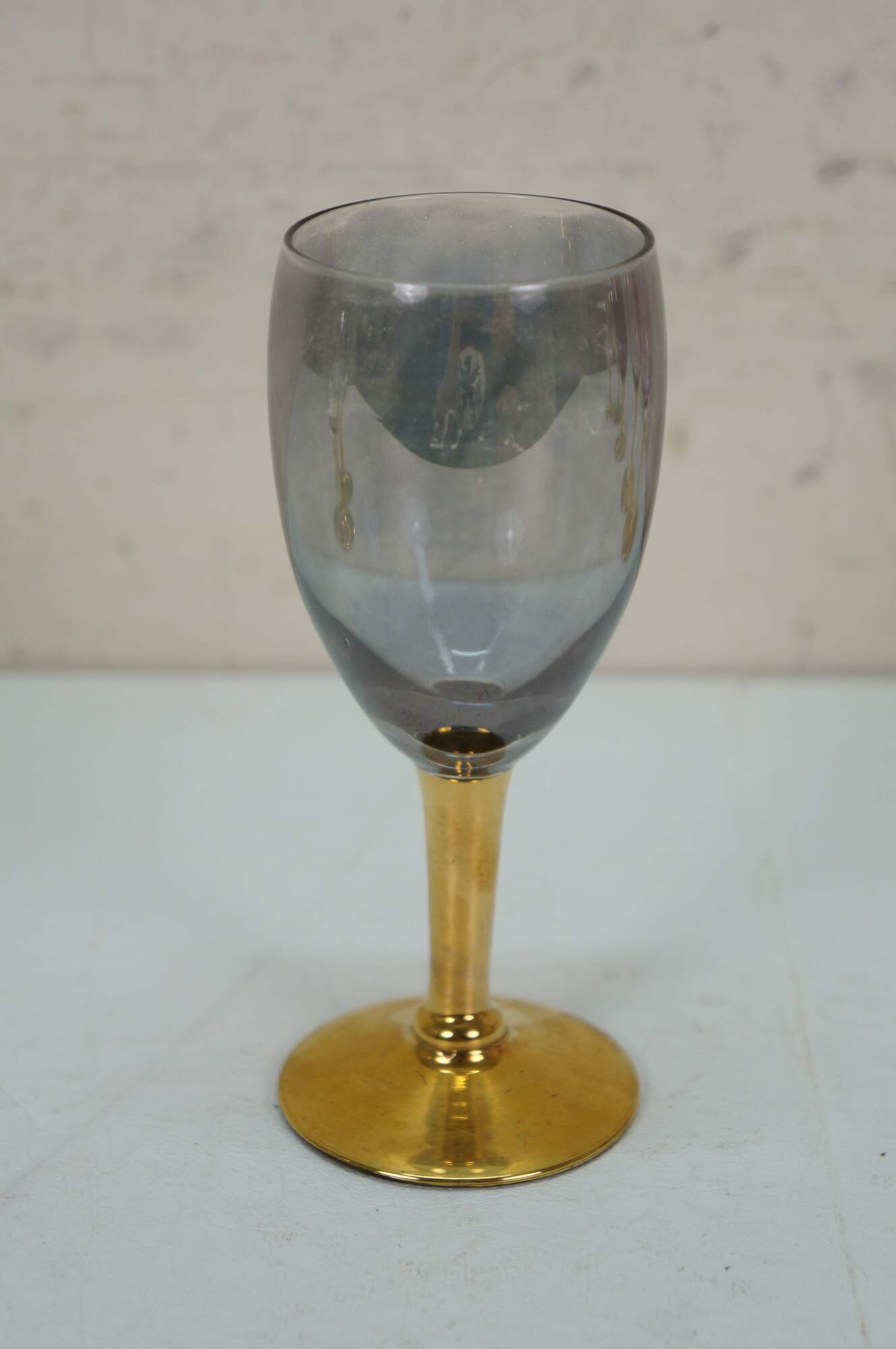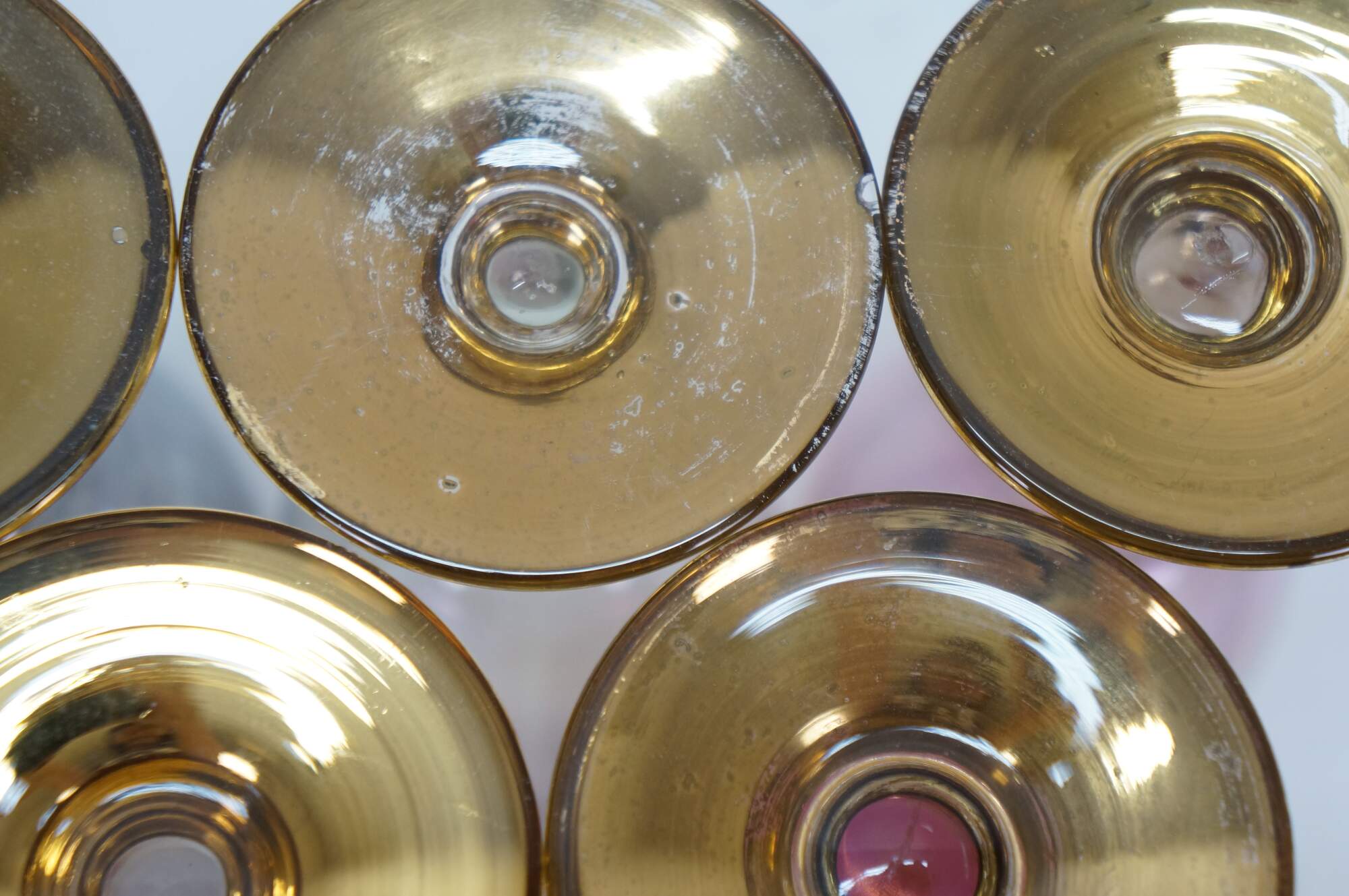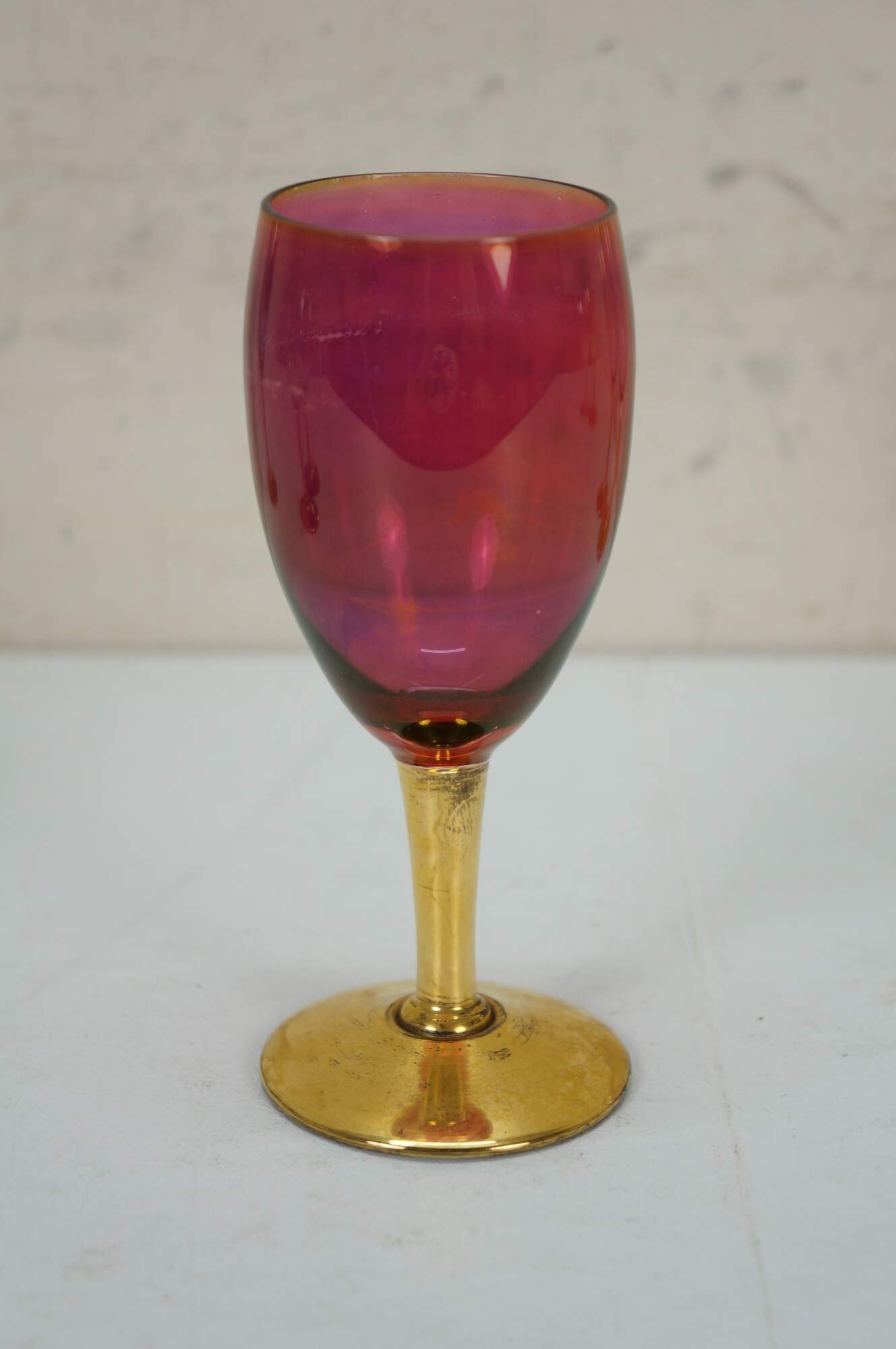 Set of 8 circa mid 20th century Arlecchino / Harlequin fiestaware white wine glasses with iridescent, multi-colored bowls and gilt stems. Rupel Boom.