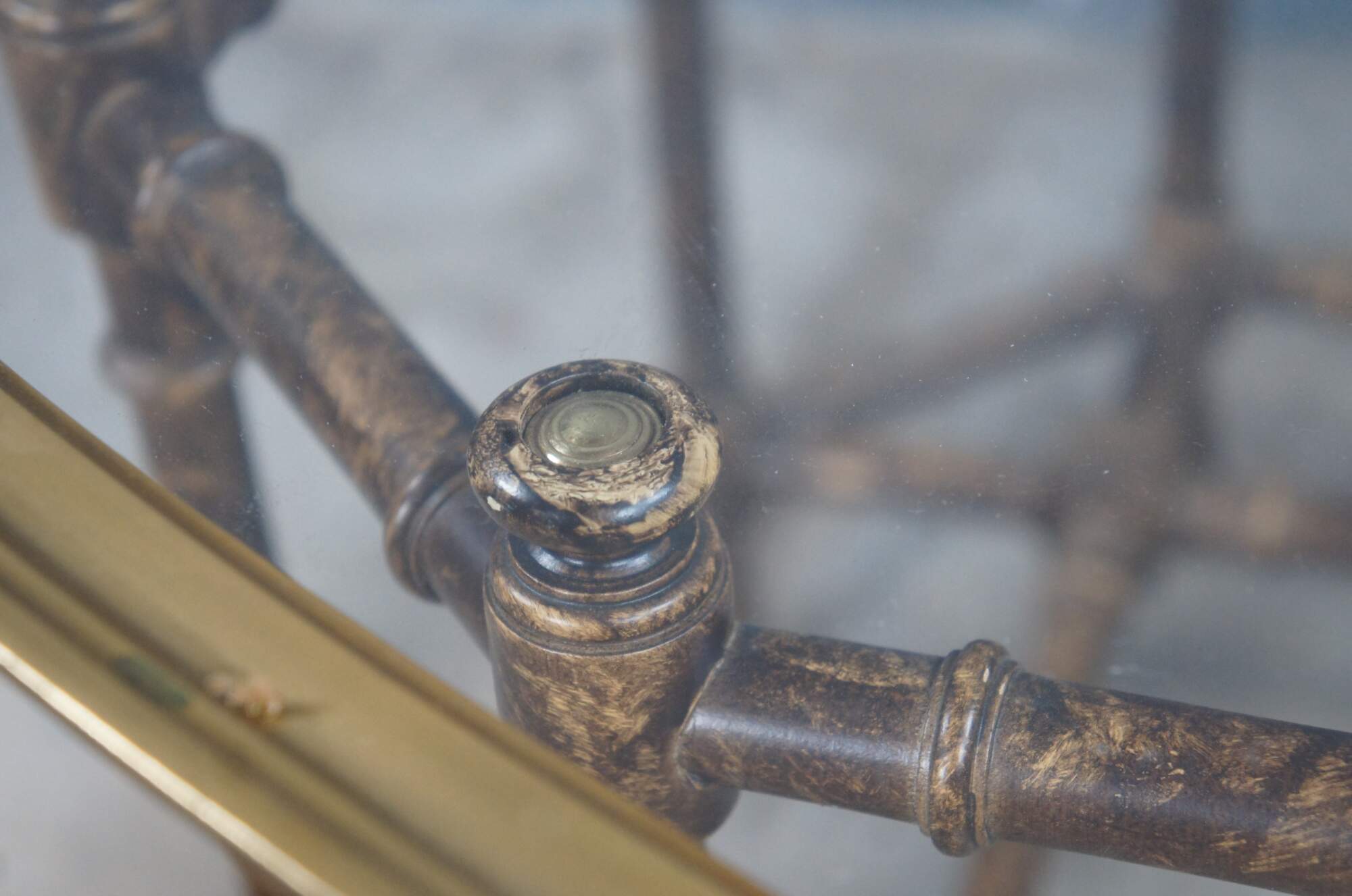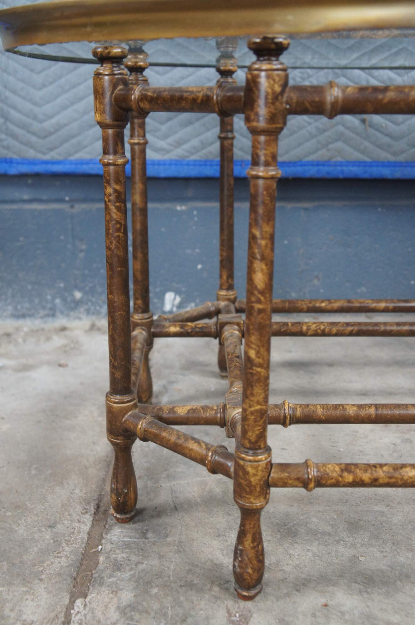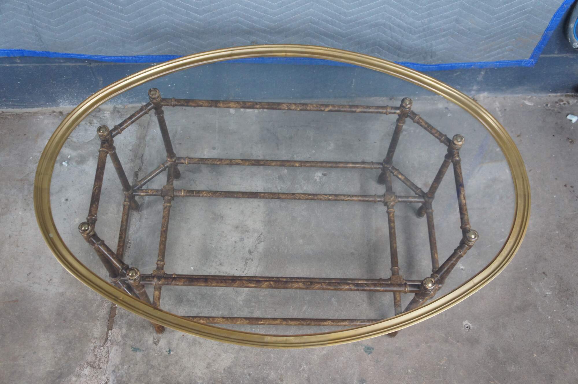 Vintage Baker Furniture faux bamboo tortoise shell finish coffee or cocktail table featuring an oval top with brass gallery edge. Unmarked.