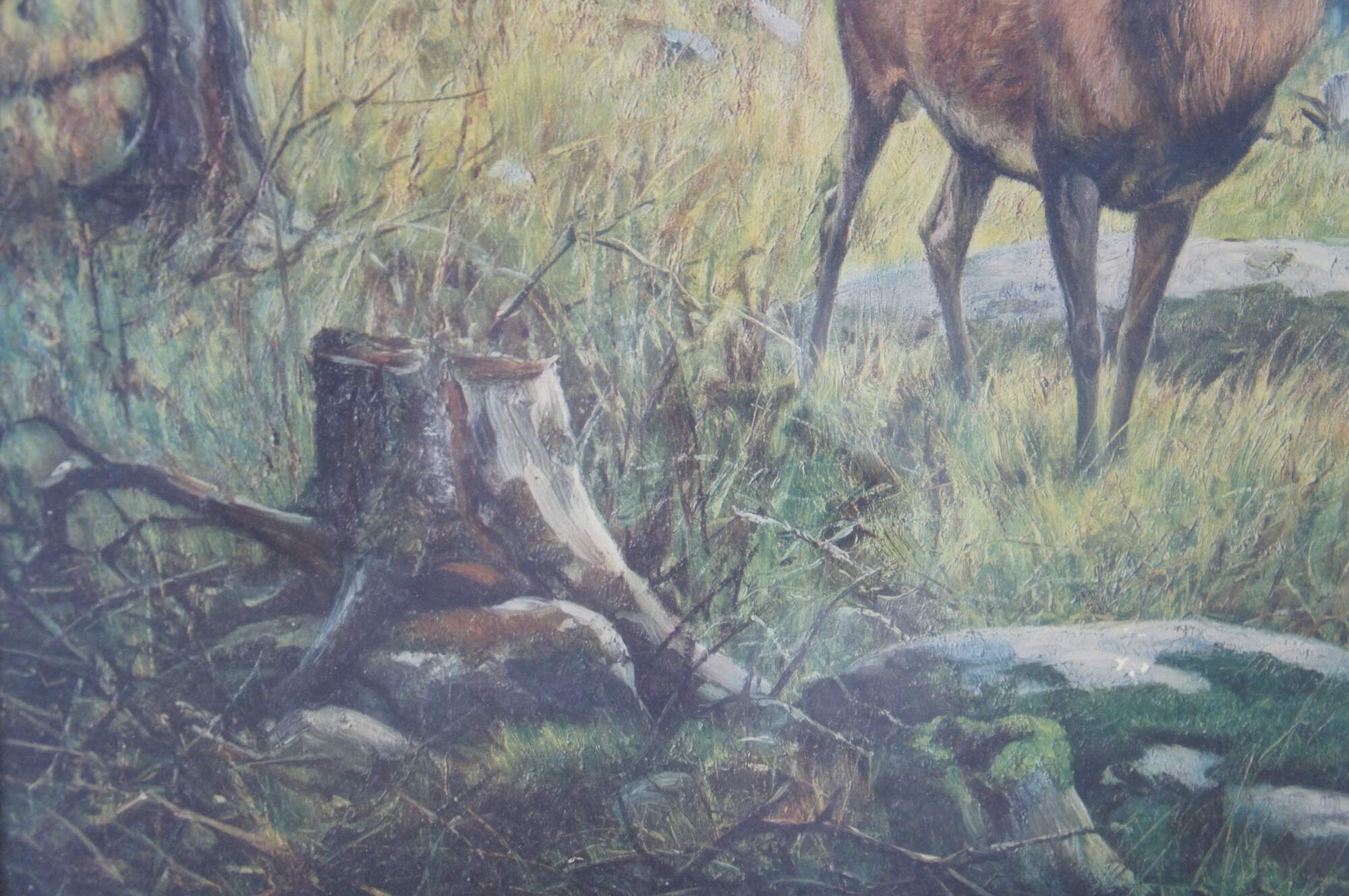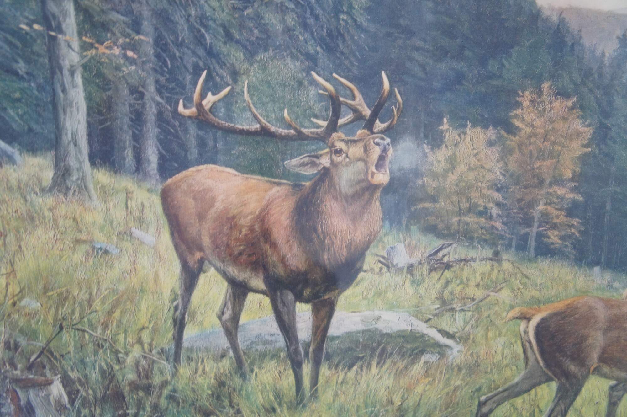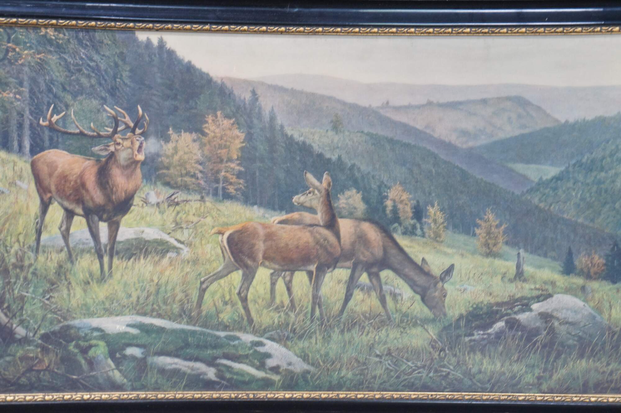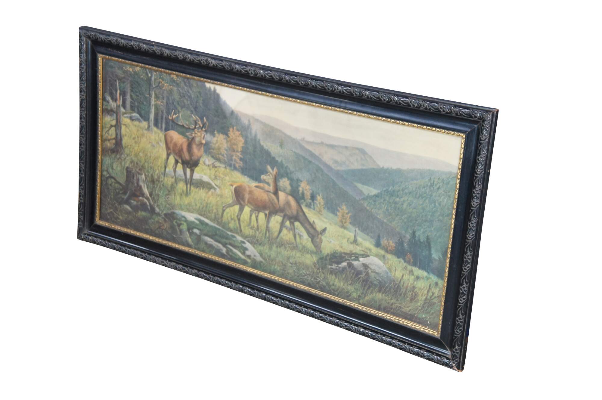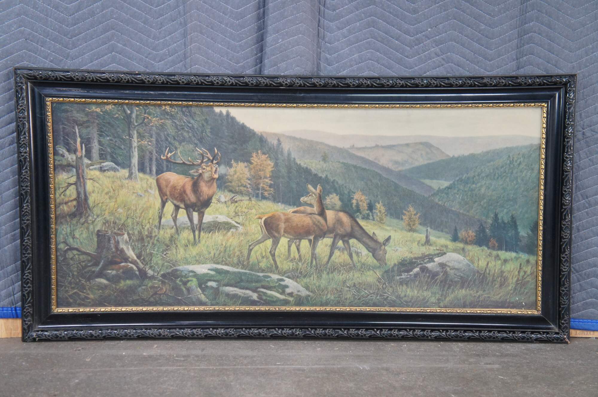 Carl Zimmermann (1863-1930), German Stag / Elk landscape print. Yardlong format, signed in stone along the lower right. Features a stag and two deer on a mountain hillside. The print is framed in a carved black painted frame with gold trim.