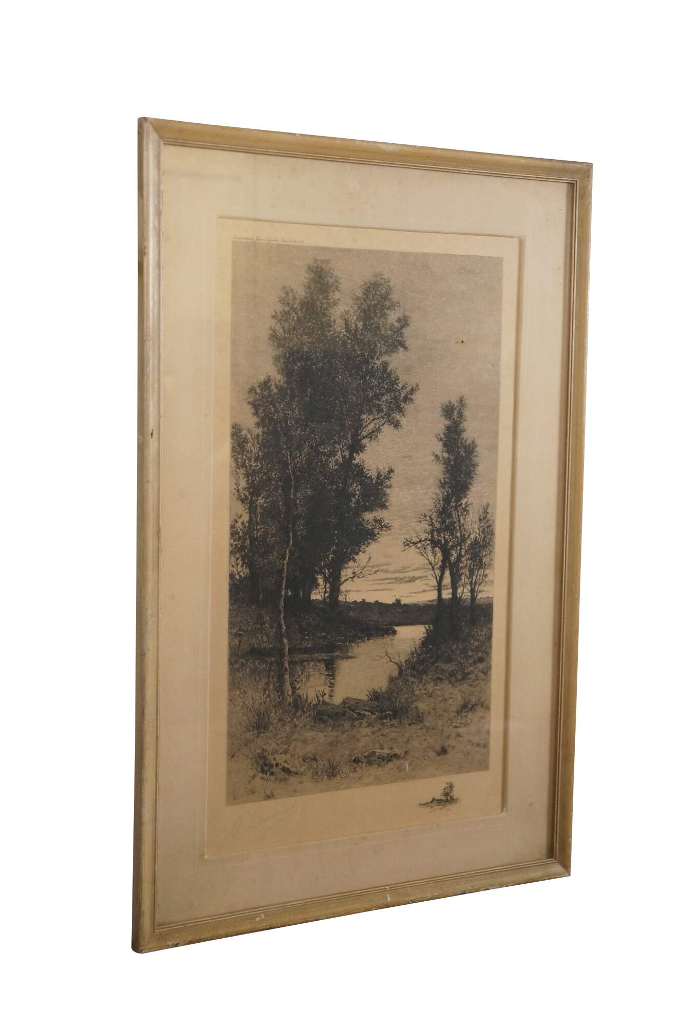Turn of the century black and white etching. Country landscape showing a small pond framed with tall trees. Remarke of a small country landscape, lower edge. Pencil signed by artist, lower left. Published by James Tyroler, New York, 1905. Light colored beveled wood frame; white mat.