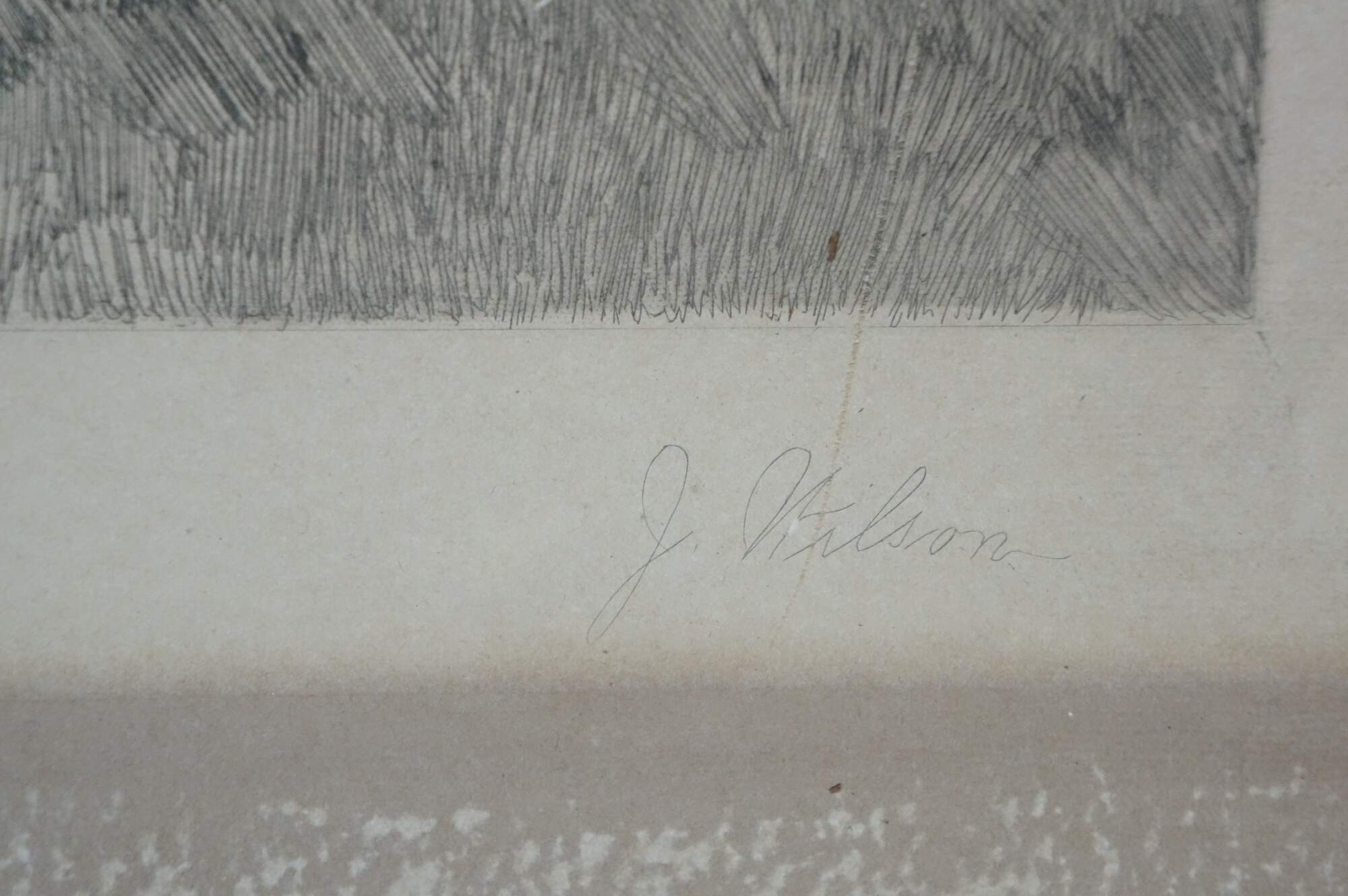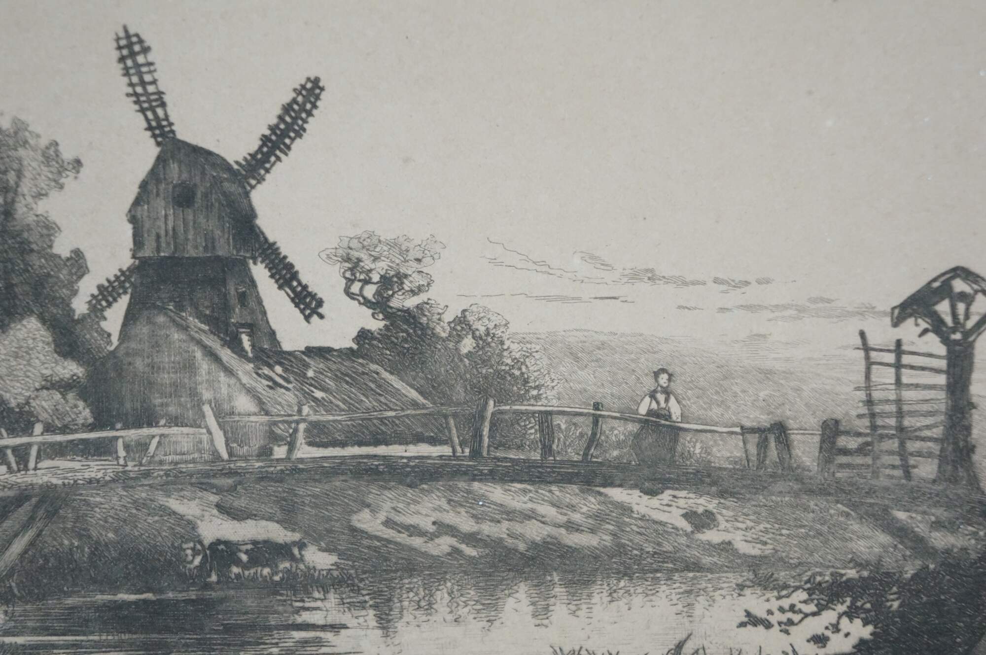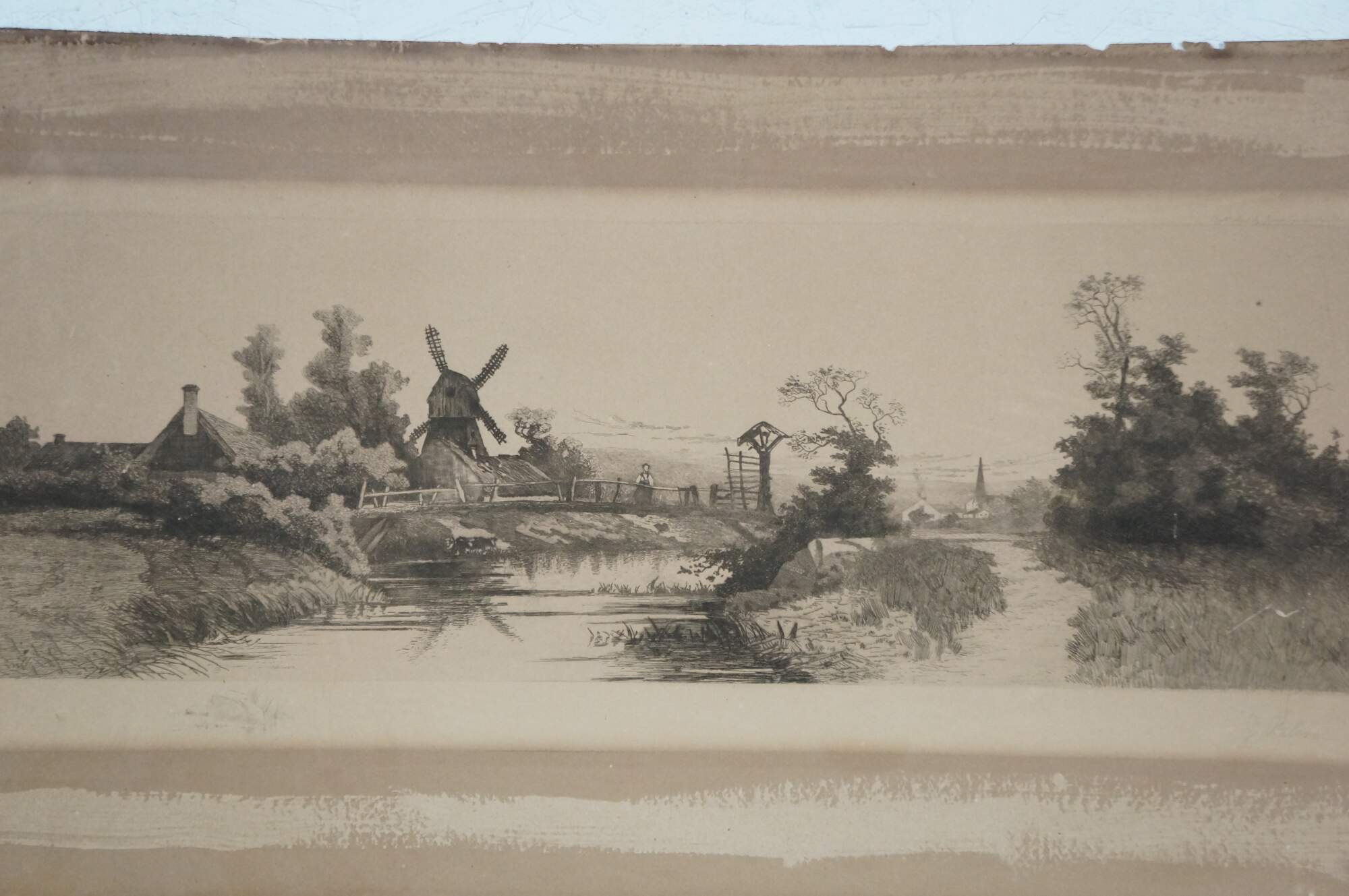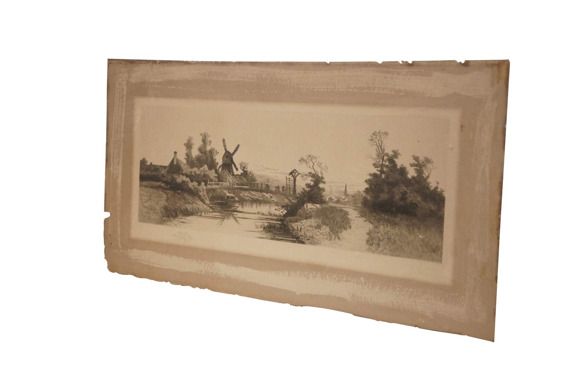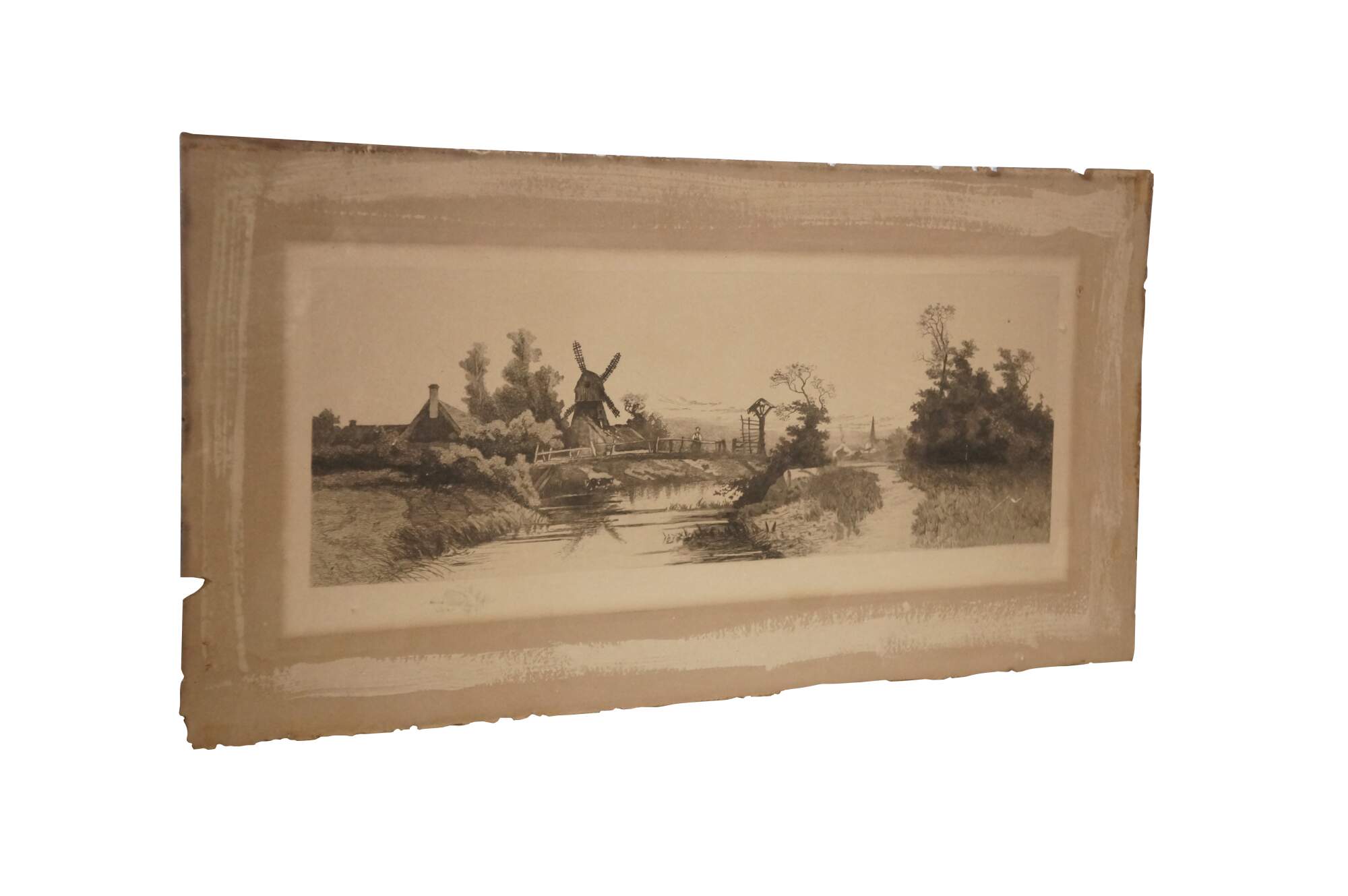 Turn of the century black and white etching. Panoramic Dutch style country landscape showing a bridge over a river at the edge of a country village, with a windmill and figure. Remarke of a stone outcropping, lower edge. Signed in plate, J Wilson, lower right. Published by James Tyroler, New York, 1902. No frame.