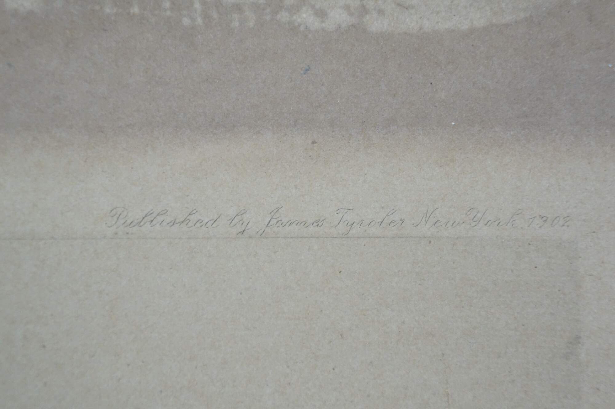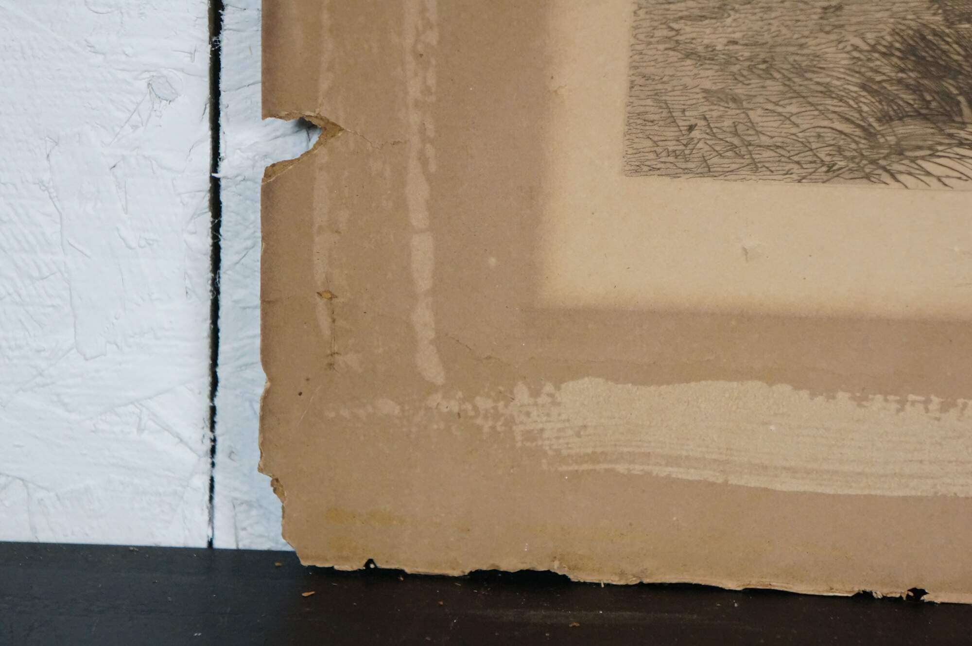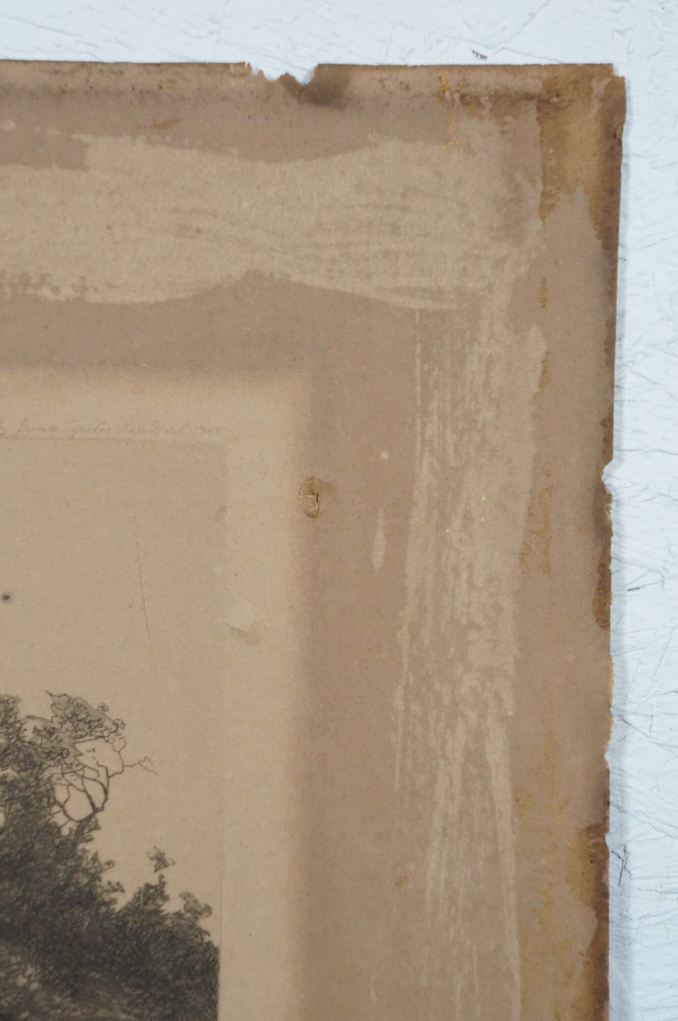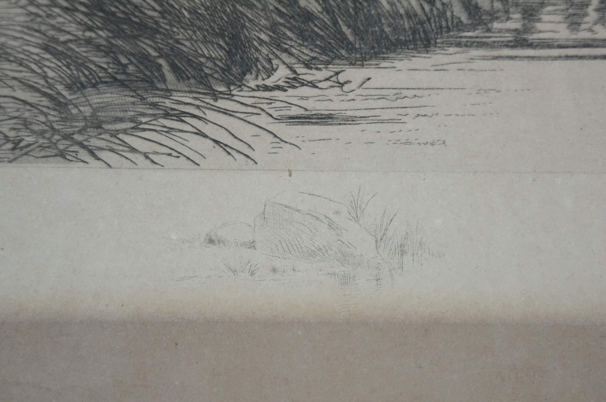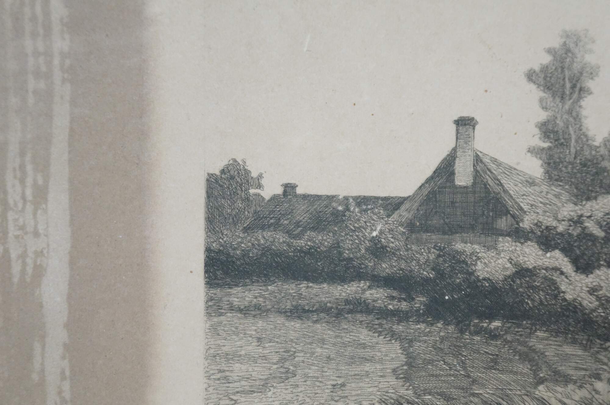 Turn of the century black and white etching. Panoramic Dutch style country landscape showing a bridge over a river at the edge of a country village, with a windmill and figure. Remarke of a stone outcropping, lower edge. Signed in plate, J Wilson, lower right. Published by James Tyroler, New York, 1902. No frame.