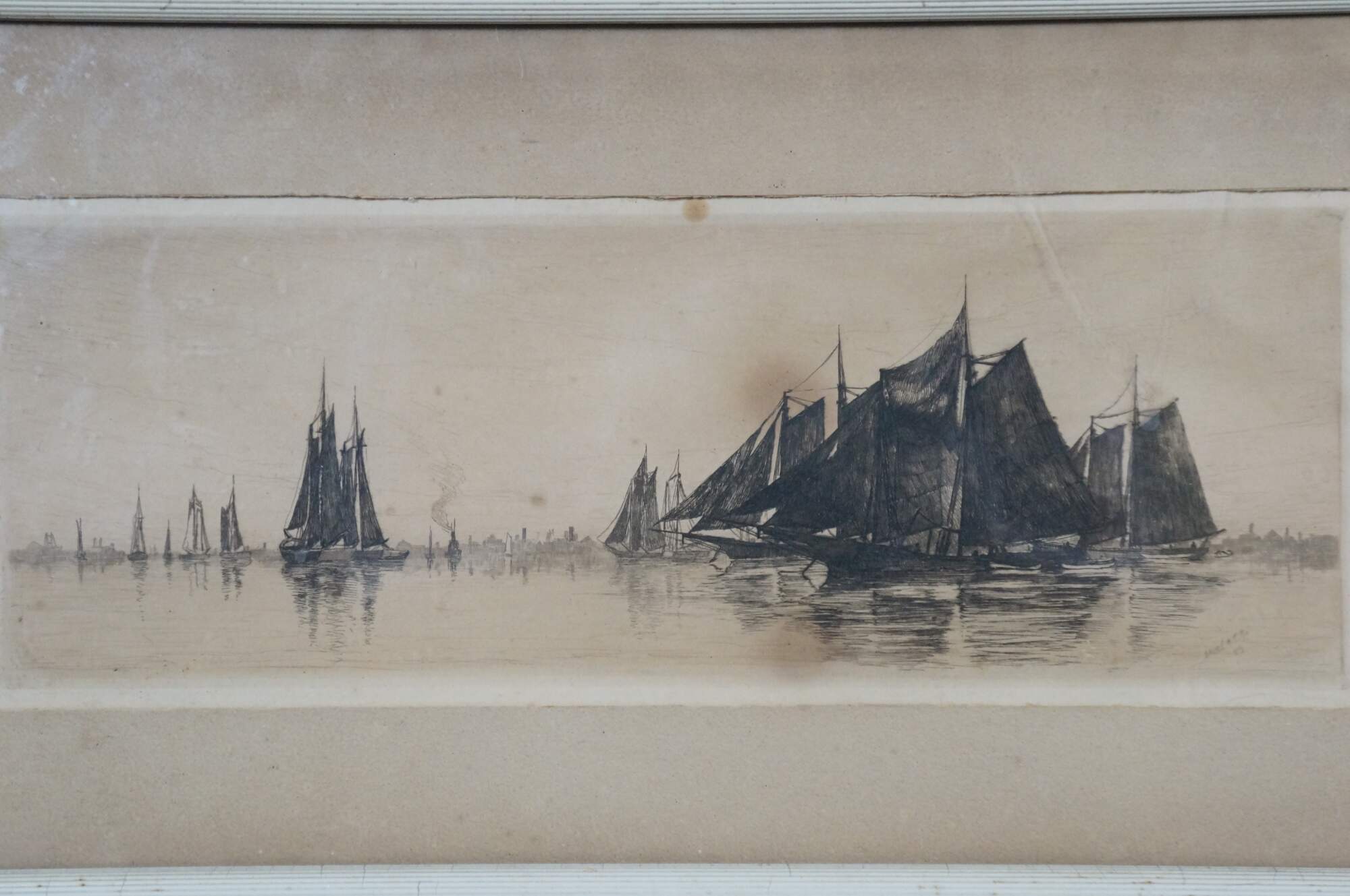 Late 19th century black and white etching by Charles Frederick (aka Karl Friedrich) Mielatz. Nautical landscape of a good many sailboats on water. Signed in plate Mielatz 89. Grooved, rounded, white wood frame; white mat.