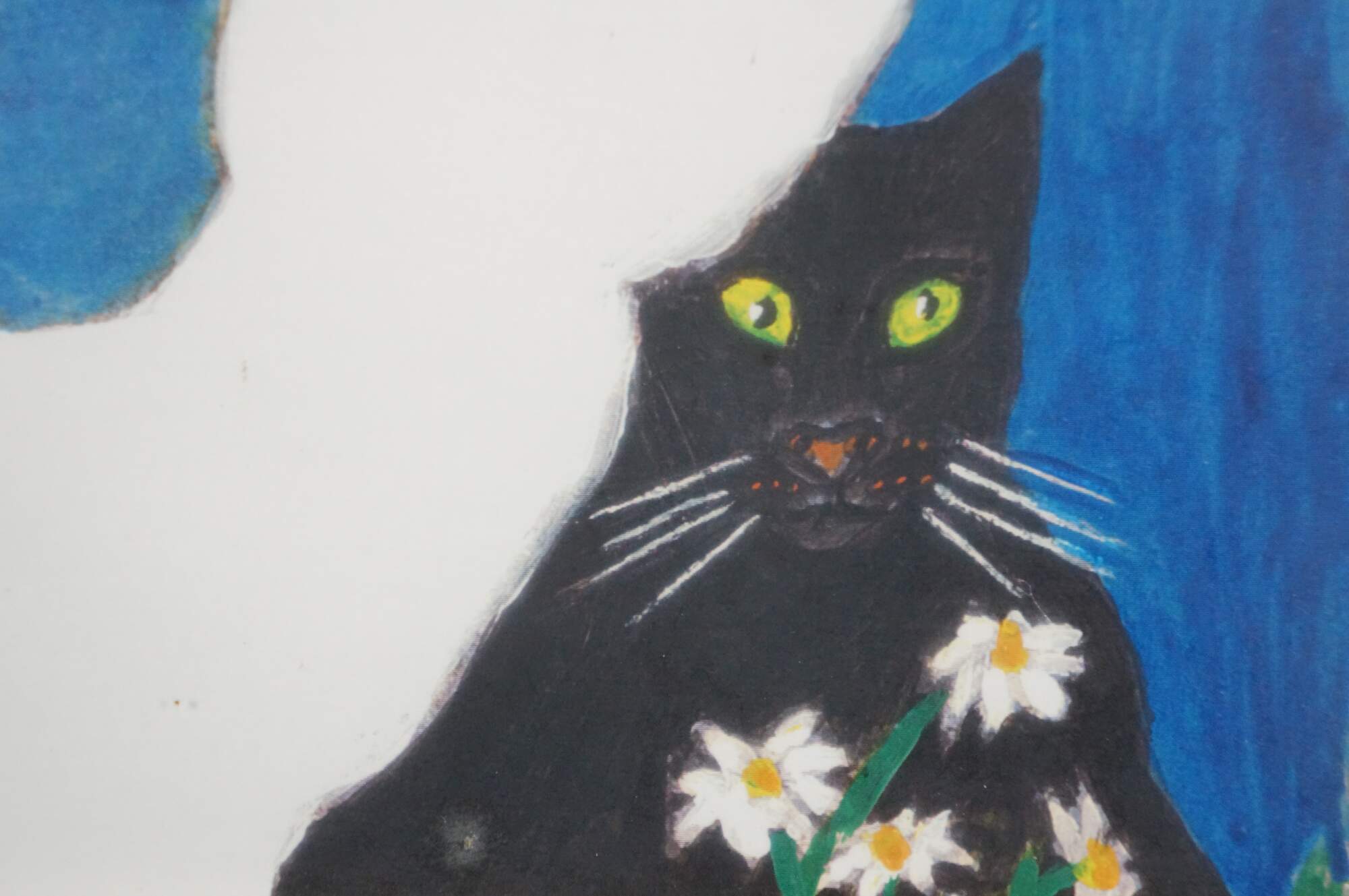 Late 20th century framed triptych of watercolor on paper paintings by Peruvian Folk Artist Elden Rosi - the first showing a golden cat sculpture next to a teapot full of flowers; second, a white kitten chasing a butterfly over the head of a black cat; and third, a gray and white cat seated next to an I Love SF coffee mug in a nighttime landscape featuring the Golden Gate Bridge. First and third signed, lower edge. Black wood frame; white mat.