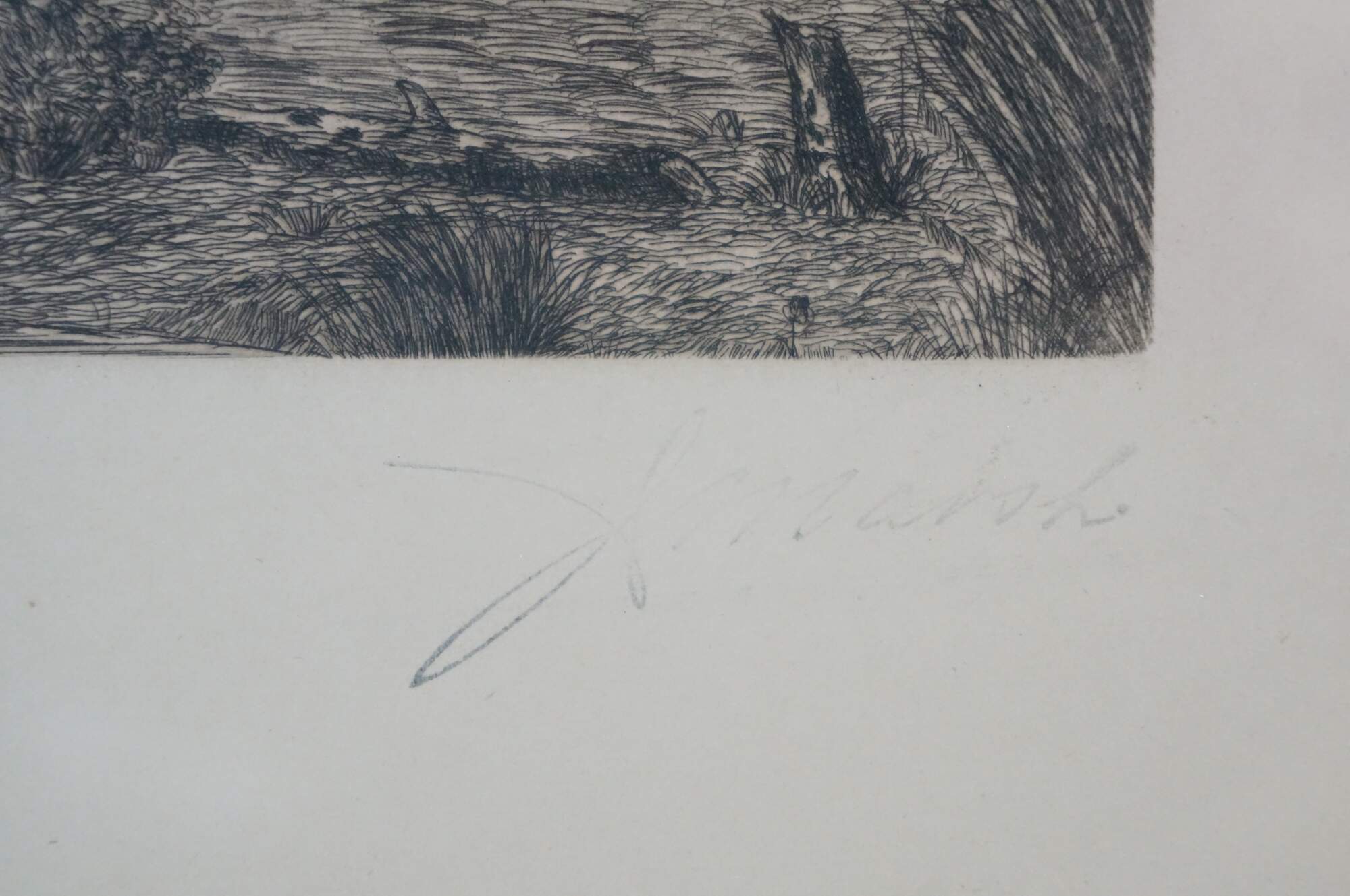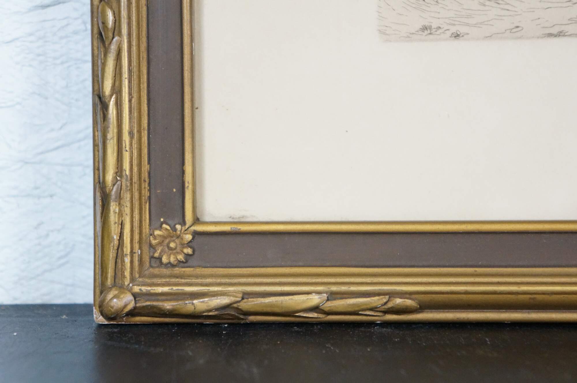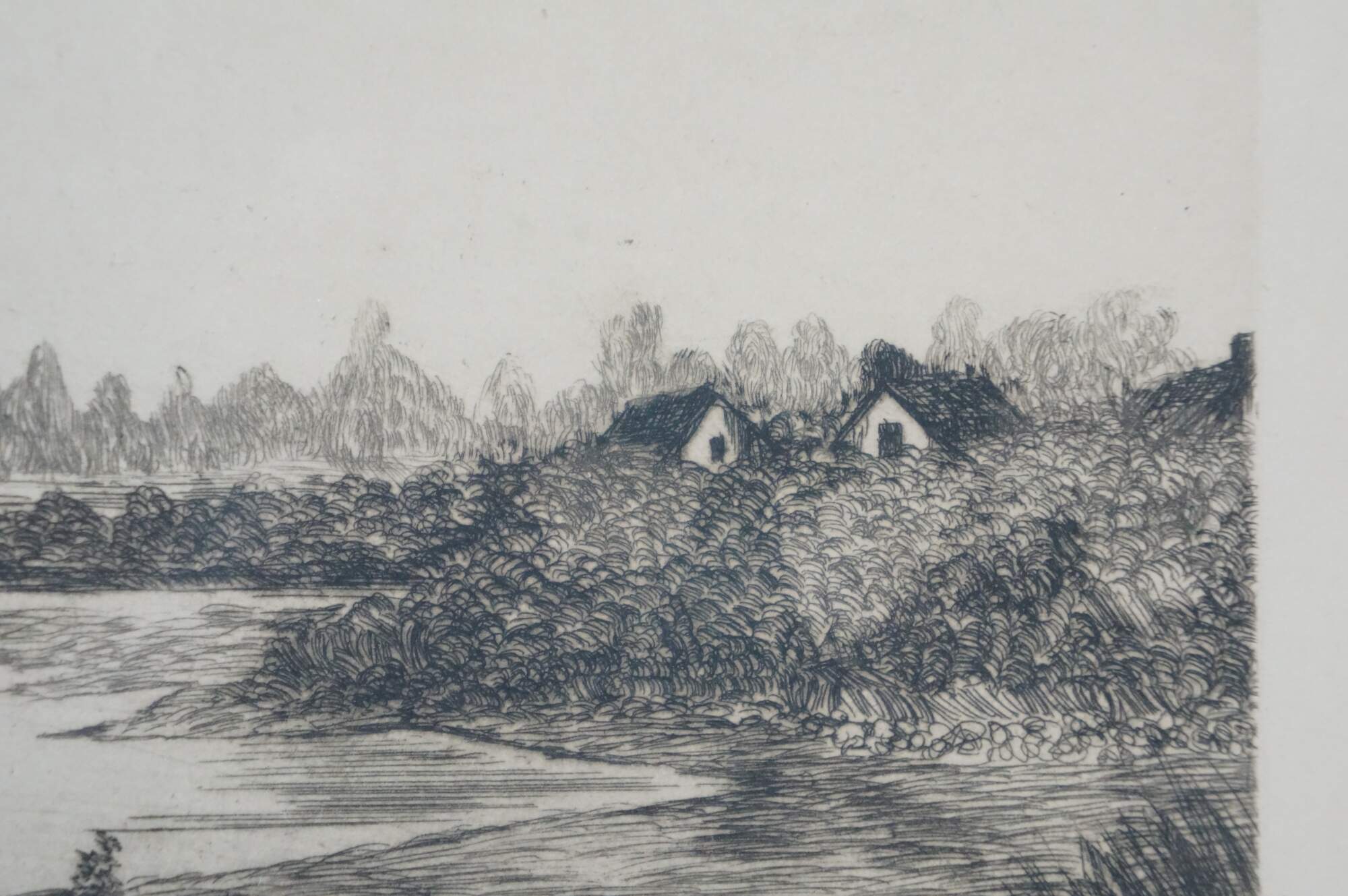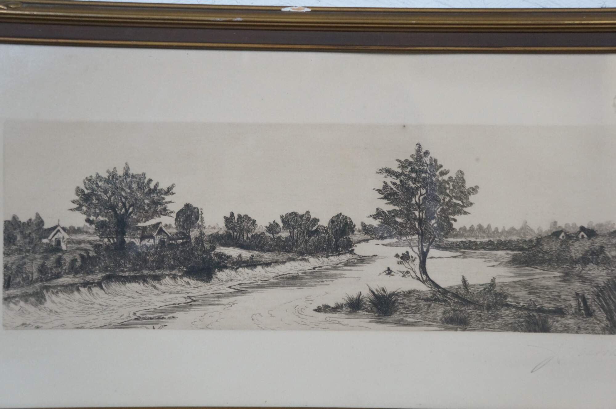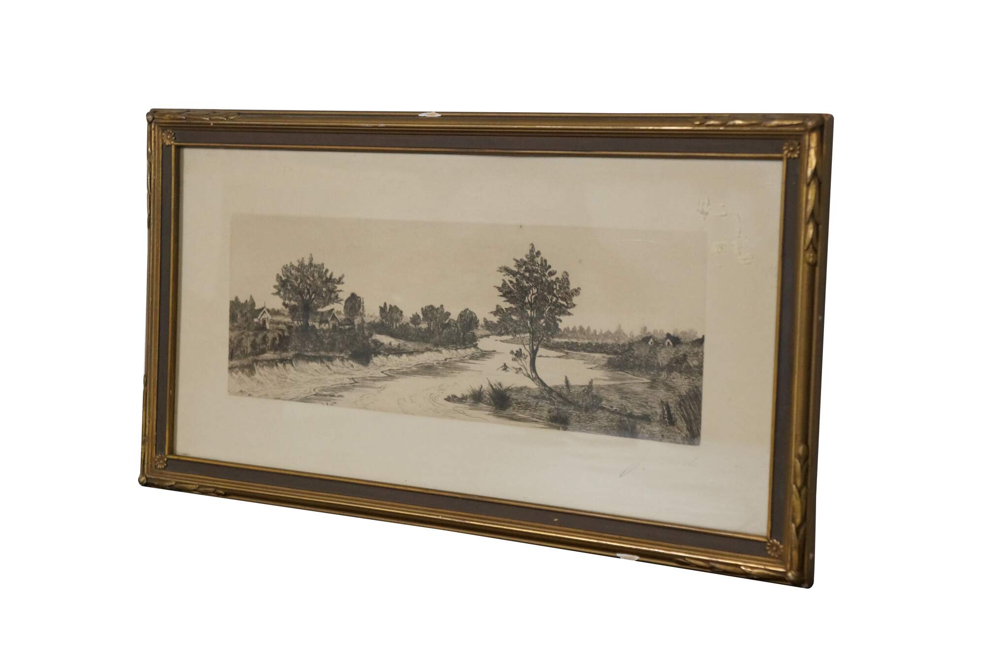 Late 19th to early 20th century black-and-white etching by J. Marsh. Panoramic country riverscape with trees and cottages. Faded signature, lower right. Brown and gilt wood frame with foliate and floral carved corners; no mat.