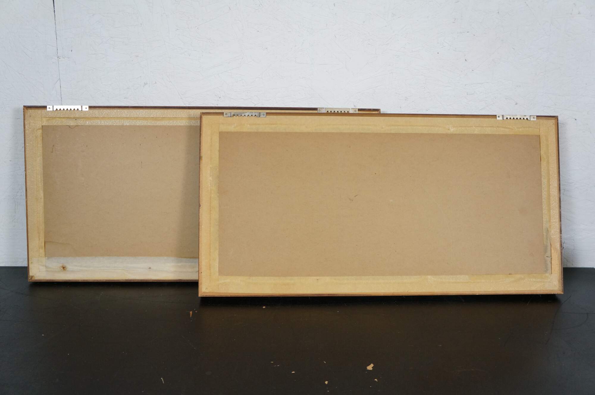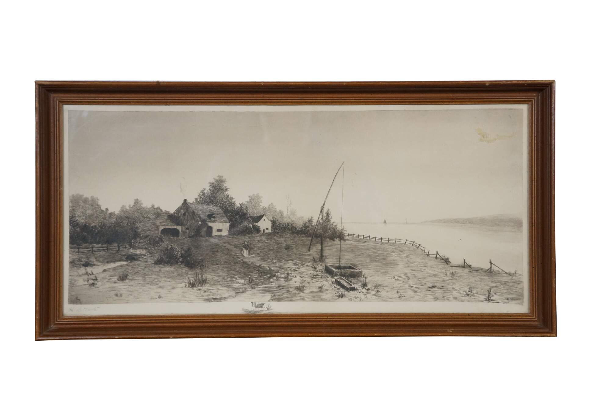 Pair of late 19th to early 20th century black and white etchings by H.B. Harte. A panoramic pair of landscapes that appear to be two sides of the same lake with fishing boats / canoe and cottages. Remarke of a bee over blossoms and of a farmhouse, lower edge. Pencil signed, lower left. Deeply beveled wood frames; no mat.