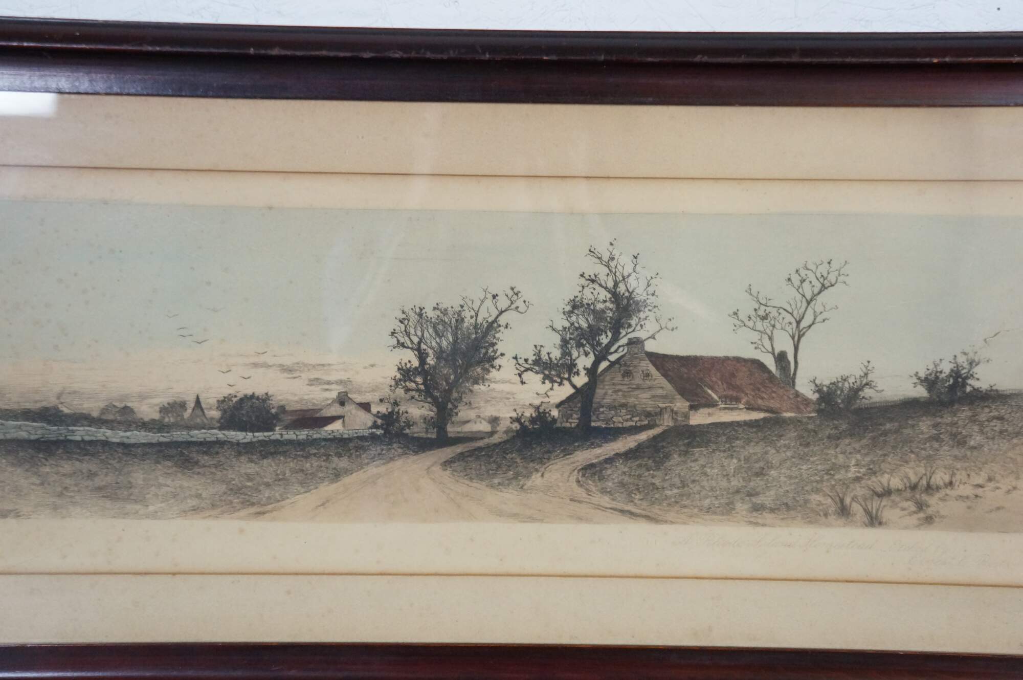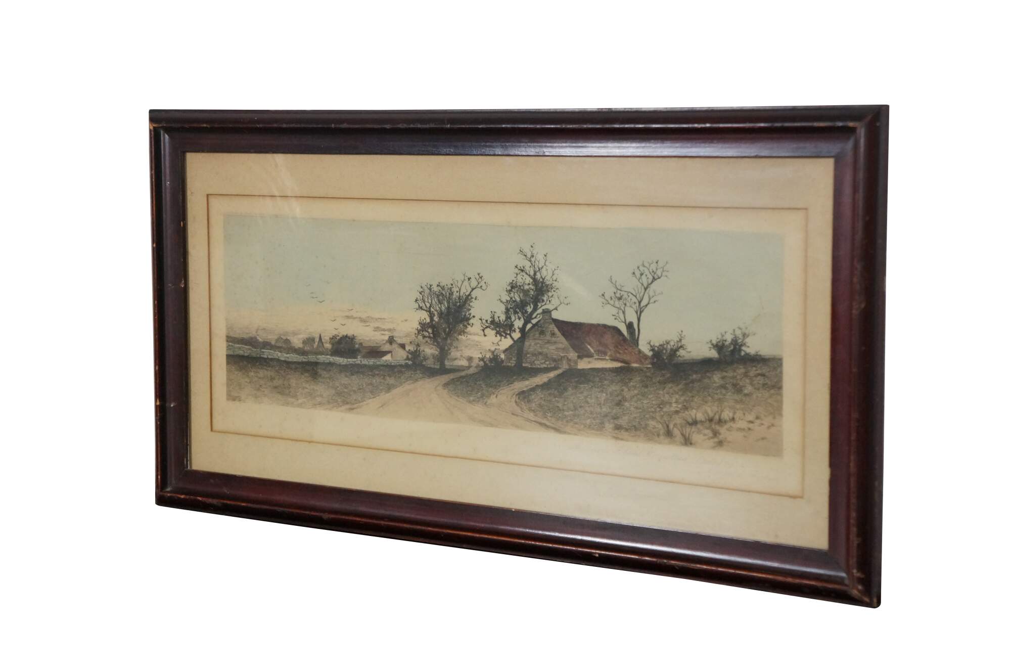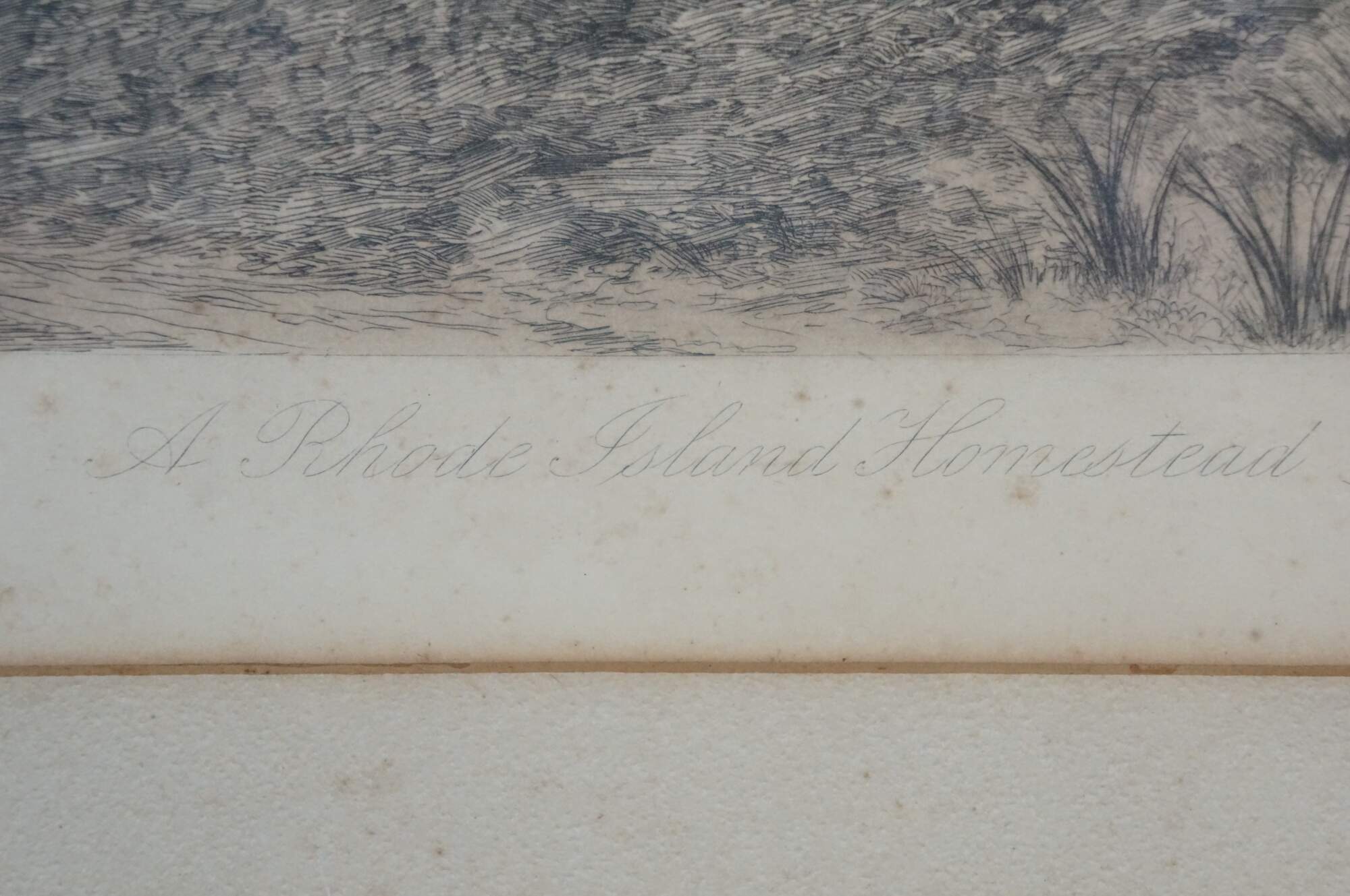 Late 19th century hand-colored etching titled "A Rhode Island Homestead" by Ernest C. Rost. Panoramic landscape of a country road leading to a red-roofed, stone farmhouse. Published by Fishel, Adler & Schwartz, New York. Beveled wood frame; white mat.