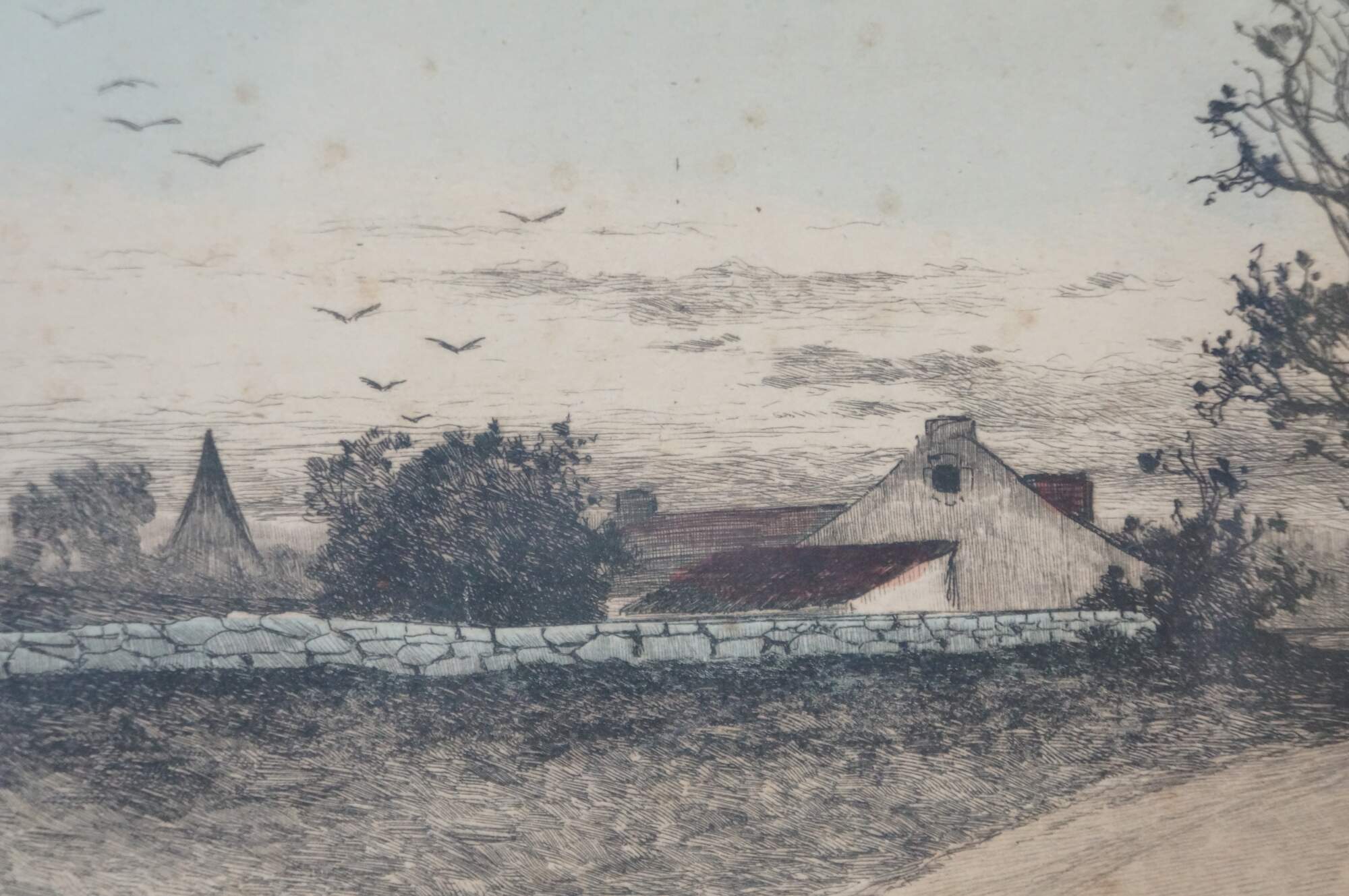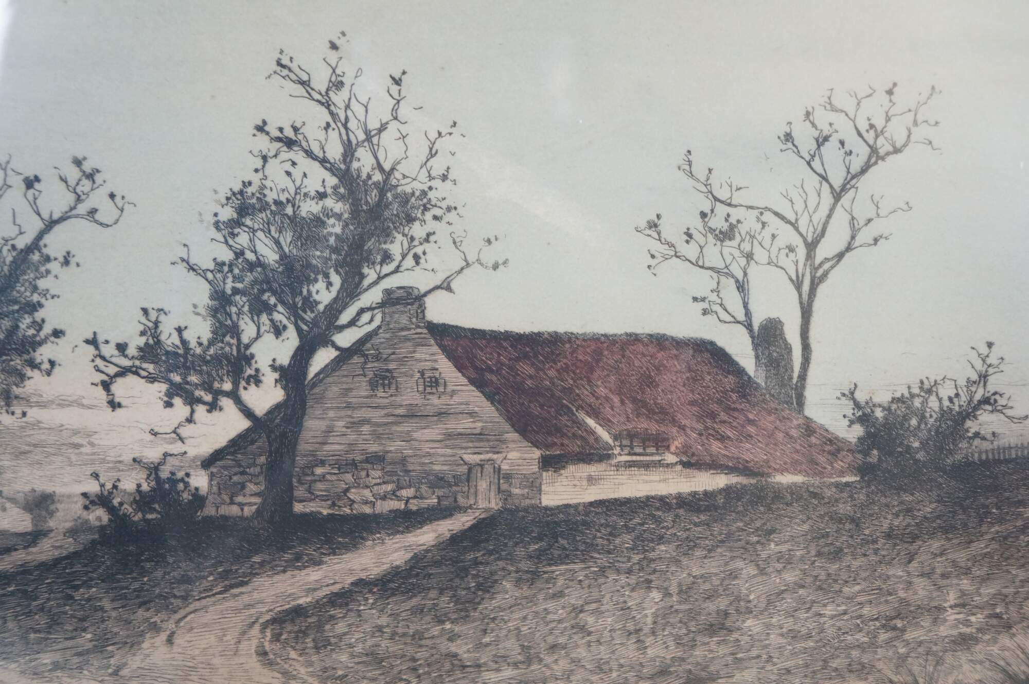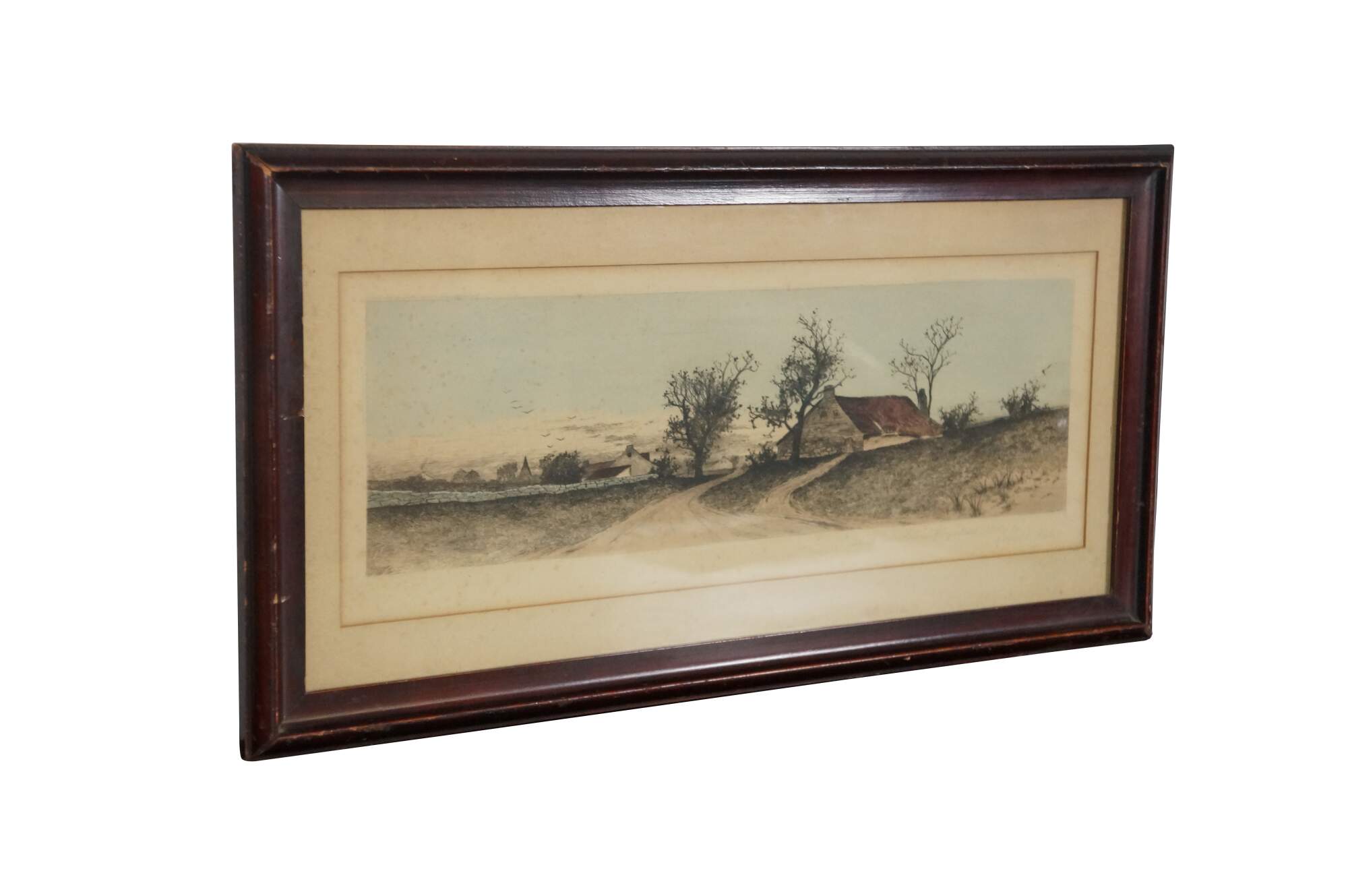 Late 19th century hand-colored etching titled "A Rhode Island Homestead" by Ernest C. Rost. Panoramic landscape of a country road leading to a red-roofed, stone farmhouse. Published by Fishel, Adler & Schwartz, New York. Beveled wood frame; white mat.
