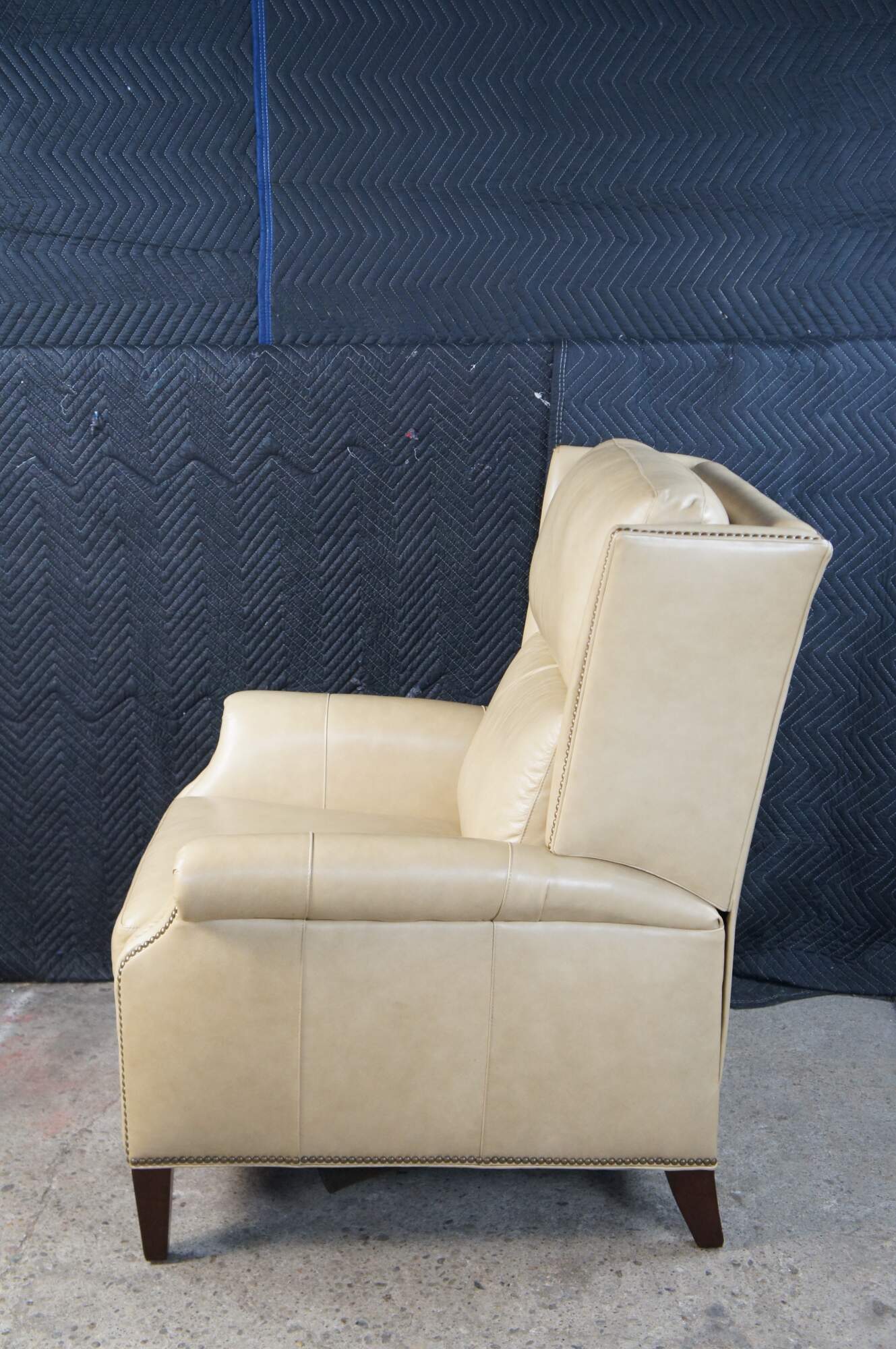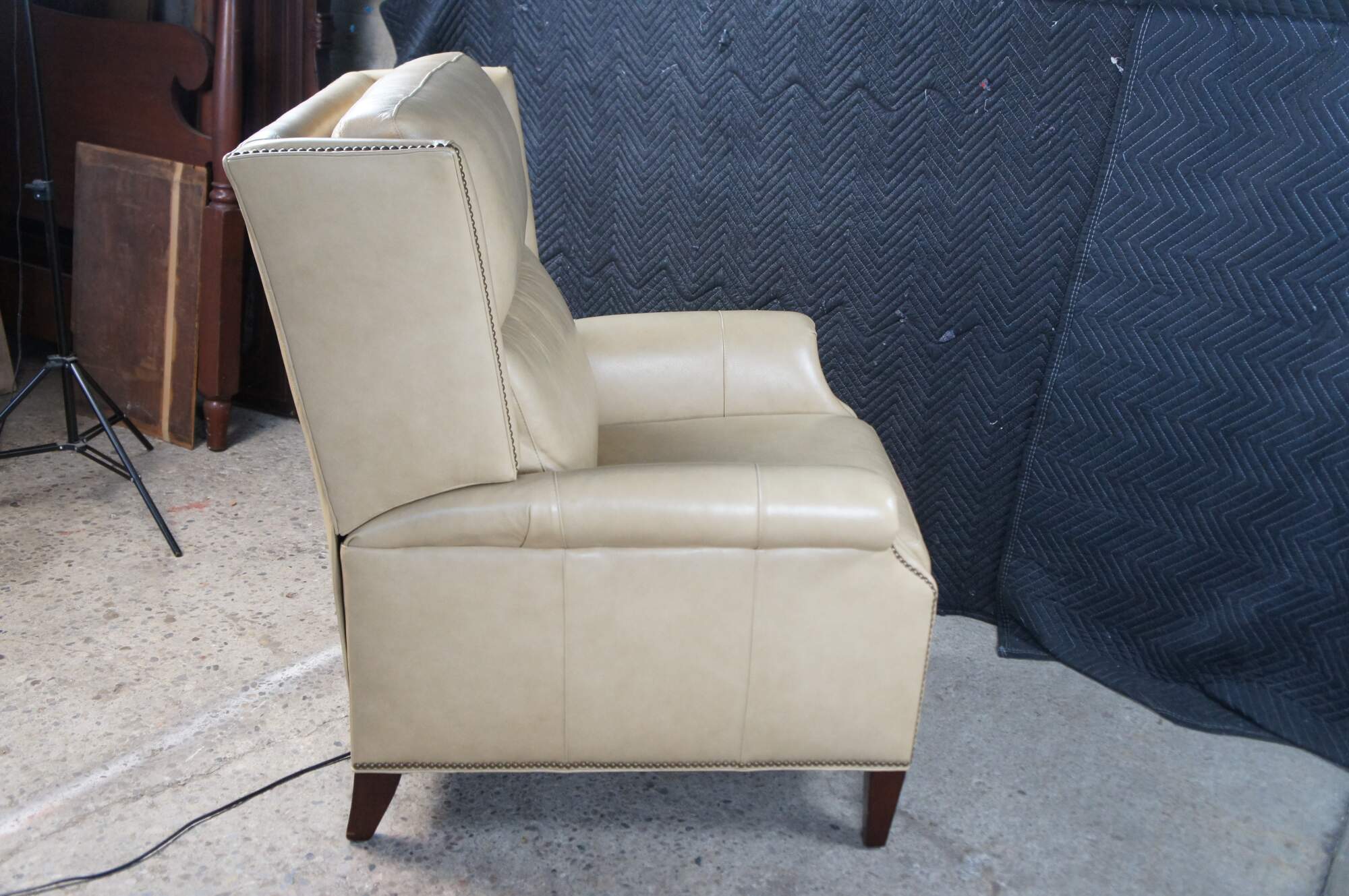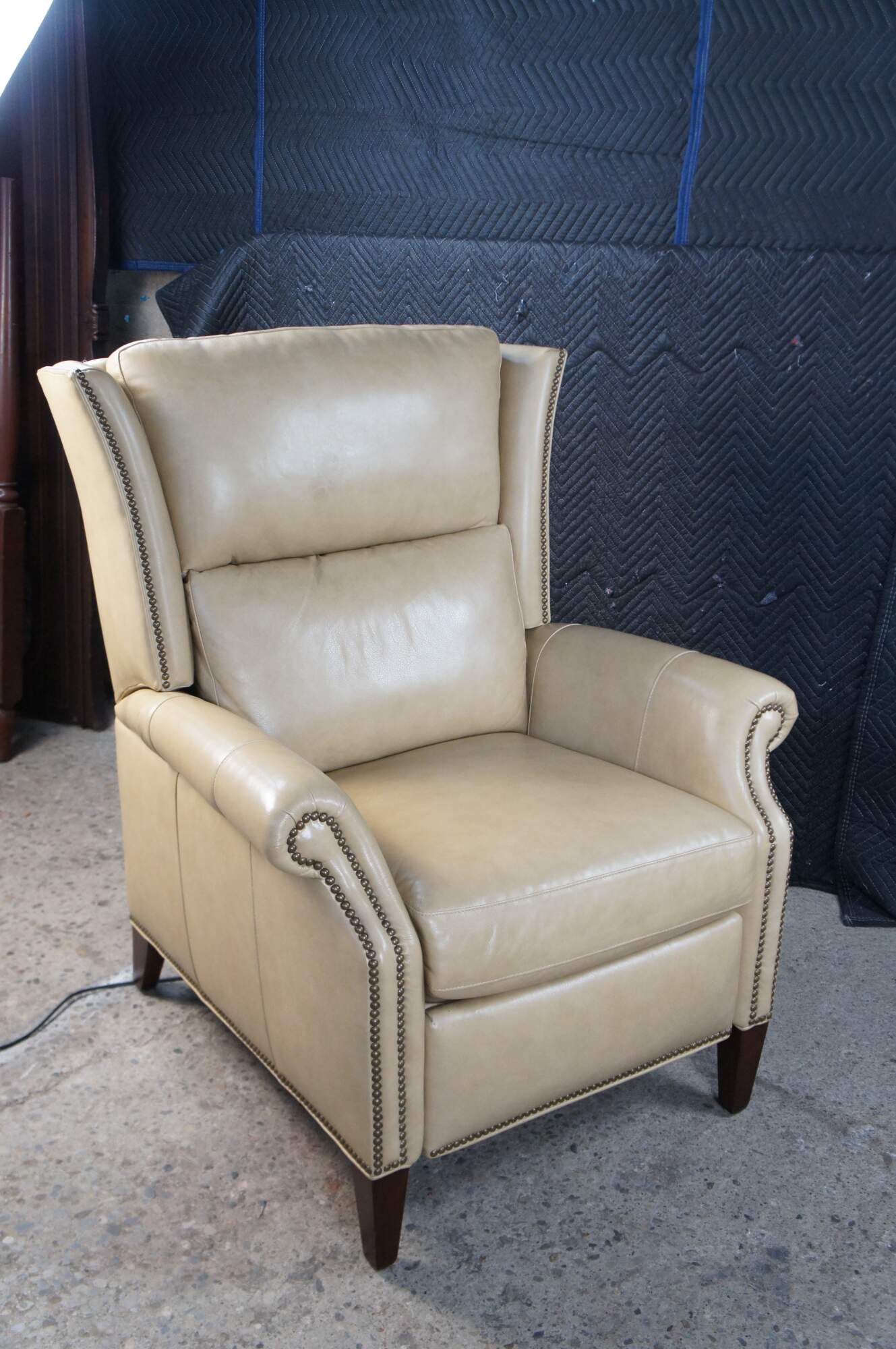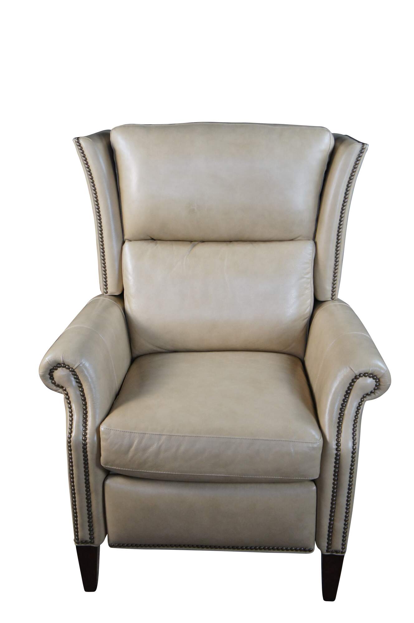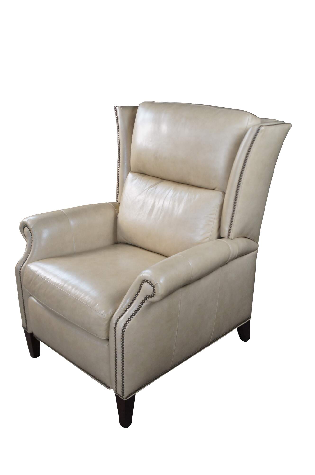 Vintage Hancock and Moore bisque / beige leather power reclining armchair. Handcrafted from top grain leather and special cushioning carefully selected to retain it's shape while remaining soft and comfortable, the Sami Recliner makes a refined and powerful statement. Luxurious bustle back for the ultimate comfort experience. Rolled arms, nail trimmed finish and tapered legs. Handmade in America.