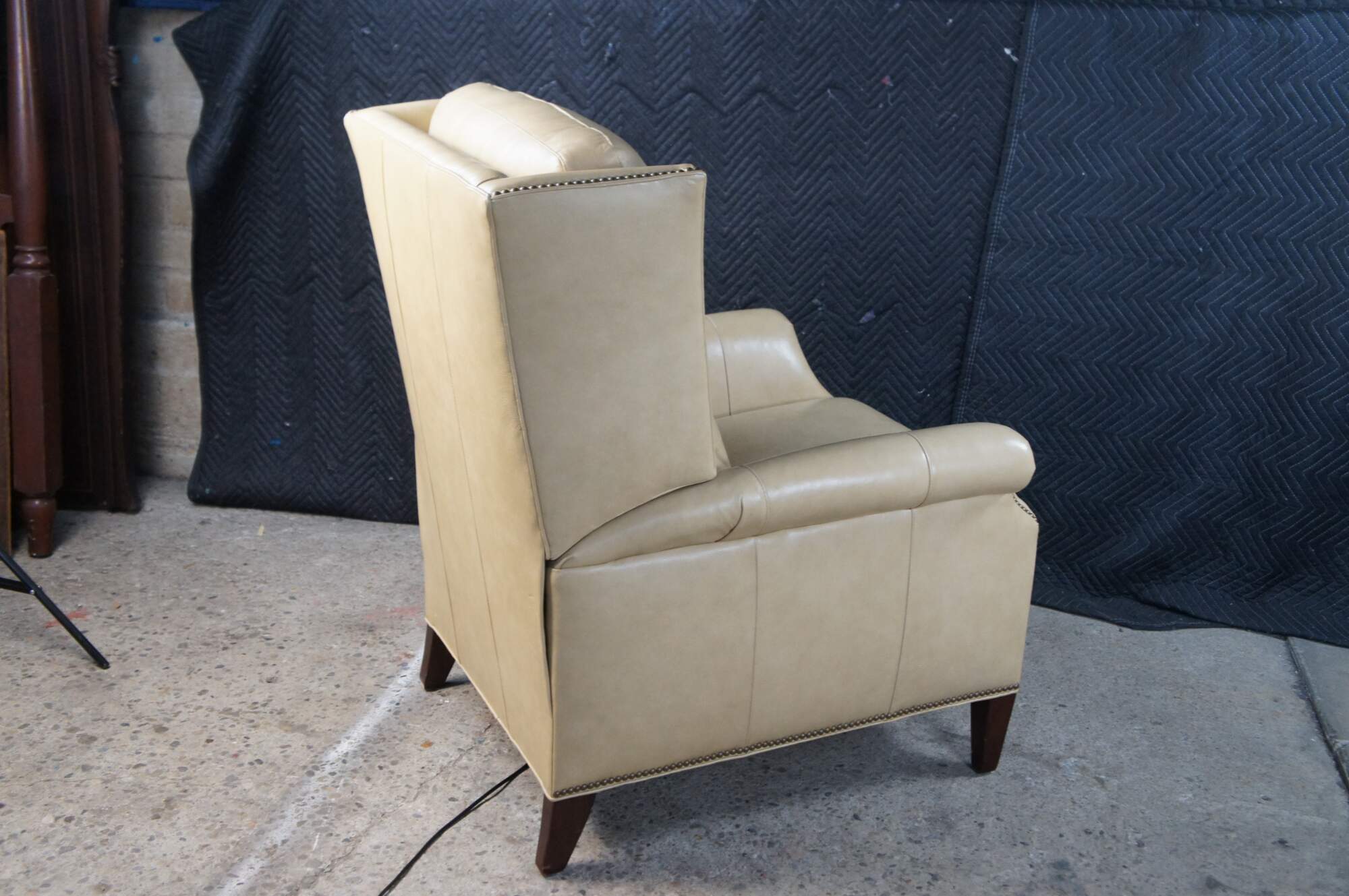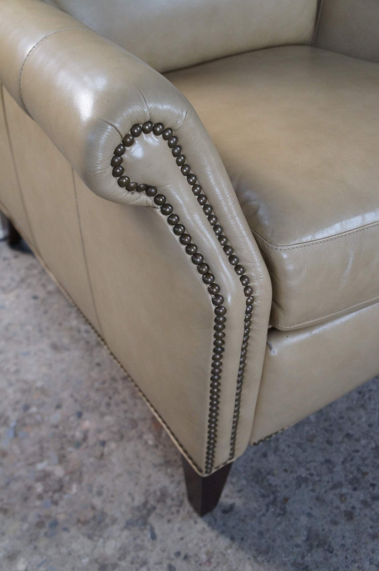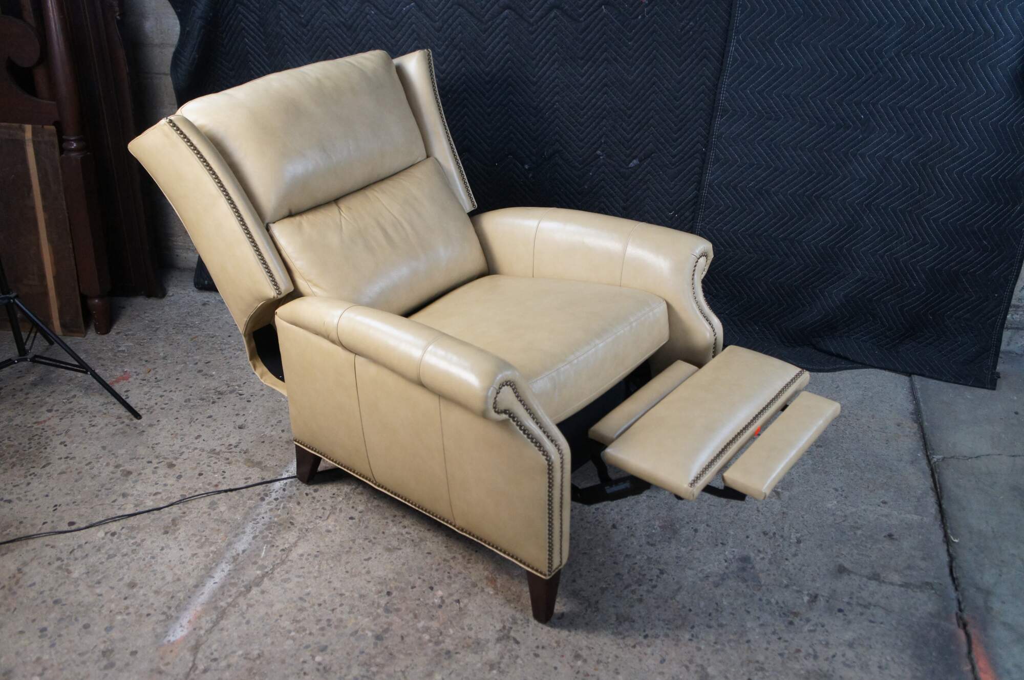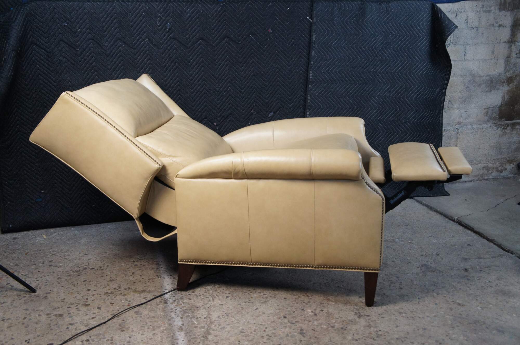 Vintage Hancock and Moore bisque / beige leather power reclining armchair. Handcrafted from top grain leather and special cushioning carefully selected to retain it's shape while remaining soft and comfortable, the Sami Recliner makes a refined and powerful statement. Luxurious bustle back for the ultimate comfort experience. Rolled arms, nail trimmed finish and tapered legs. Handmade in America.