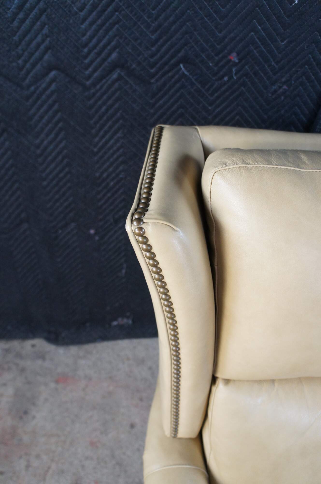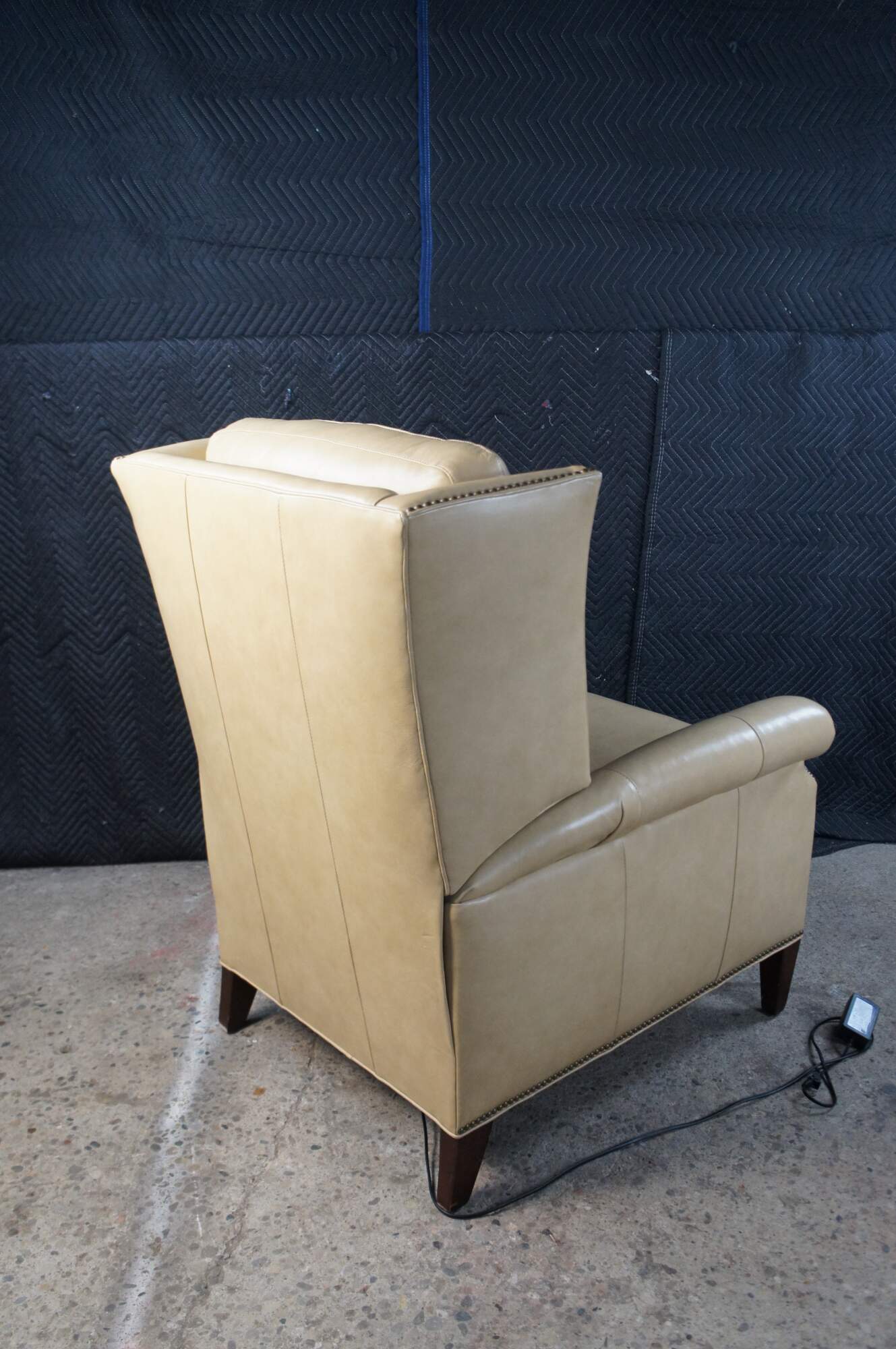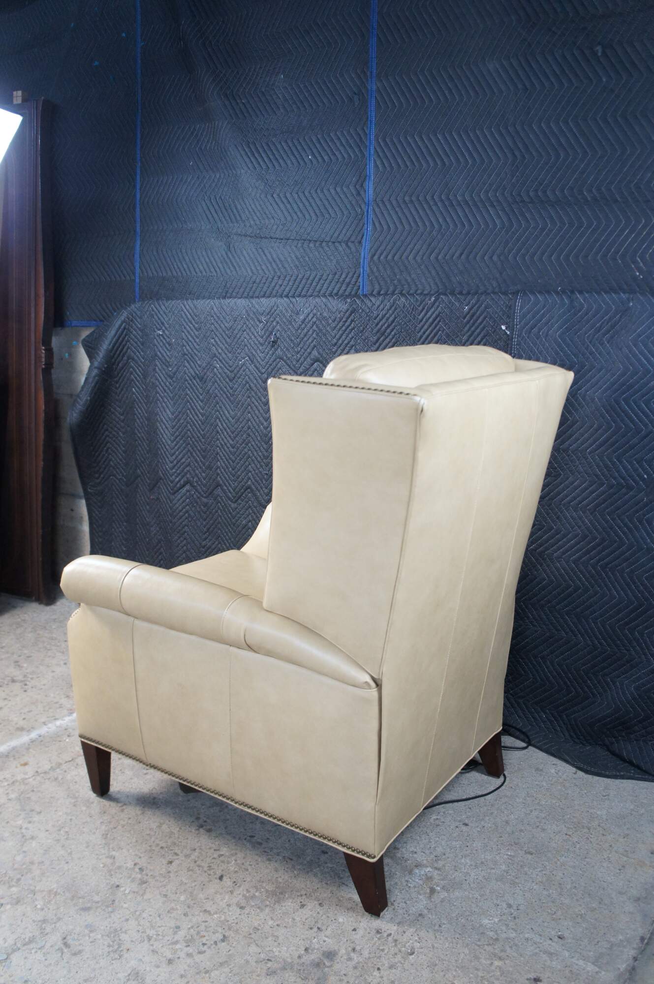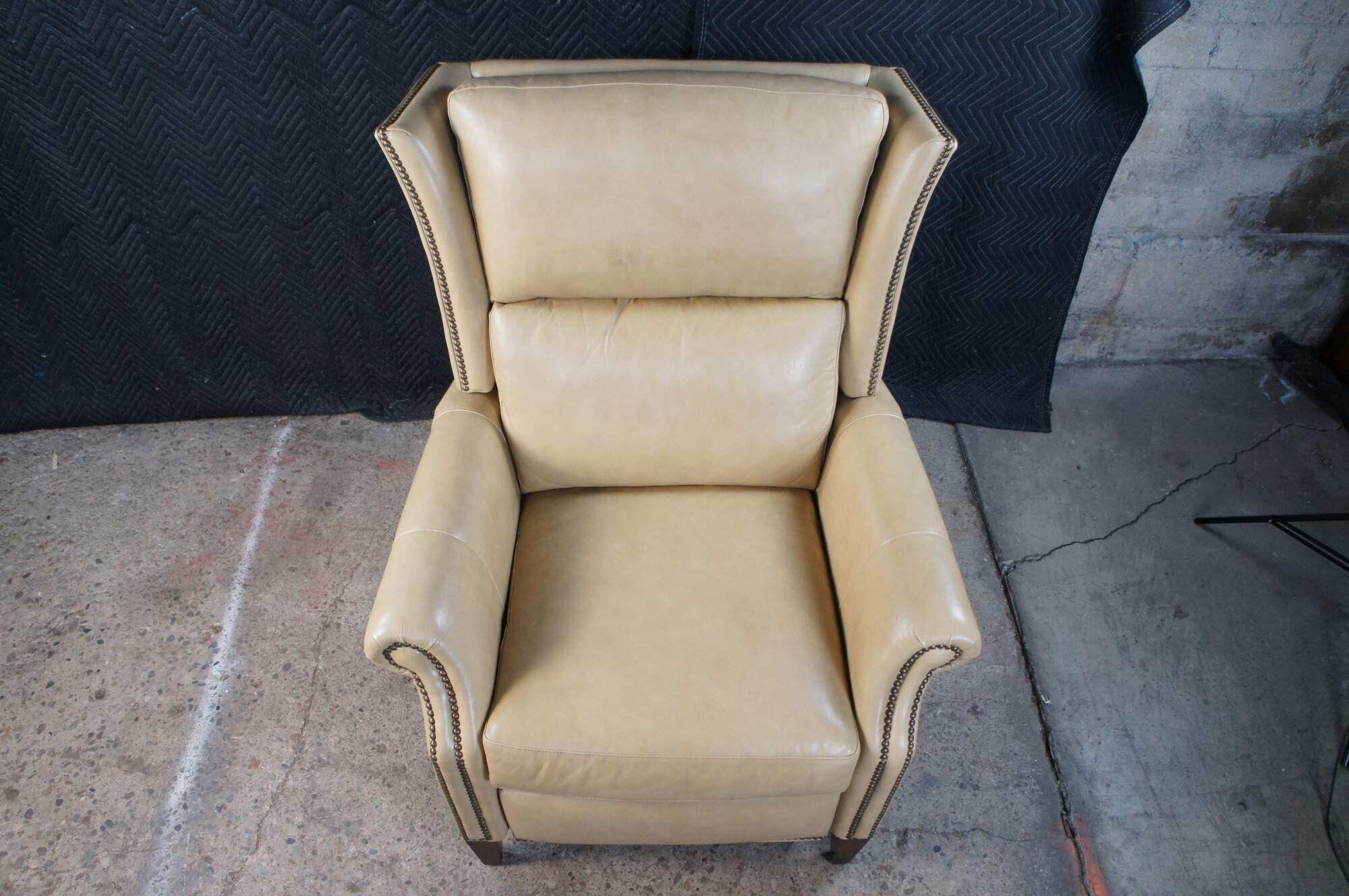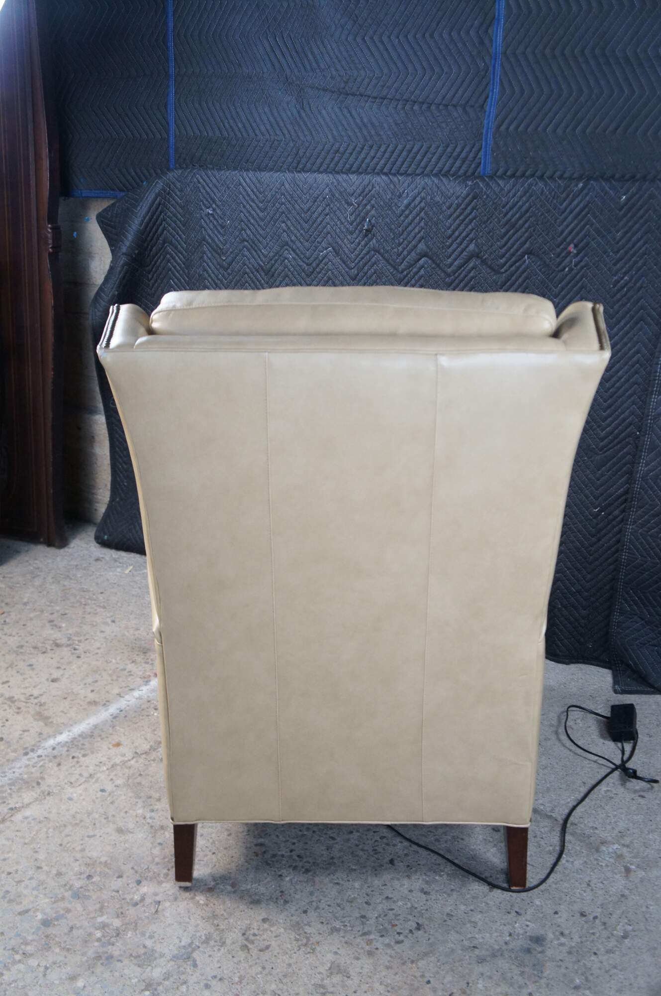Vintage Hancock and Moore bisque / beige leather power reclining armchair. Handcrafted from top grain leather and special cushioning carefully selected to retain it's shape while remaining soft and comfortable, the Sami Recliner makes a refined and powerful statement. Luxurious bustle back for the ultimate comfort experience. Rolled arms, nail trimmed finish and tapered legs. Handmade in America.