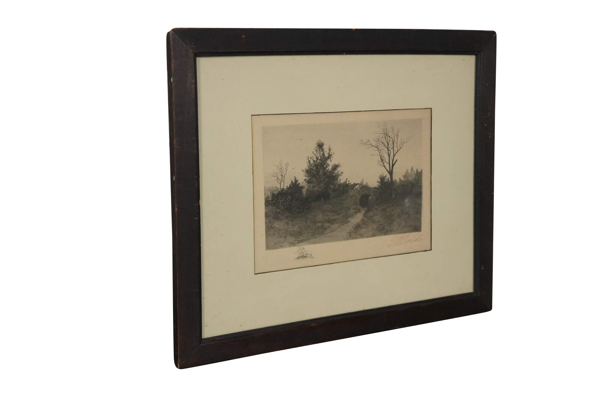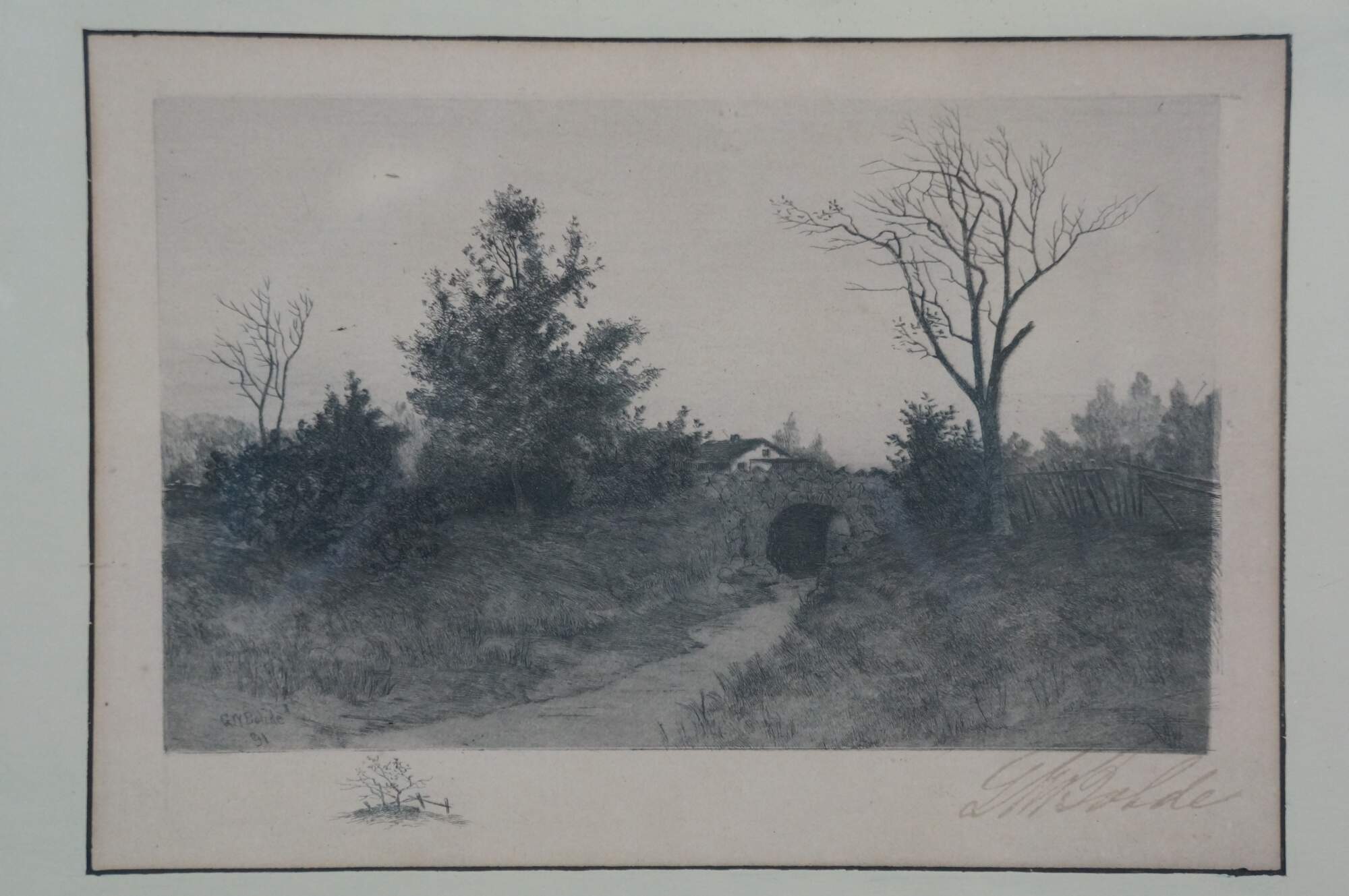 Late 19th century black and white etching by George William Bohde (American, 1870-1939). Country landscape showing of a stone bridge over a small creek with a cottage / house in the background. Signed in plate GW Bohde 91, lower left. Remarke of a tree and fence, lower left edge. signed in ink, lower right edge. Wood frame; white mat.
