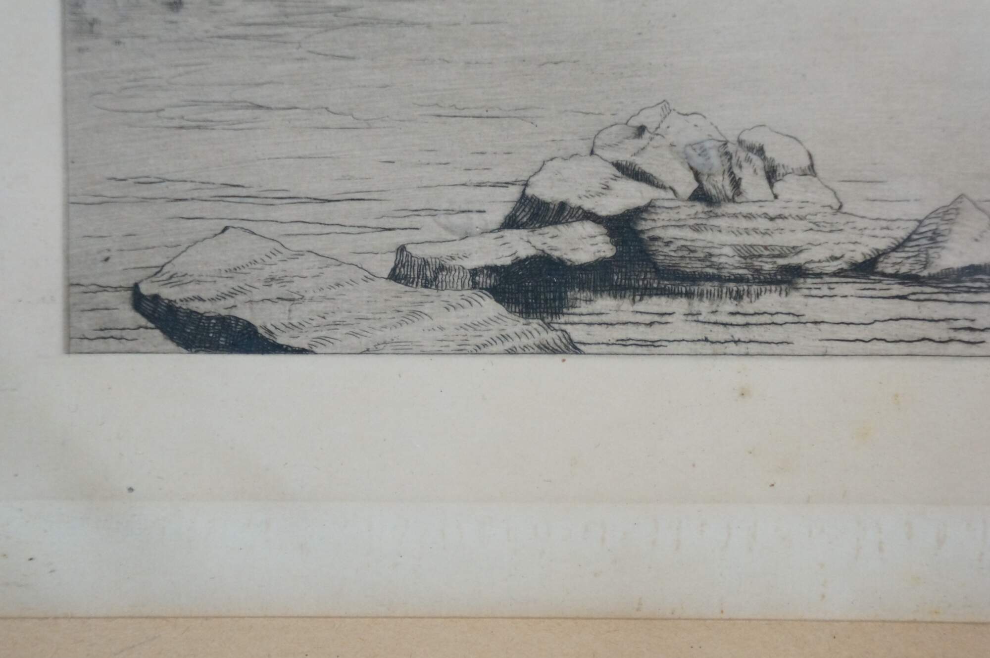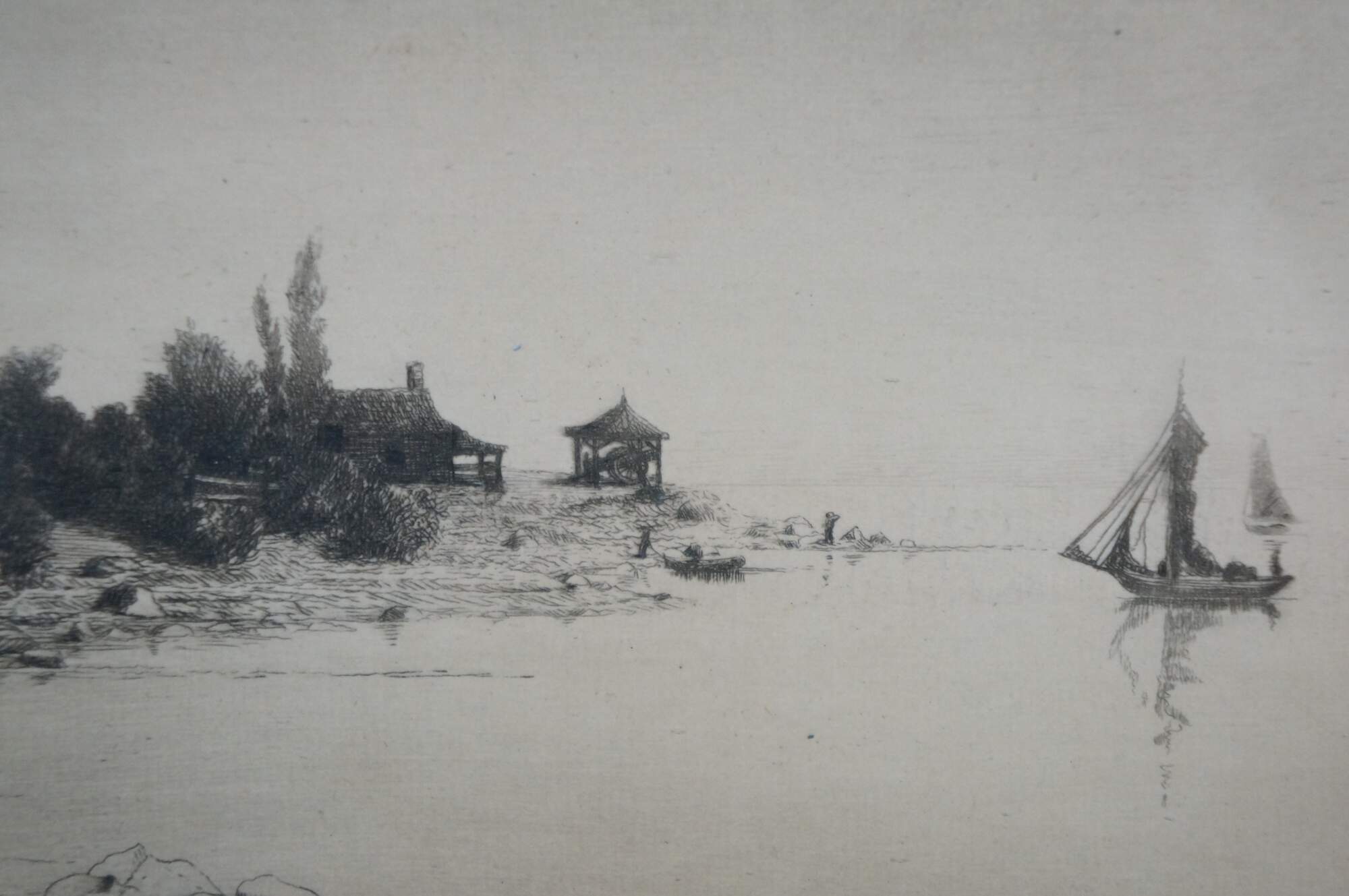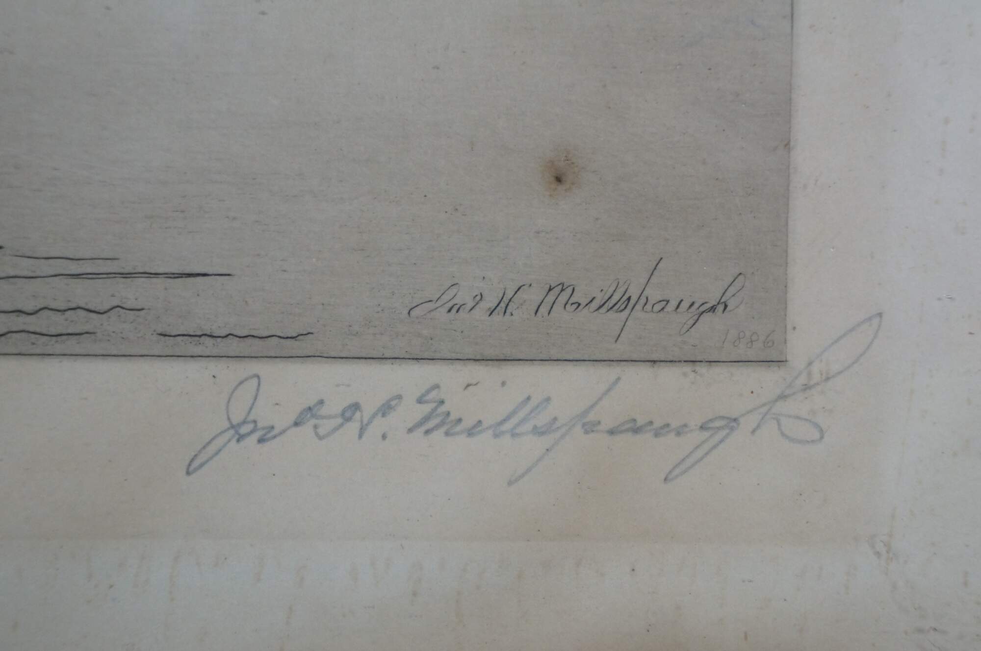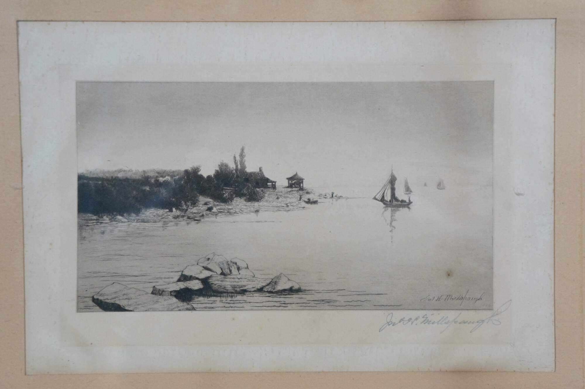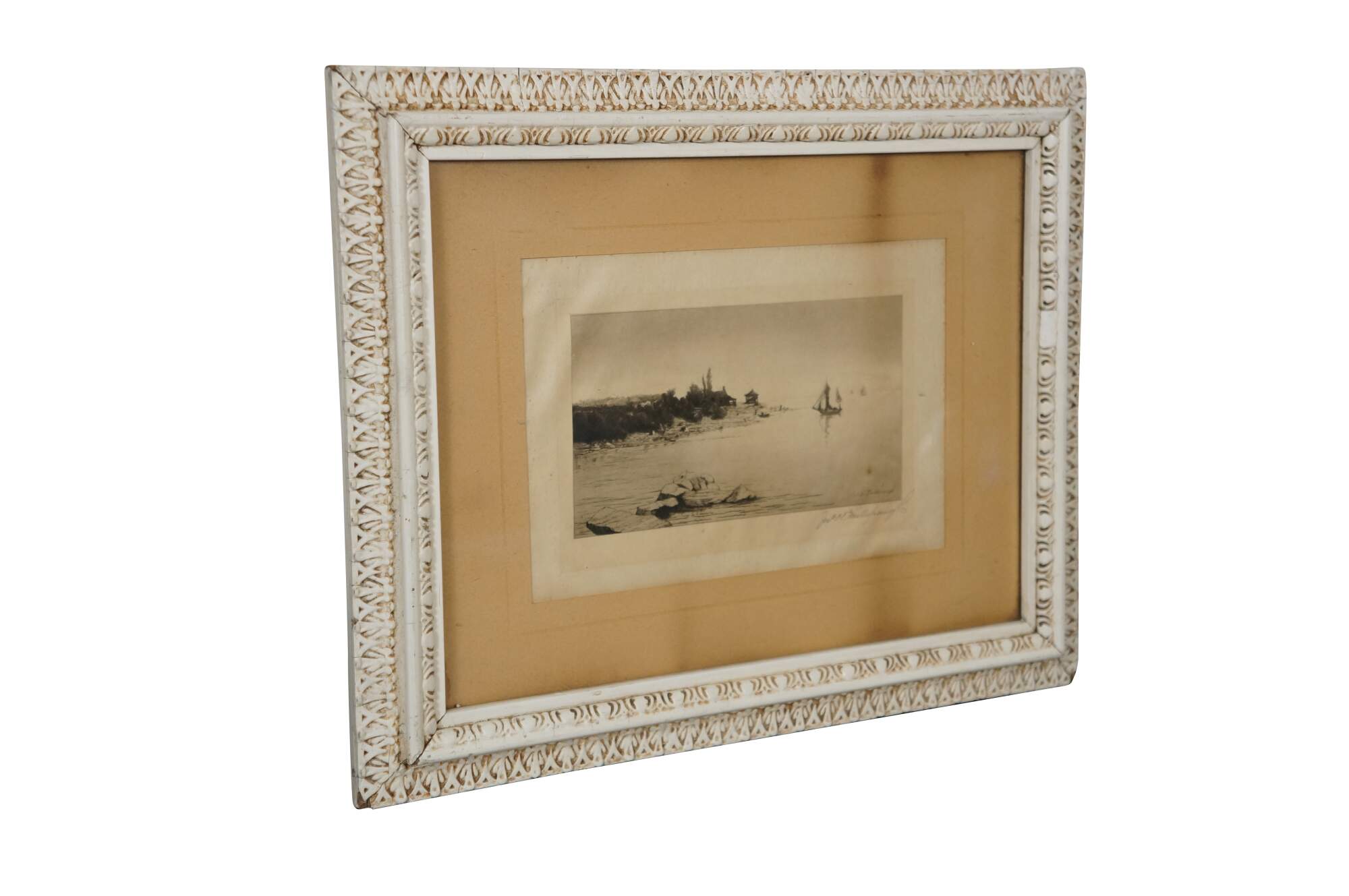 Late 19th century black and white etching by John Hill Millspaugh. Coastal landscape showing a cottage at the edge of water with several sailboats. Signed in plate Jh H Millspaugh 1886, lower right. Pencil signed, lower right edge. Carved and beveled white painted wood frame; yellowed mat.