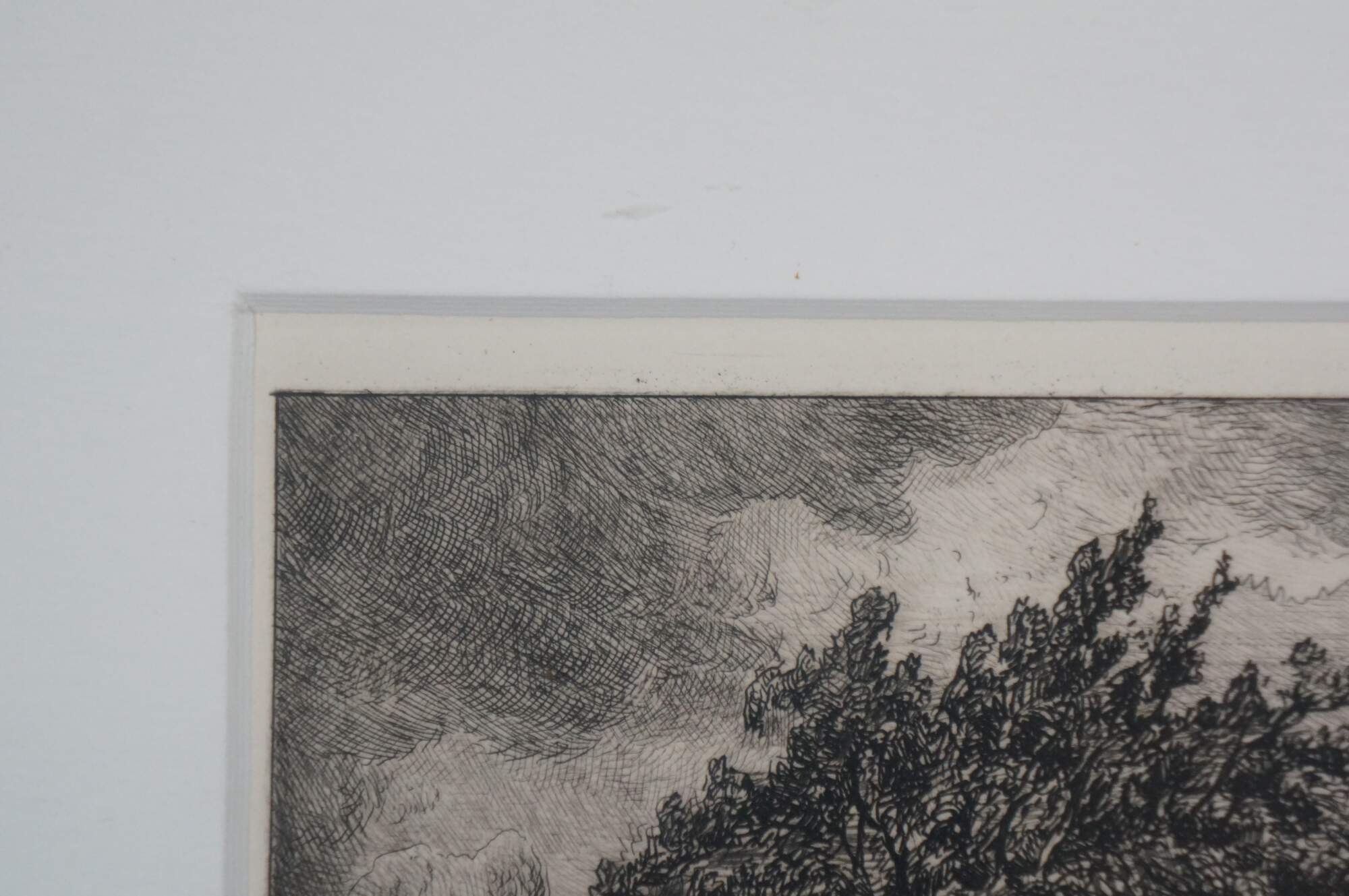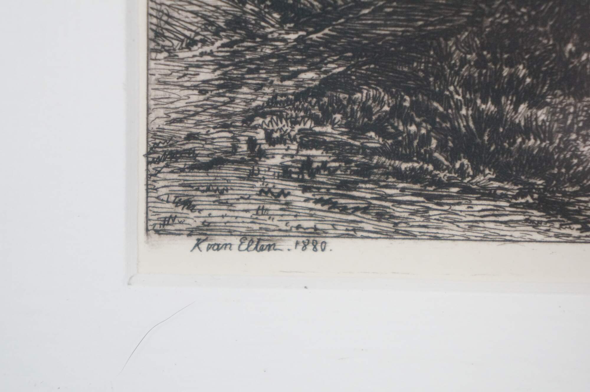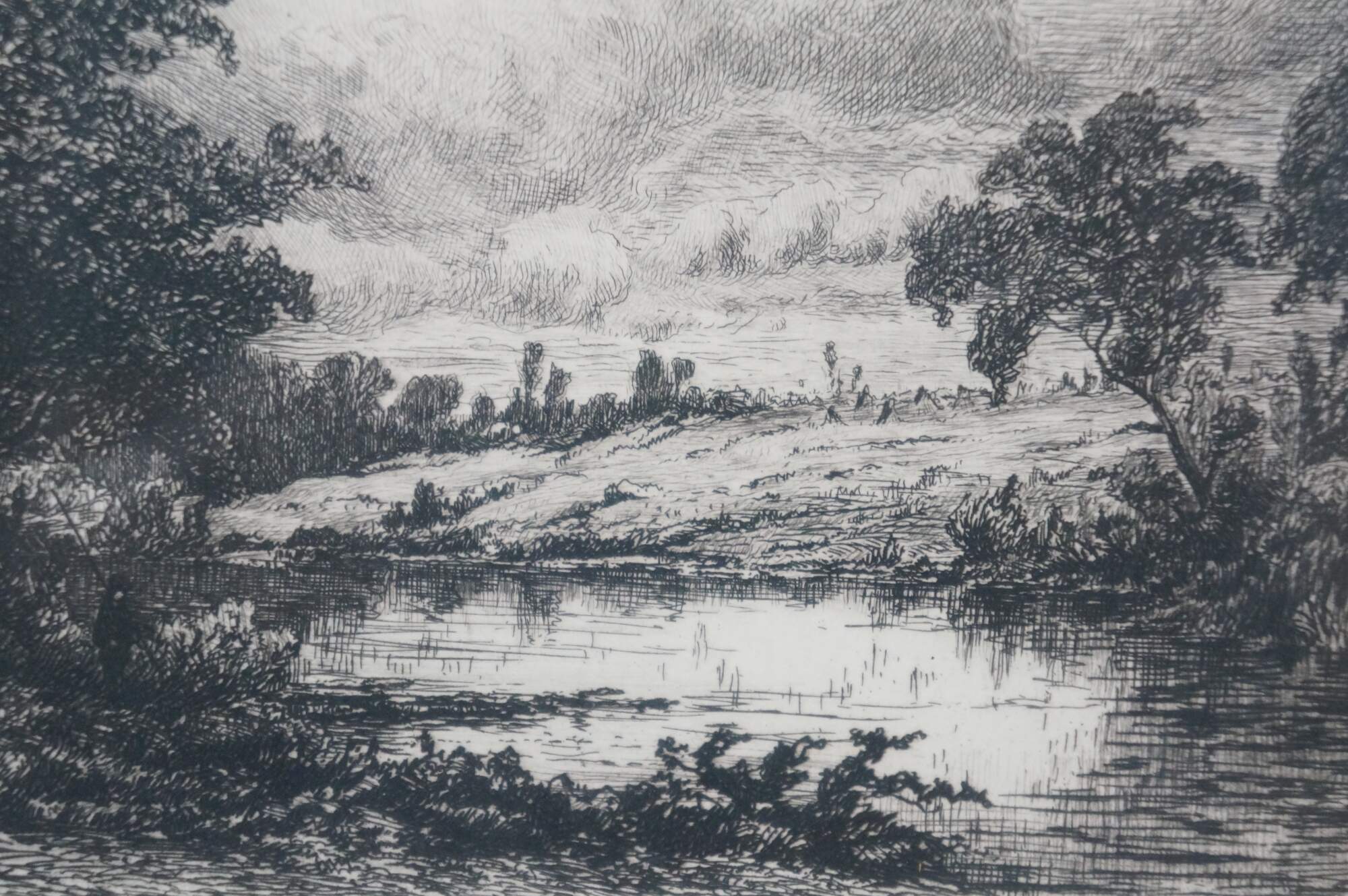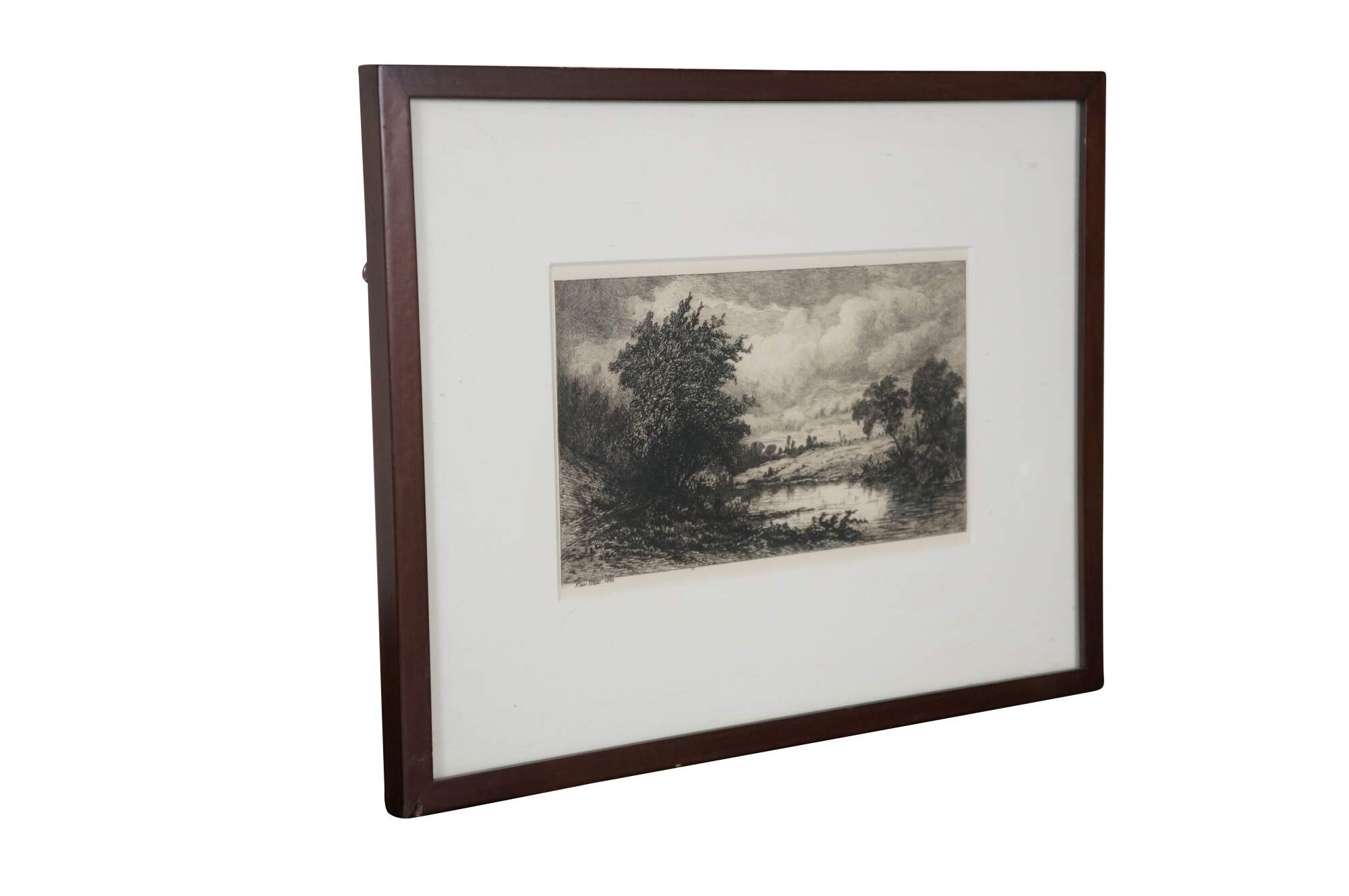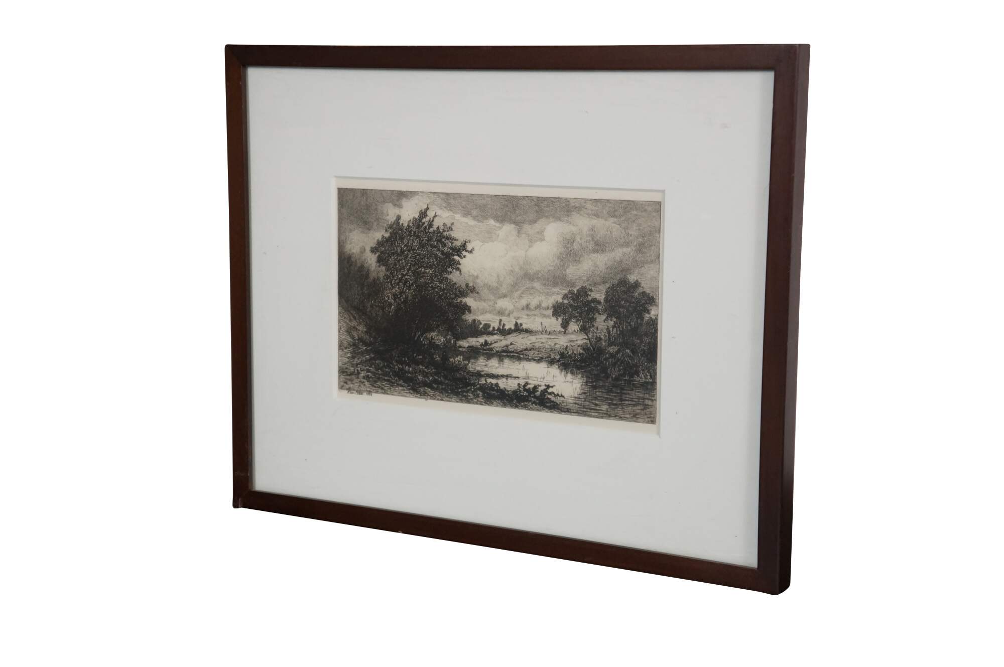 Late 19th century black and white etching by Hendrik Kirk Kruseman van Elten titled on the Shepang River, Connecticut. A bucolic country landscape showing a segment of a tree lined river. Signed in plate K van Elten 1880. Wood frame; white mat.