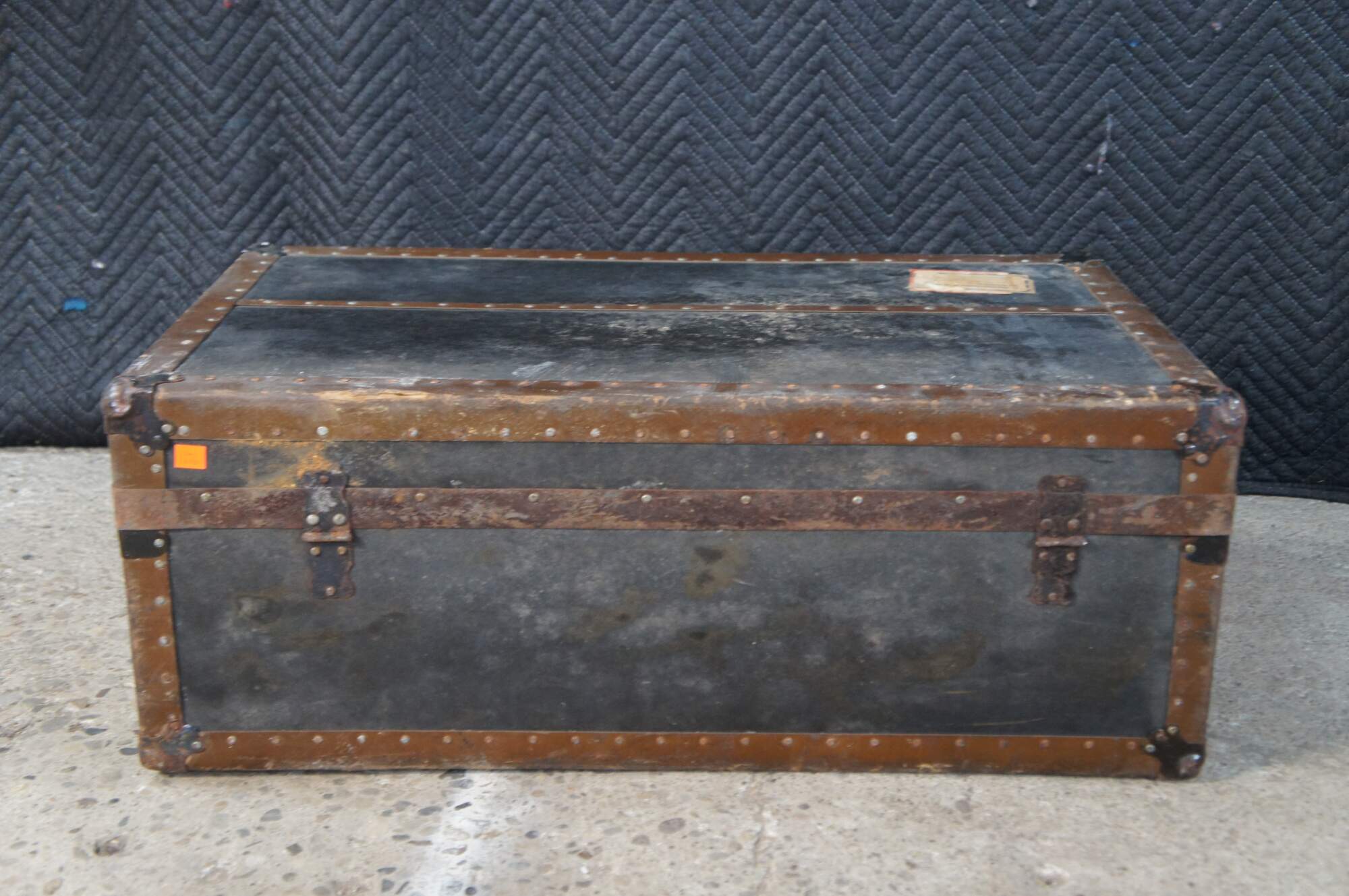 Antique steamer trunk / chest / suitcase featuring brown and black metal banding, nailhead trim, and leather handle.