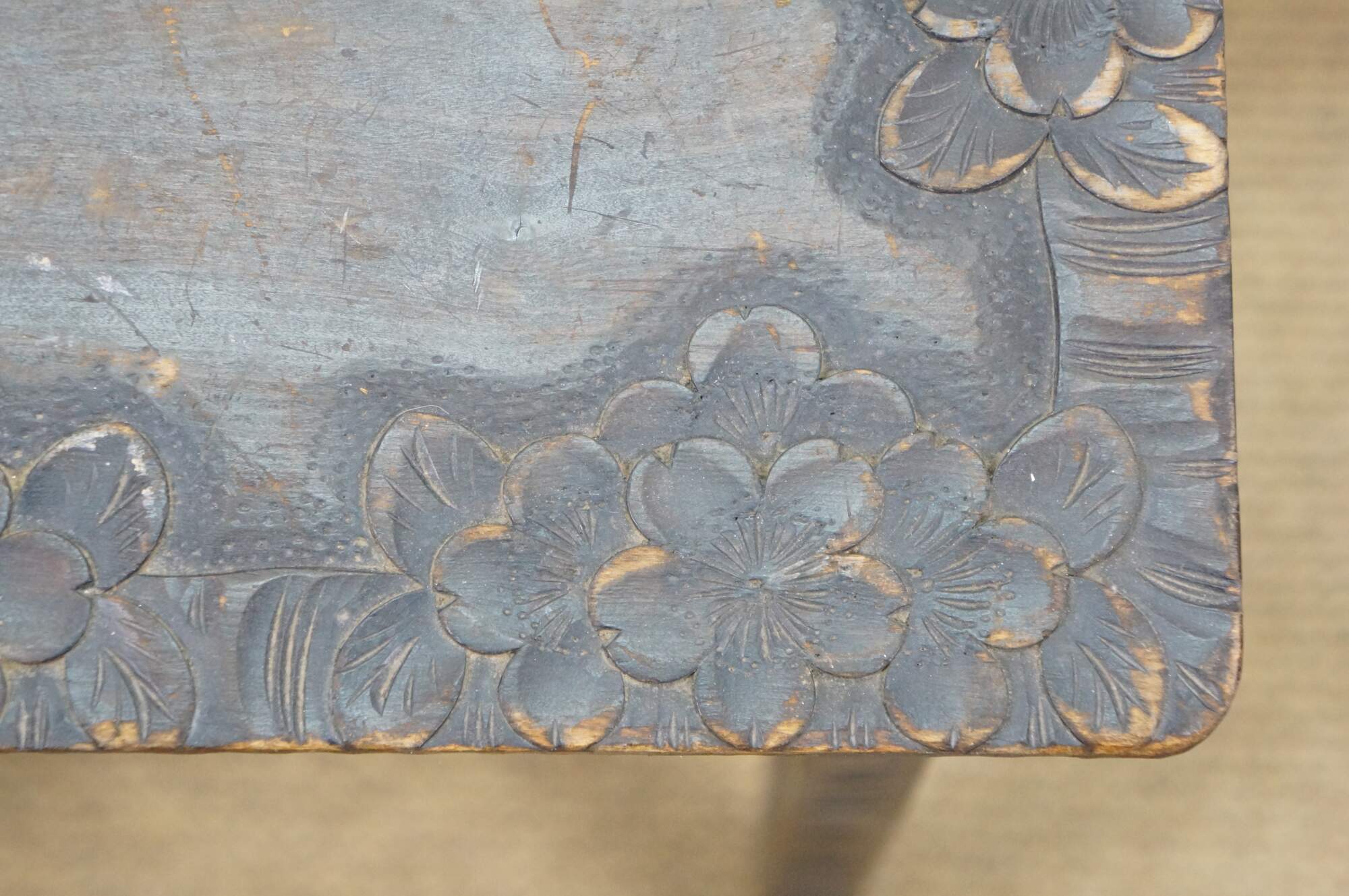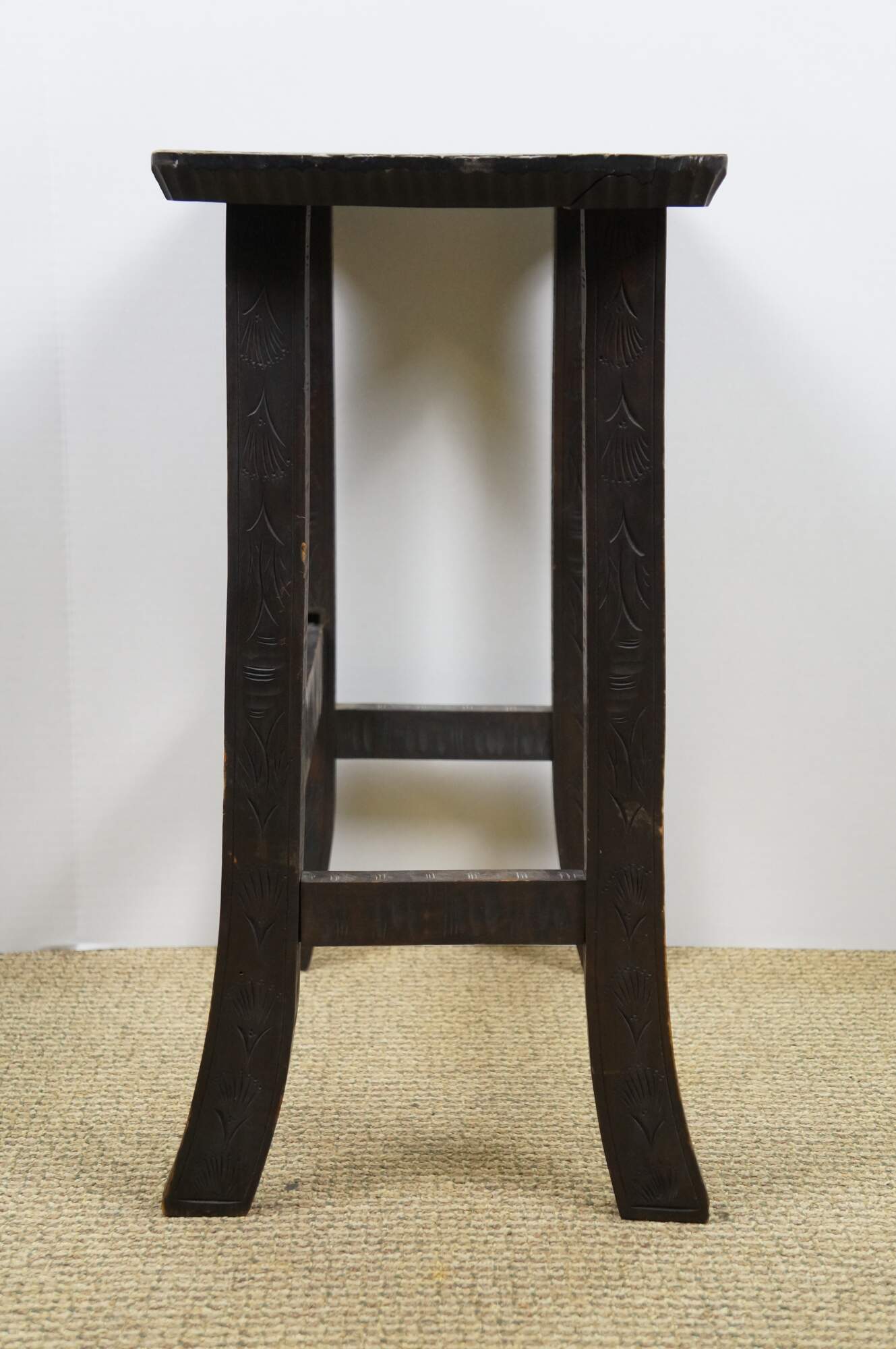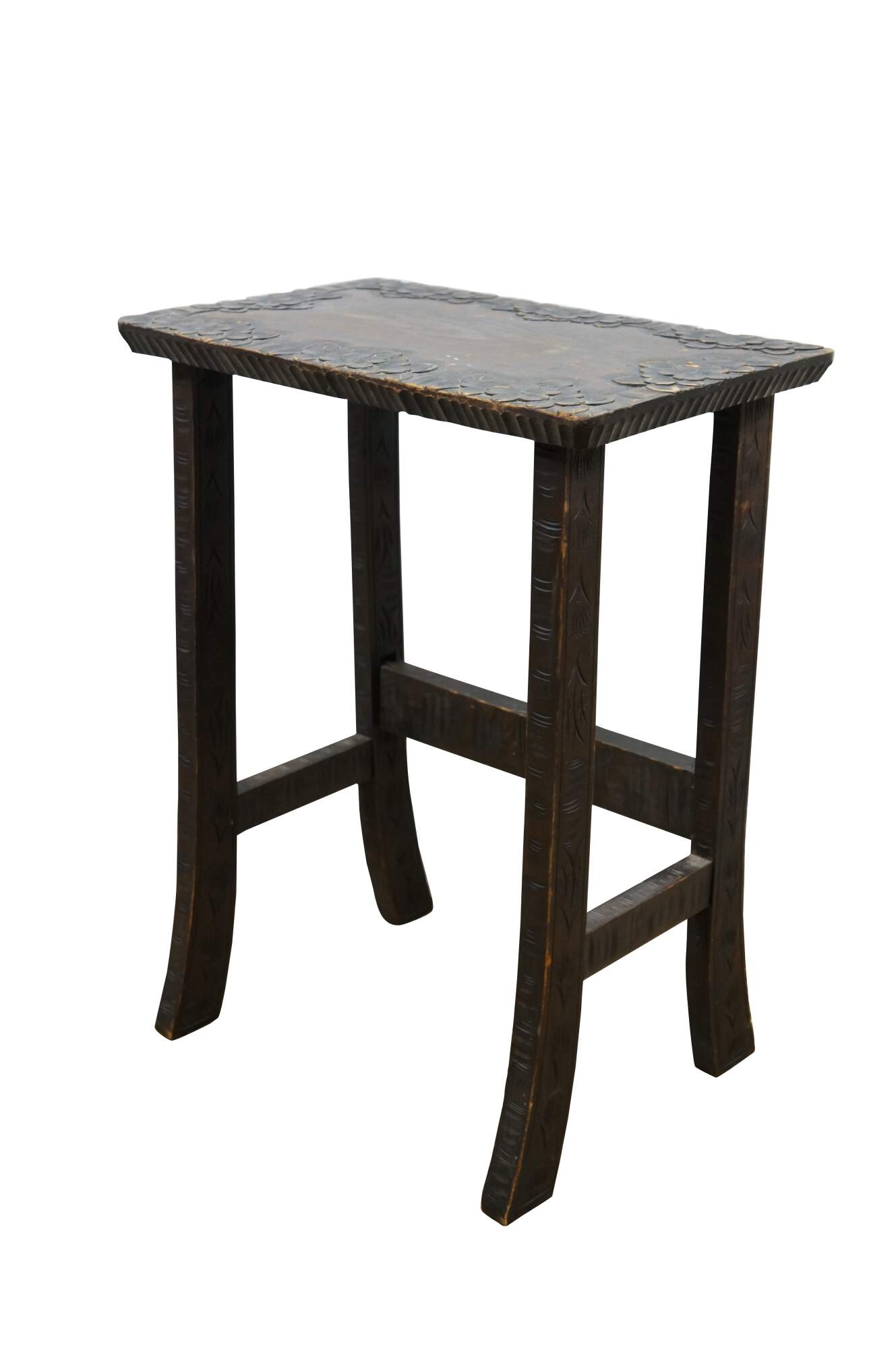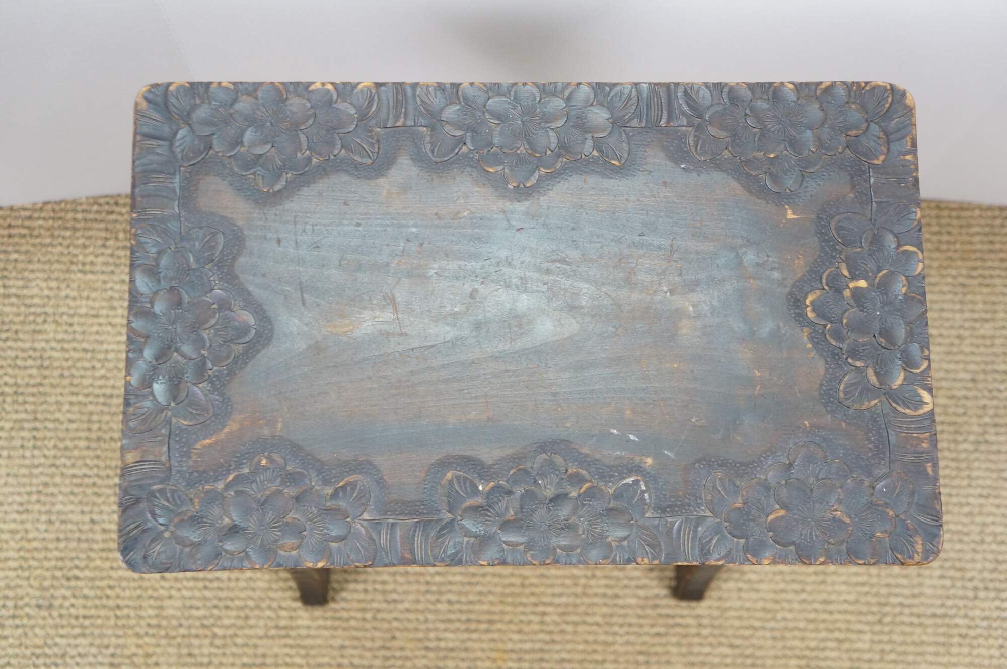 Antique Jacobean walnut accent table or stand. Rectangular form with sabre legs and stretchers on three sides of the base. Top carved with a frame of dogwood blossoms.