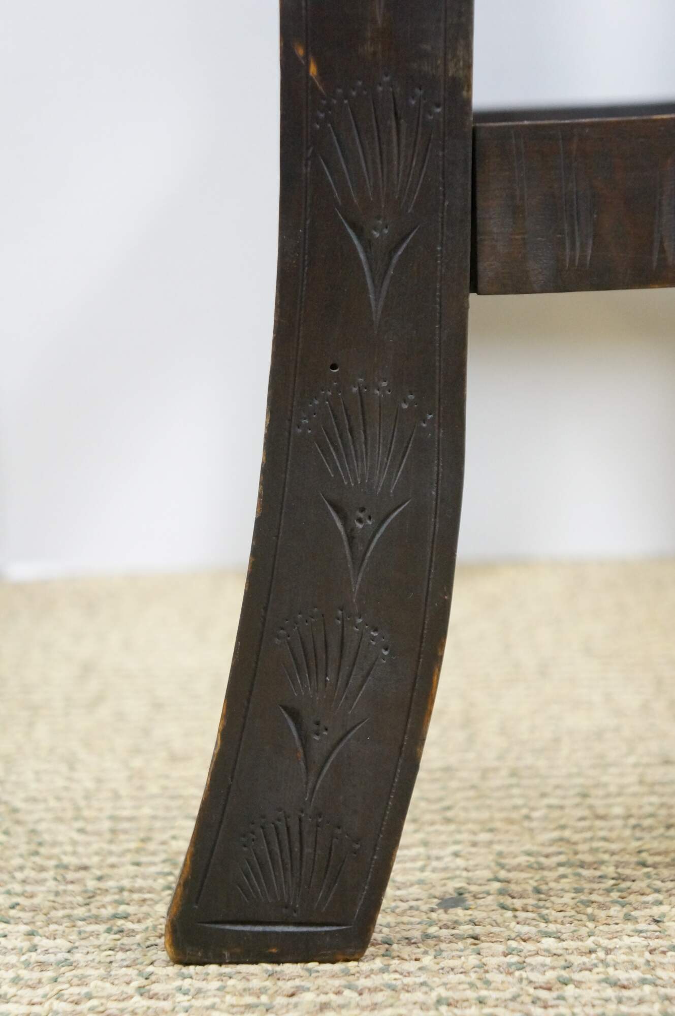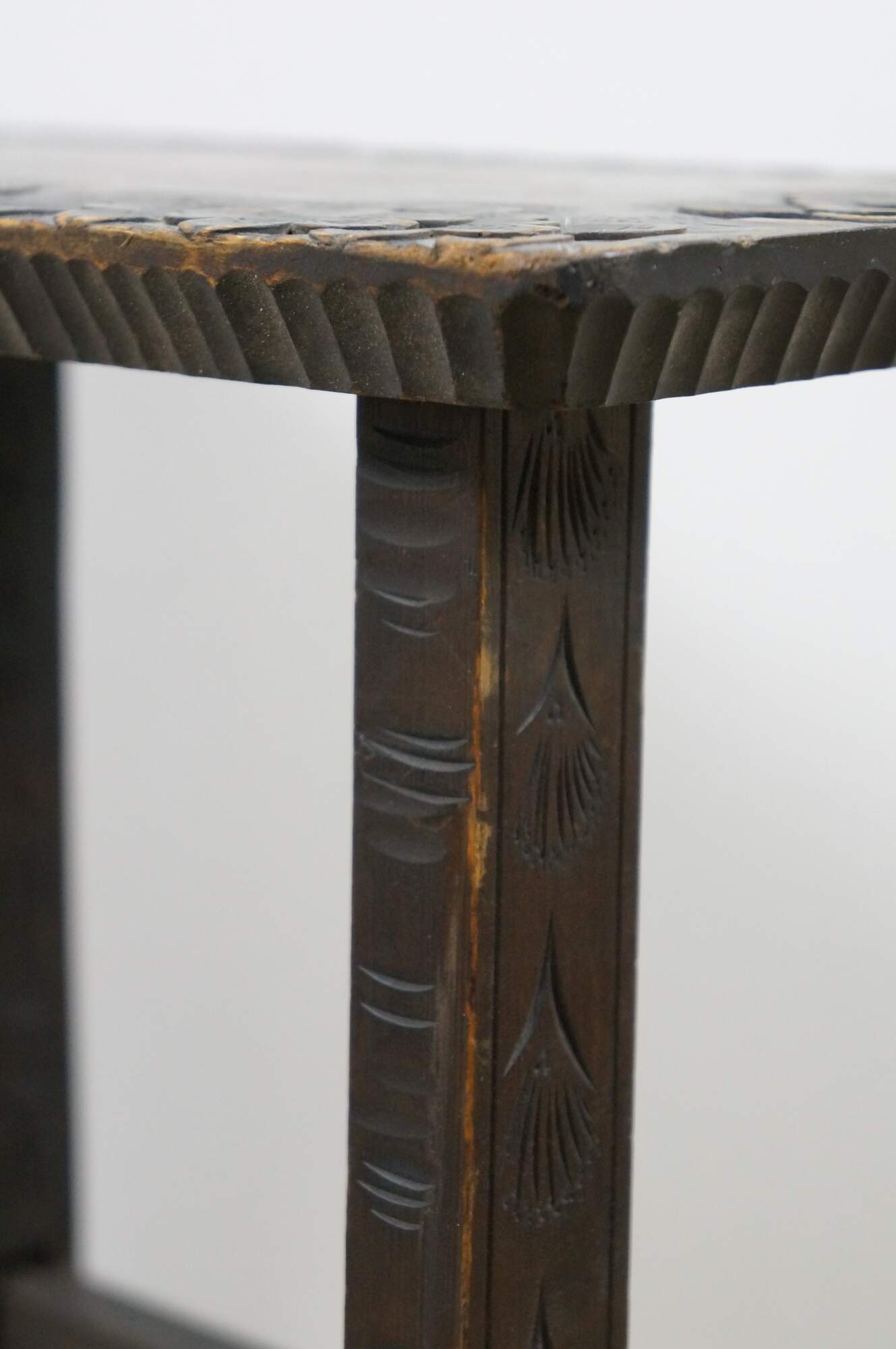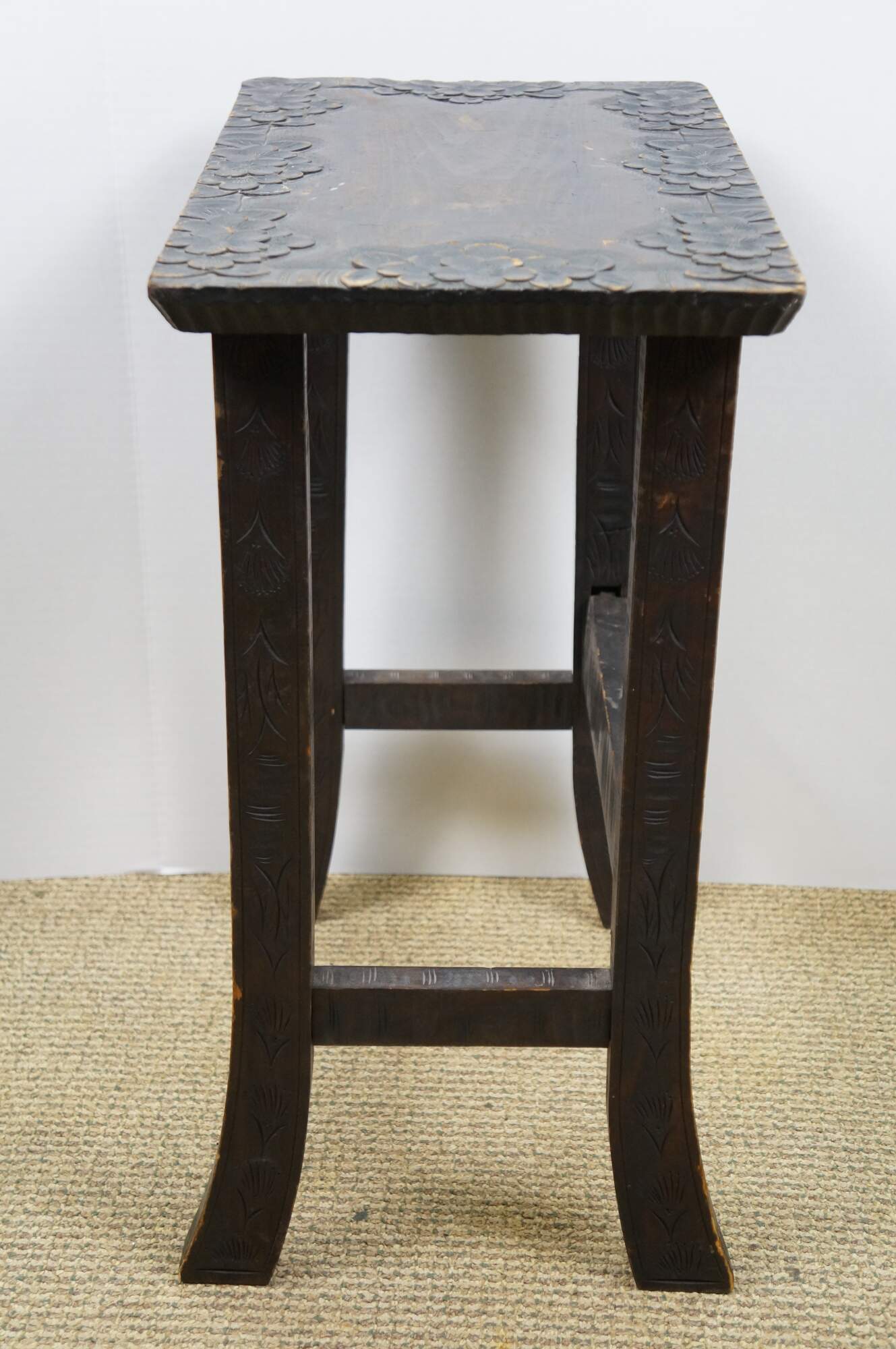 Antique Jacobean walnut accent table or stand. Rectangular form with sabre legs and stretchers on three sides of the base. Top carved with a frame of dogwood blossoms.