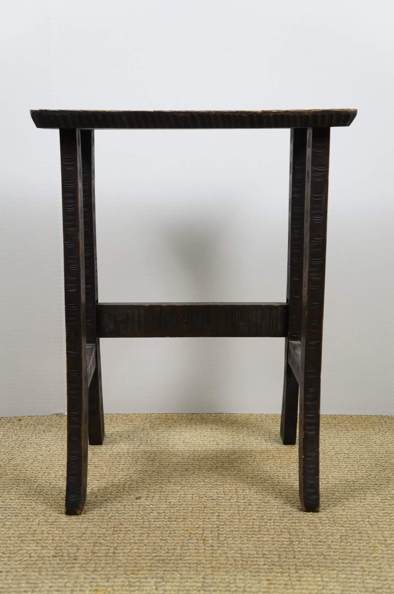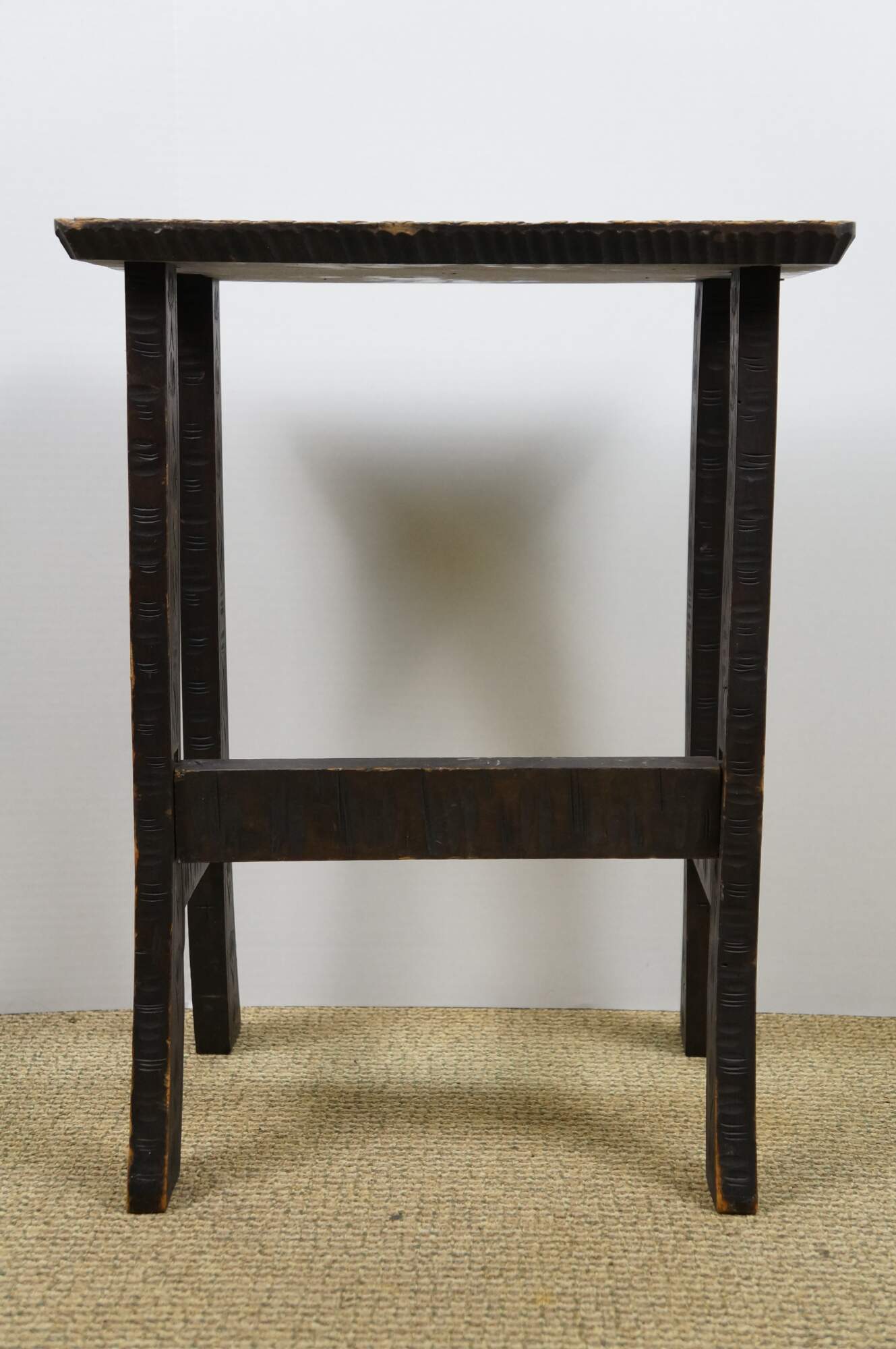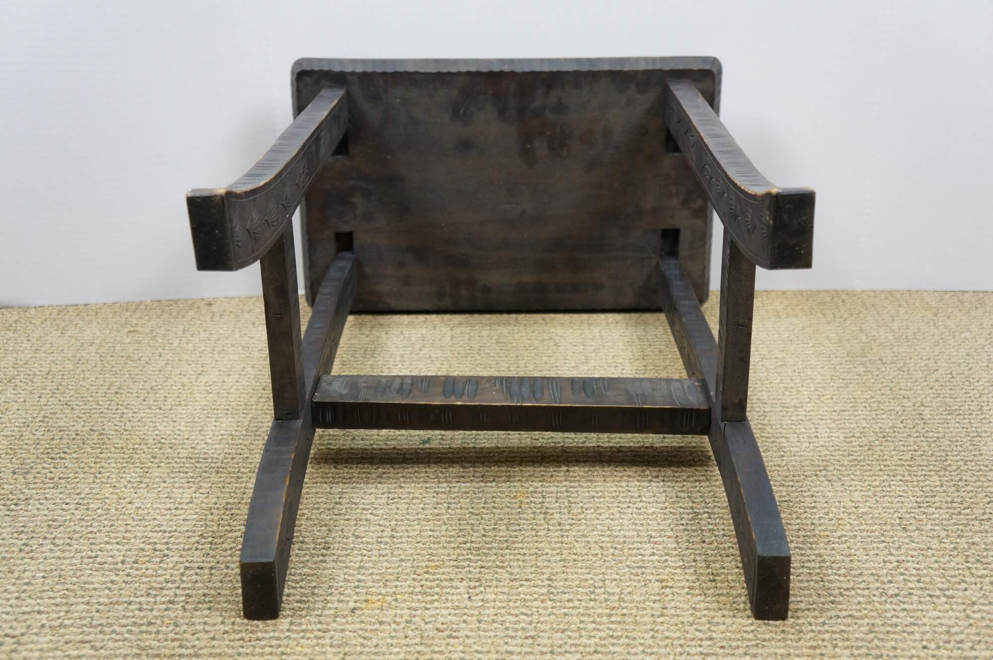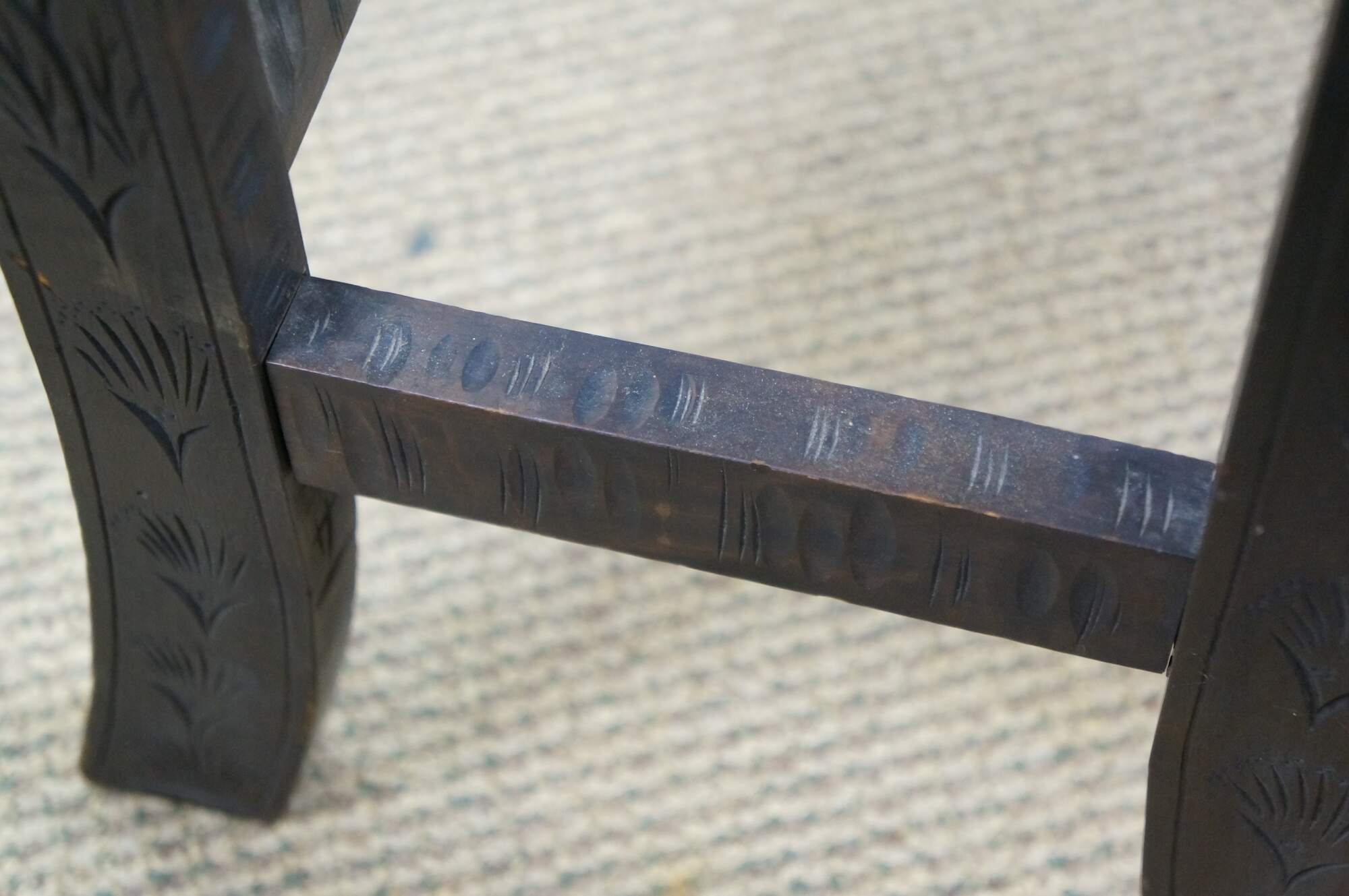 Antique Jacobean walnut accent table or stand. Rectangular form with sabre legs and stretchers on three sides of the base. Top carved with a frame of dogwood blossoms.