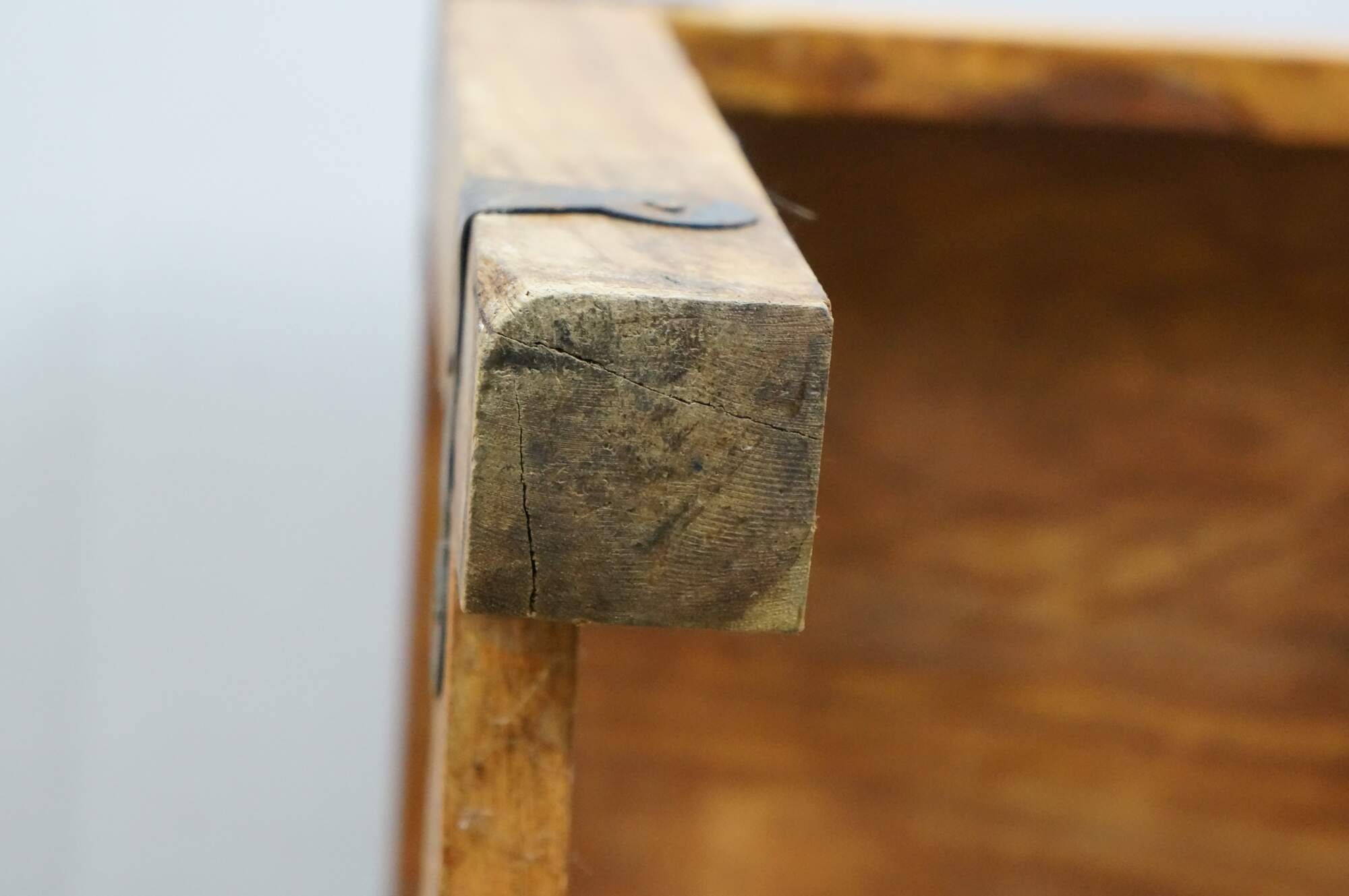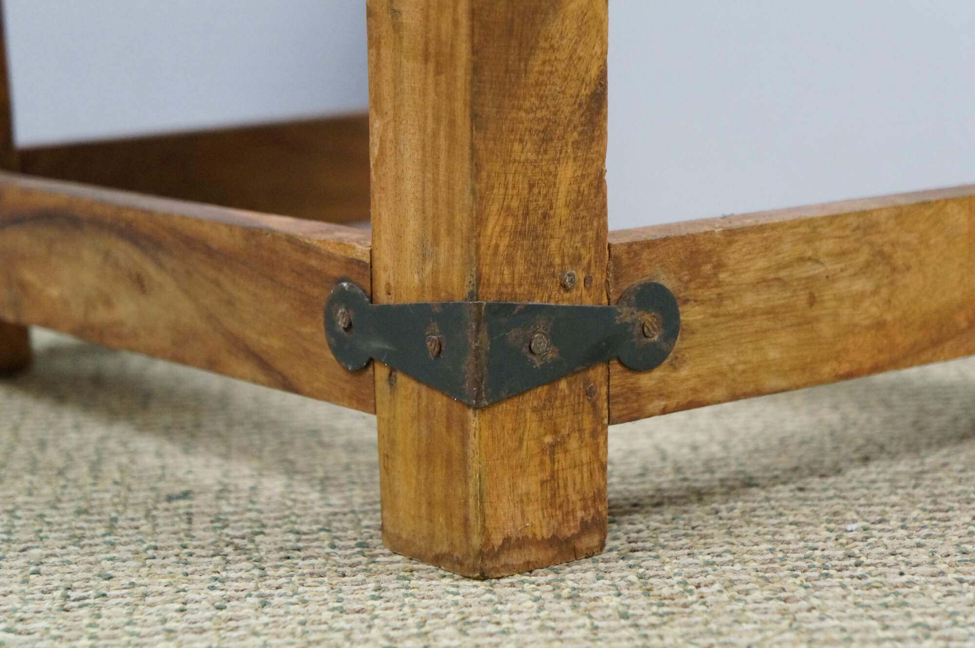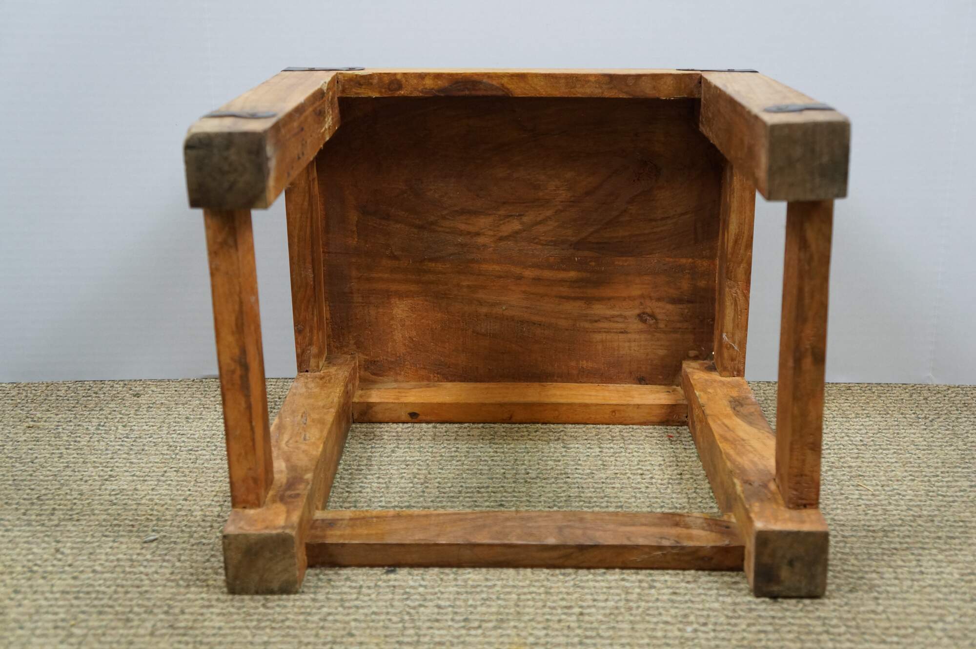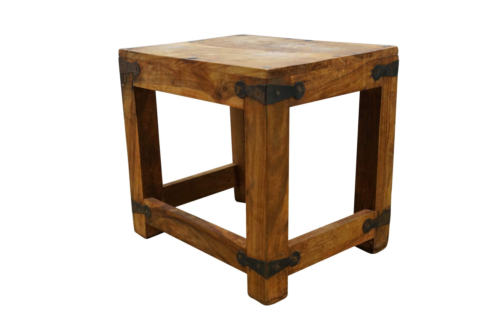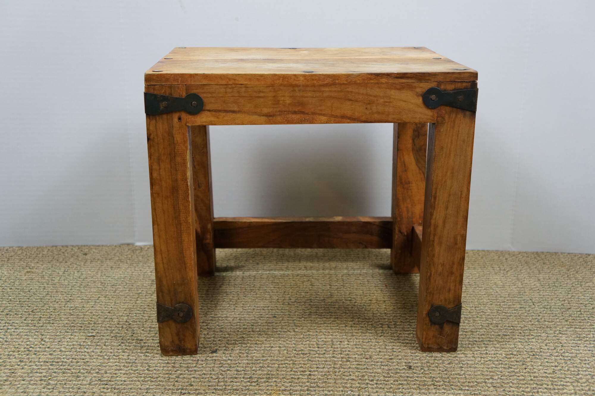 Vintage rustic table or footstool. Rectangular hardwood construction with studded top and iron banded corners. Orignally the smallest of a set of three thakat nesting tables.