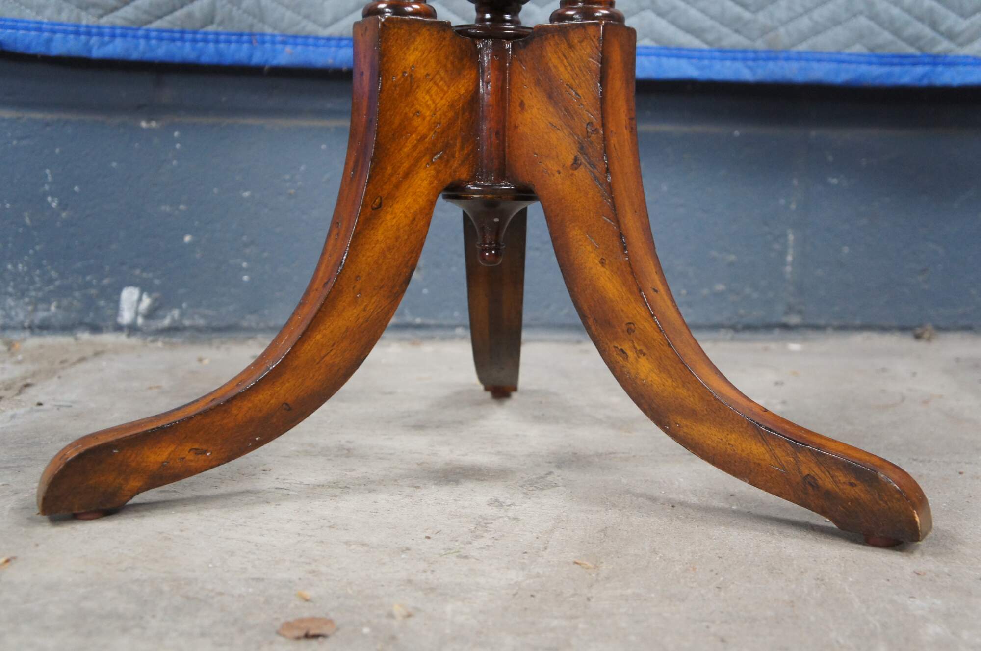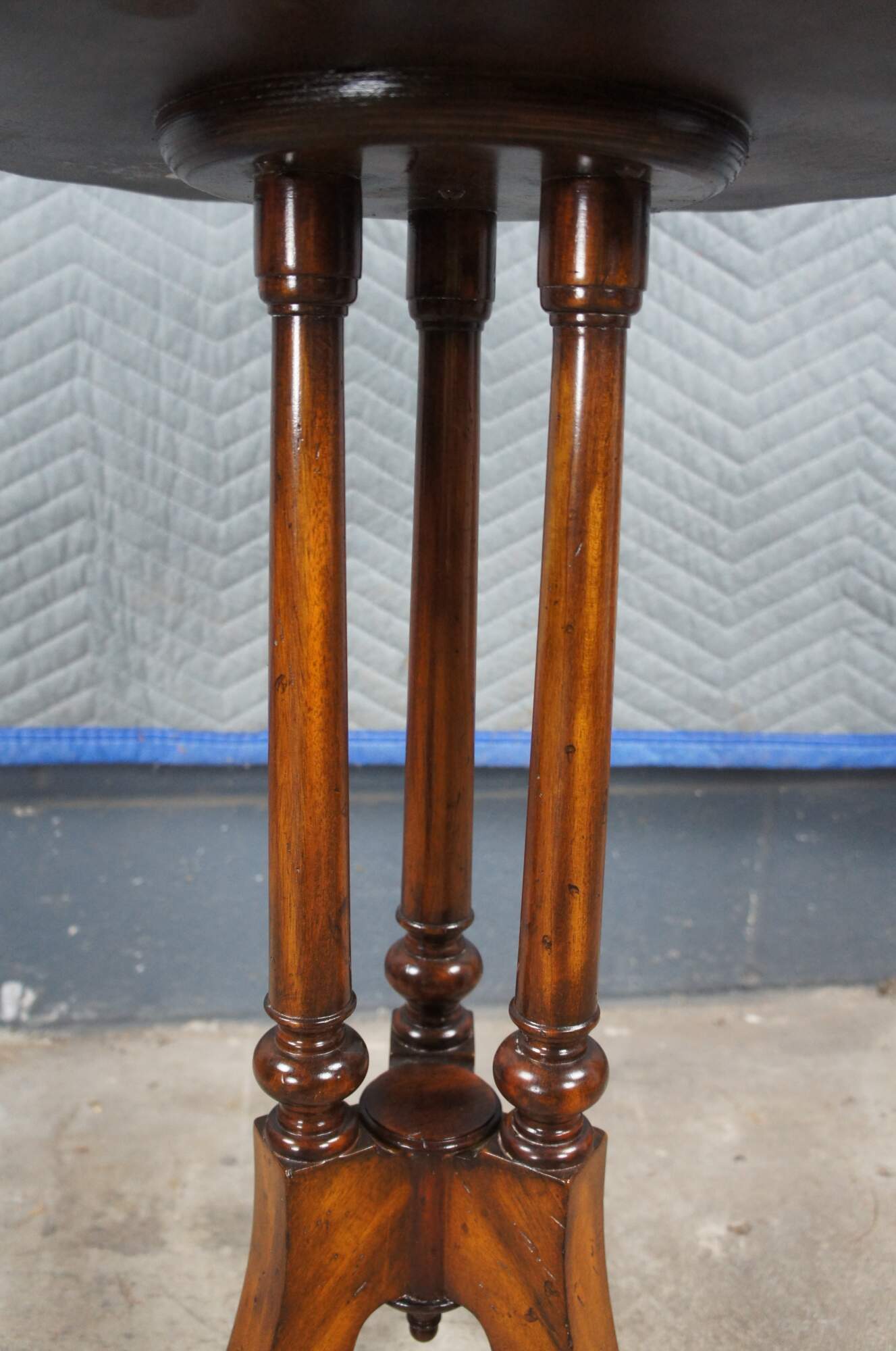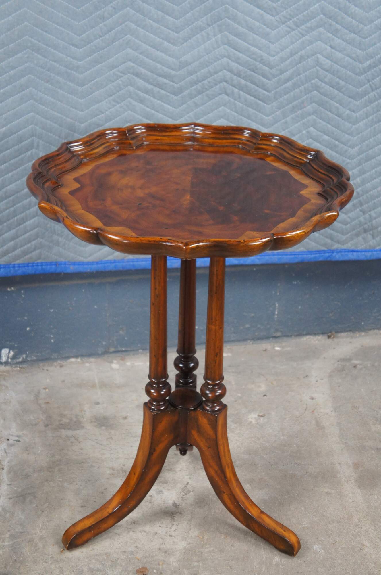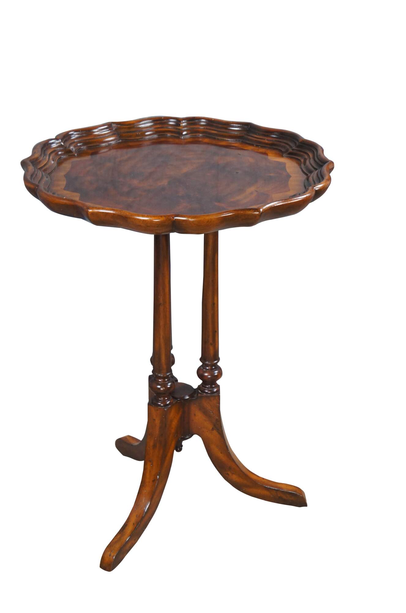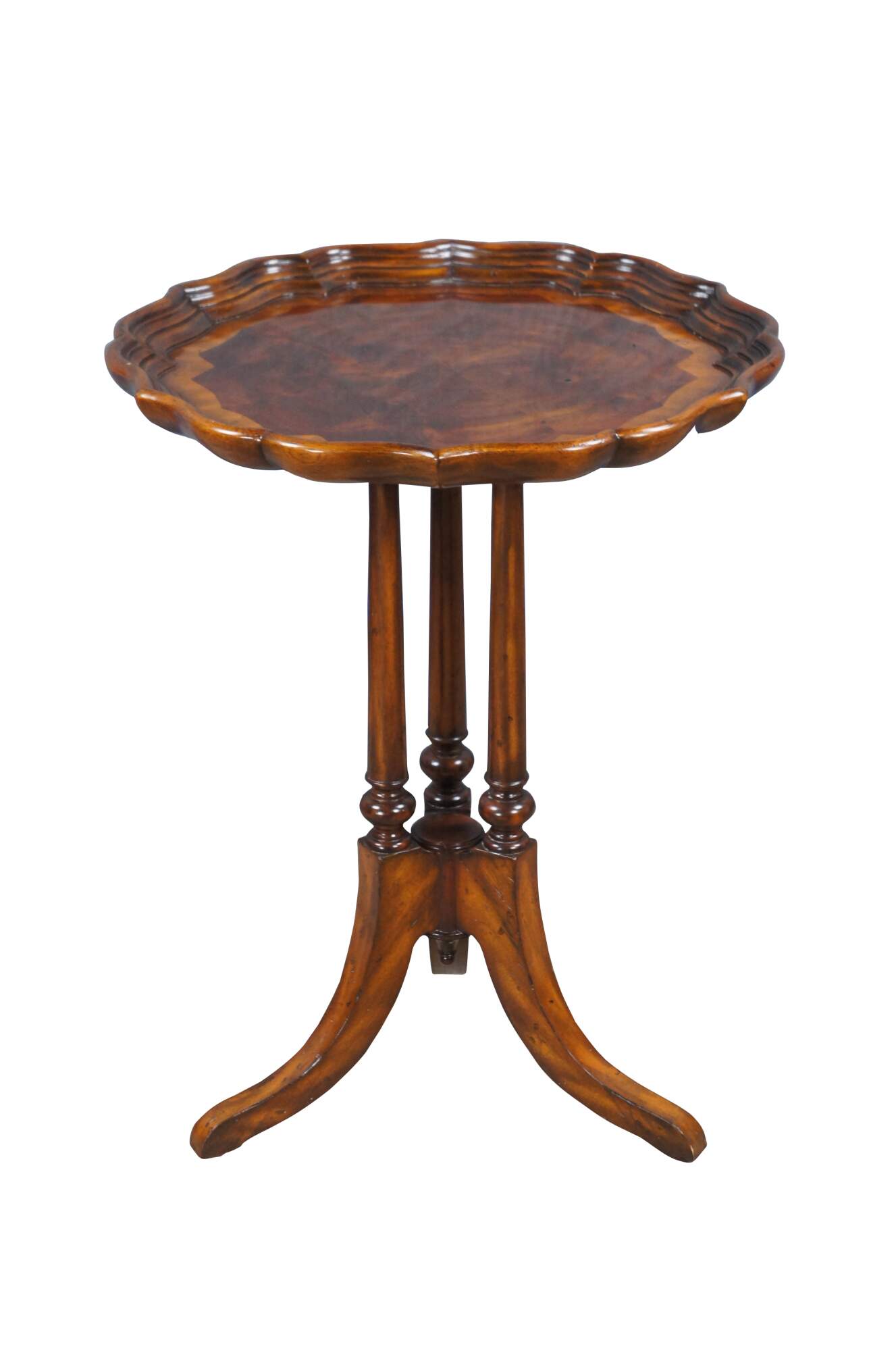 Late 20th Century Maitland Smith Side Table. Features a scalloped top with matchbook burl veneer set over a tripod base with turned columns and downswept legs.