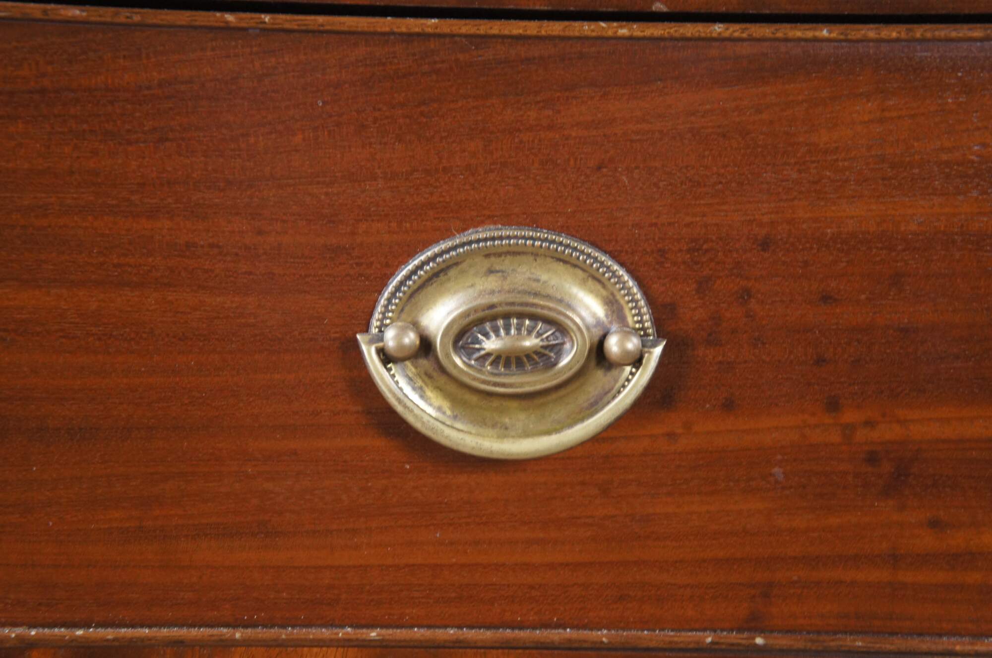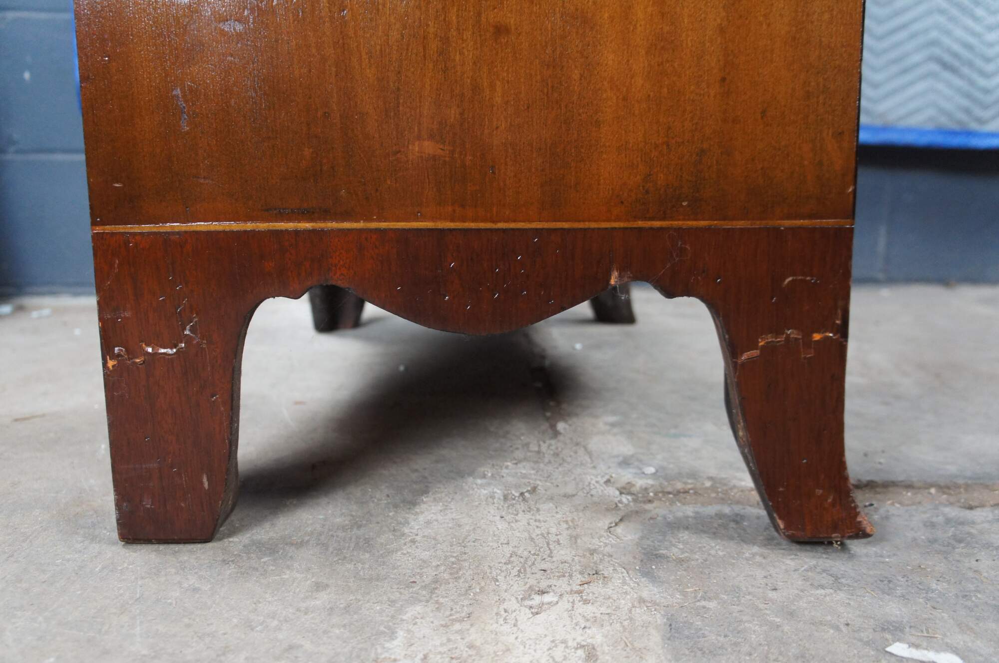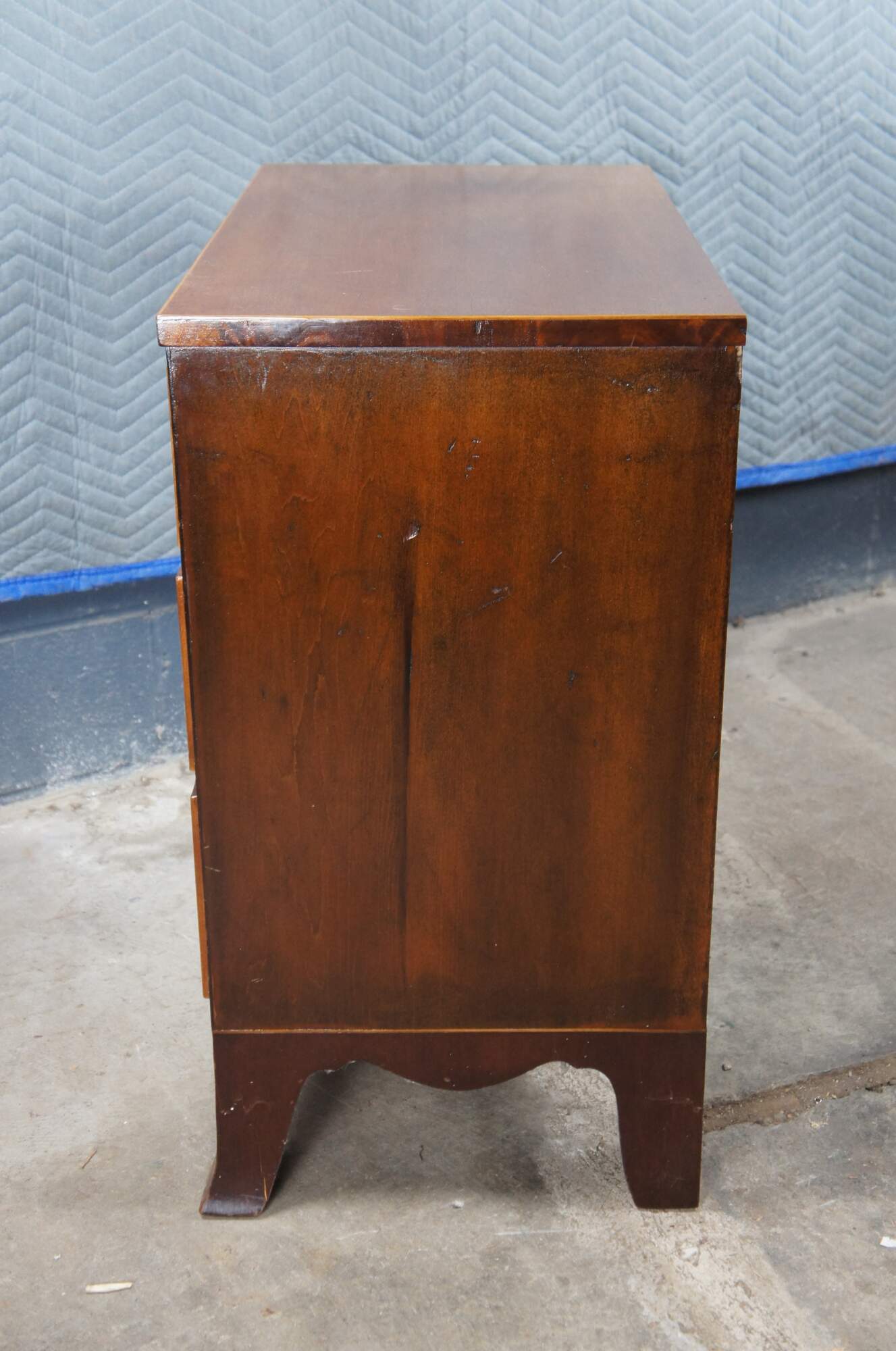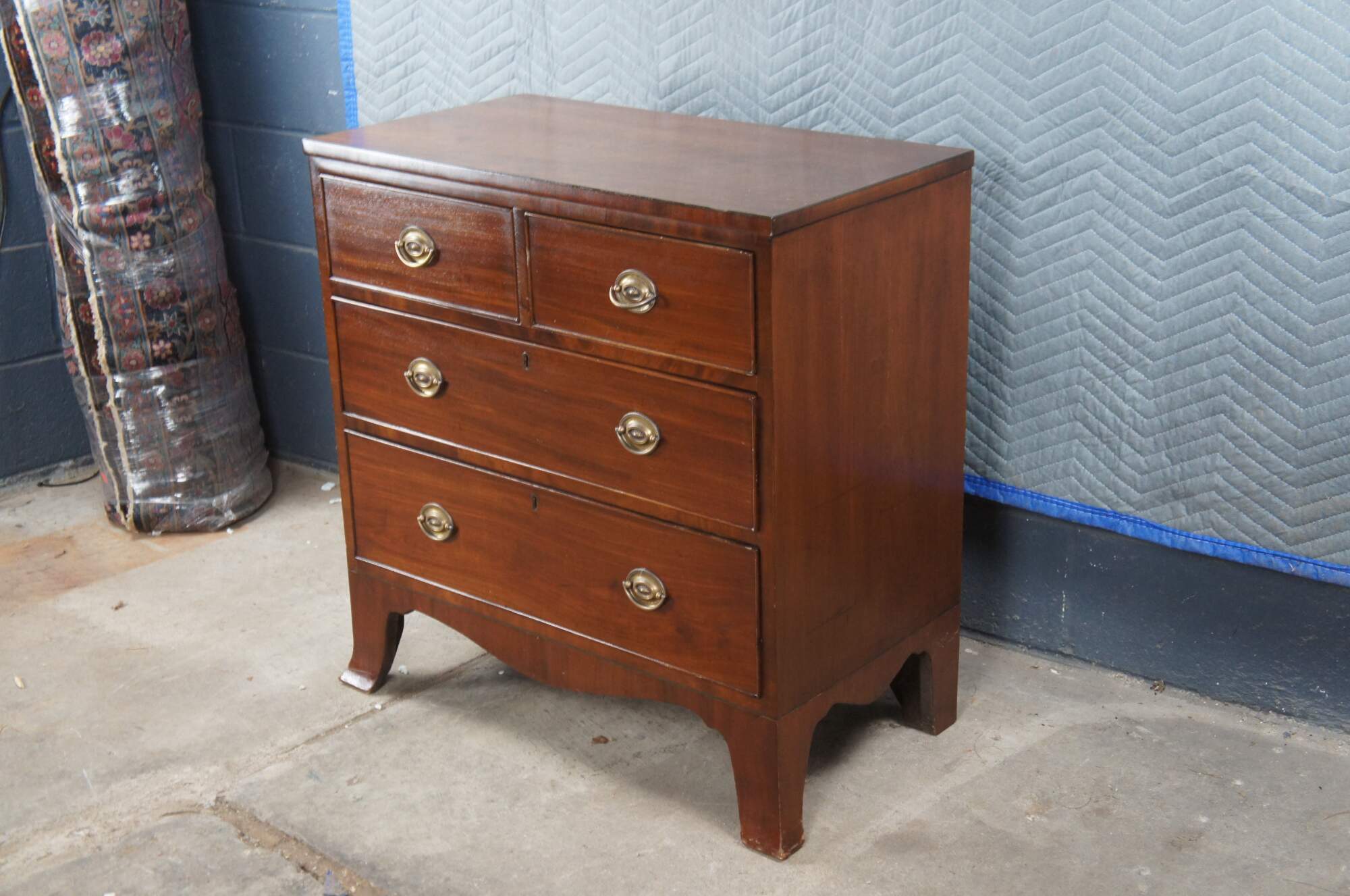 2 Antique English Hepplewhite style Bachelor's Chests. Each features a mahogany frame with four drawers, a lower serpentine apron and flared legs. The two chest are slightly different sizes and tones. One has a matchbook burled veneer.