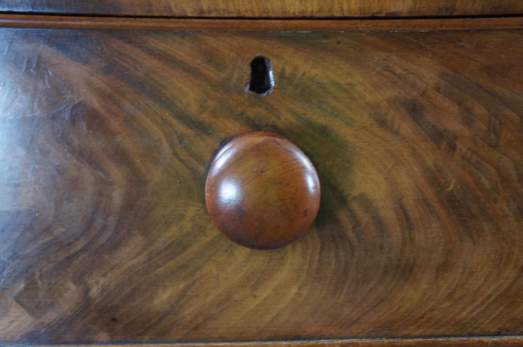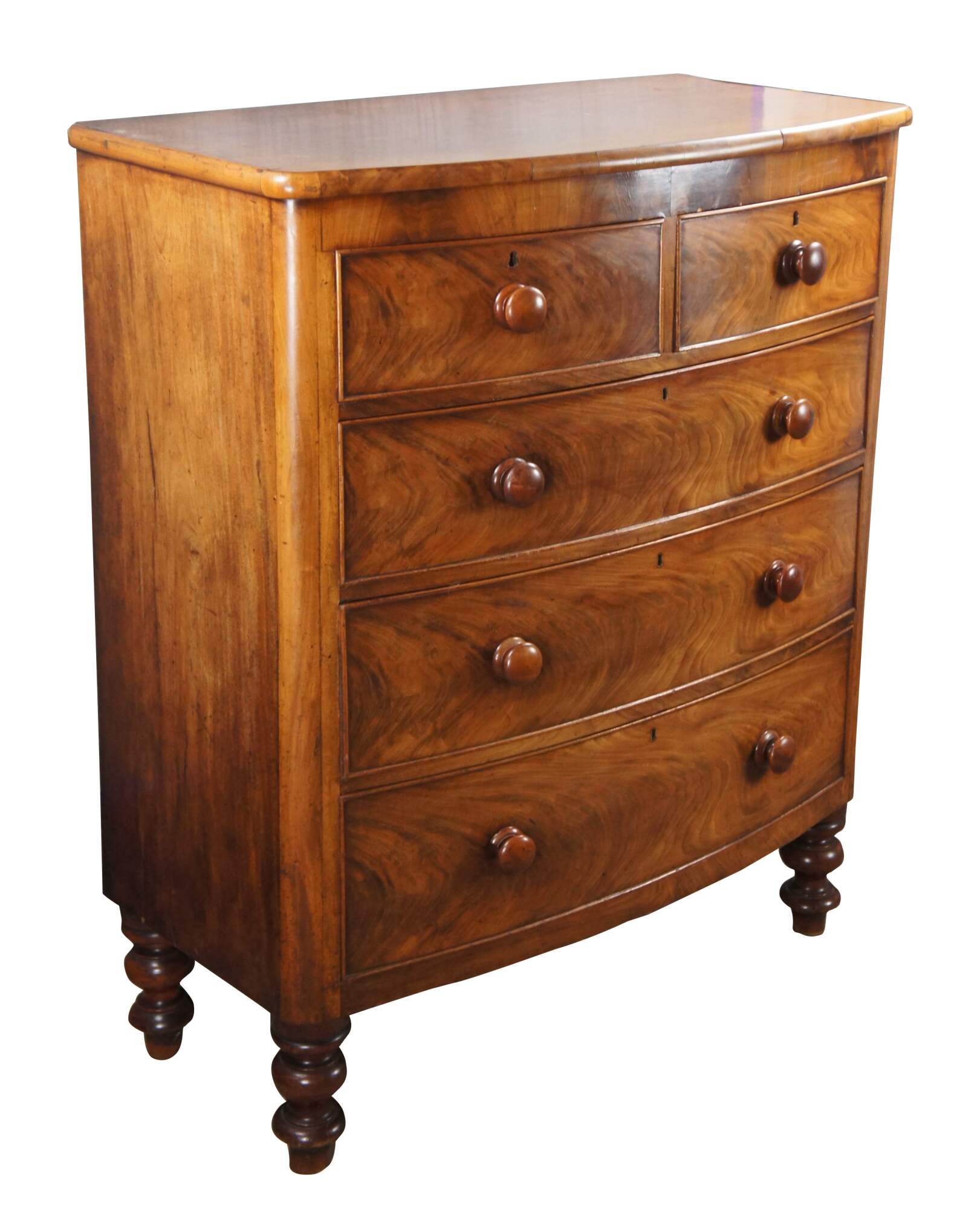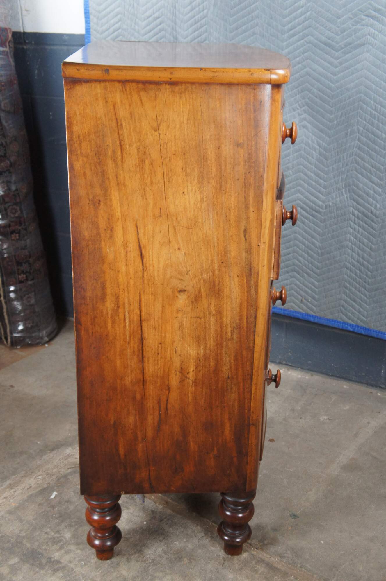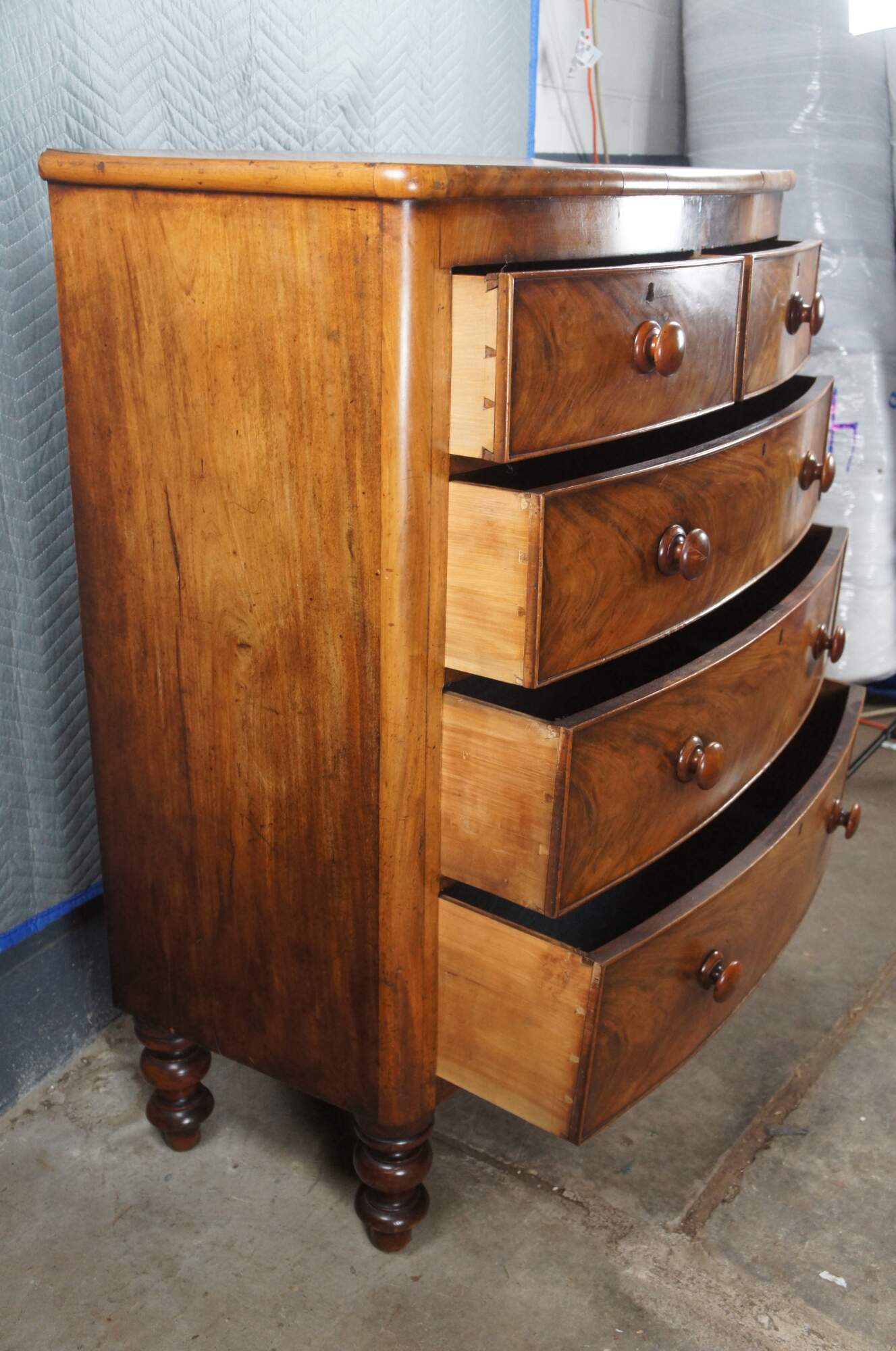 An exceptional antique 19th Century Victorian Tallbot Dresser. Features a mahogany frame with bowfront and two over three drawer configuration. The beautiful drawers showcase flame mahogany veneer and robust turned pulls. Each drawer is hand dovetailed. The case is supported by turned legs.