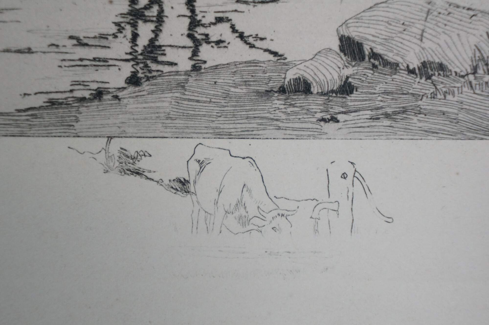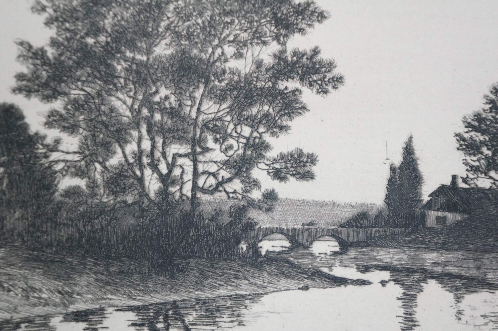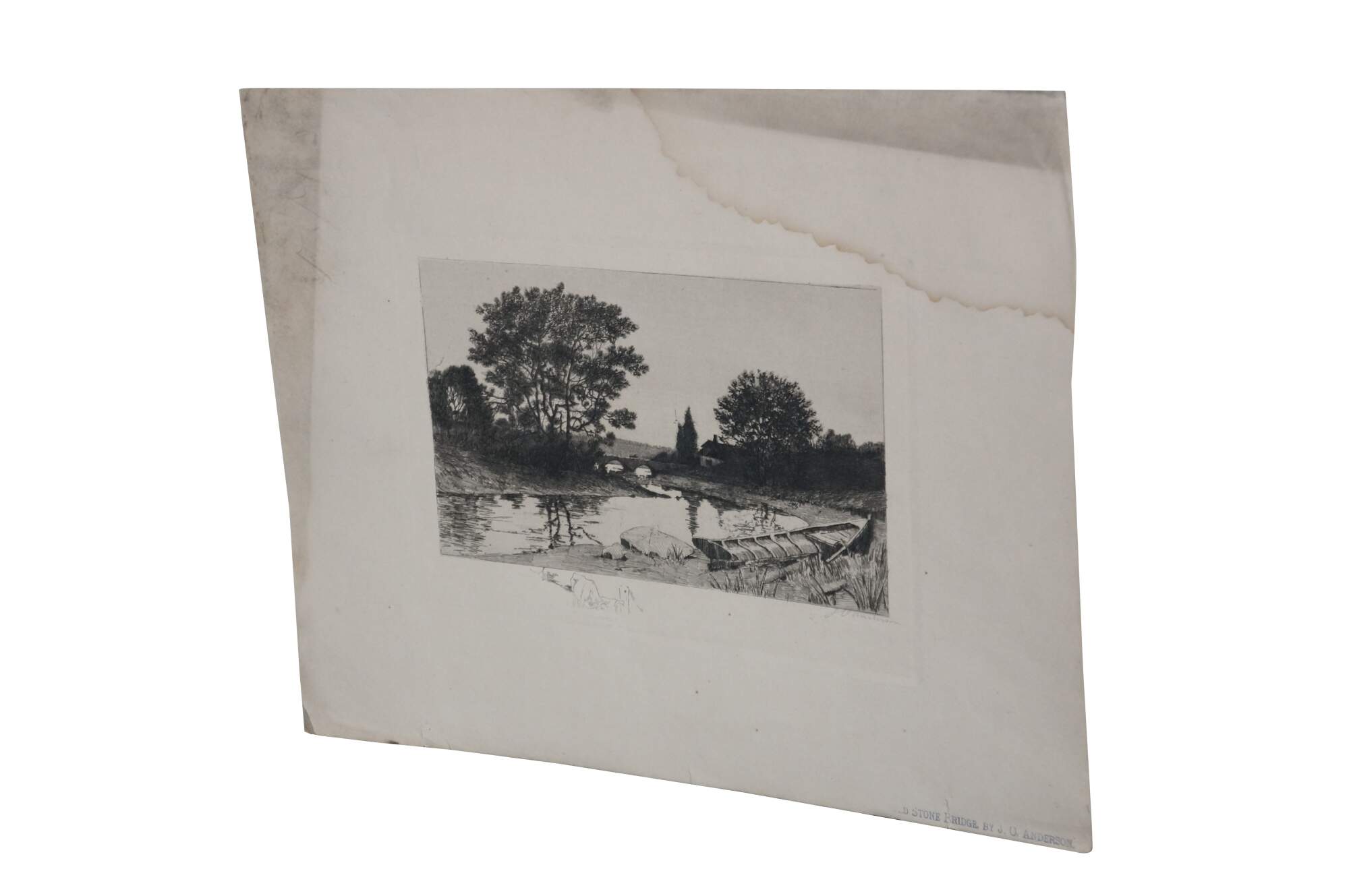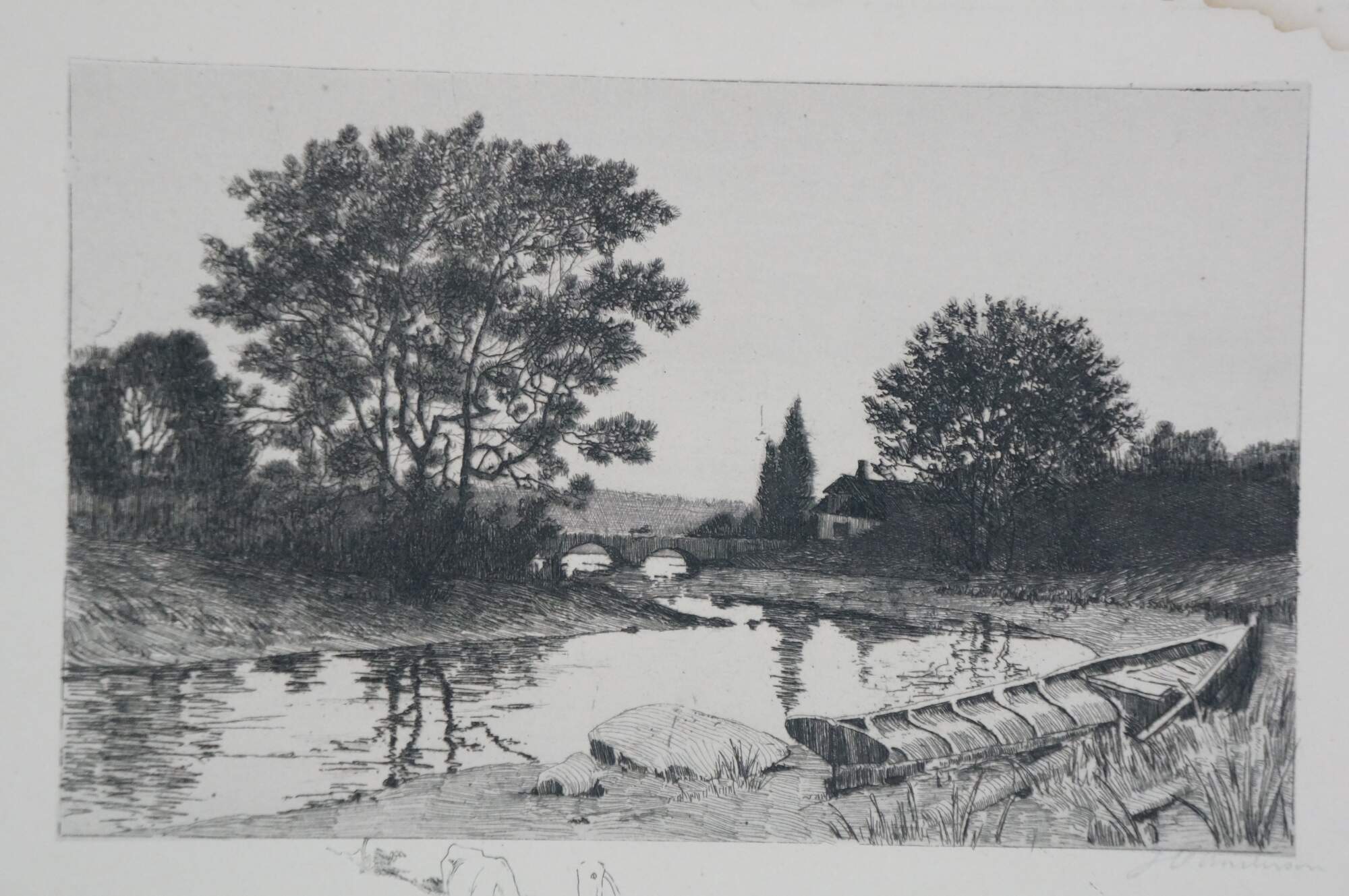 Late 19th century black and white etching titled "Old Stone Bridge" by John Octavius Anderson. Riverscape/landscape with a beached boat in the foreground and a stone bridge in the distance. Remarke of a cow and water pump, lower edge. Pencil signed, lower right. Paper, unframed.