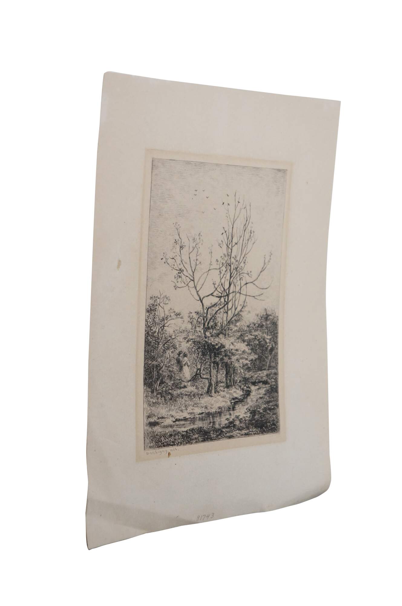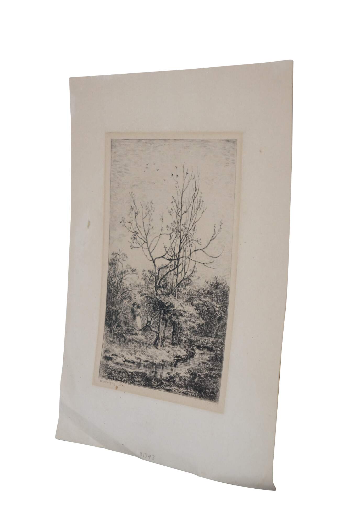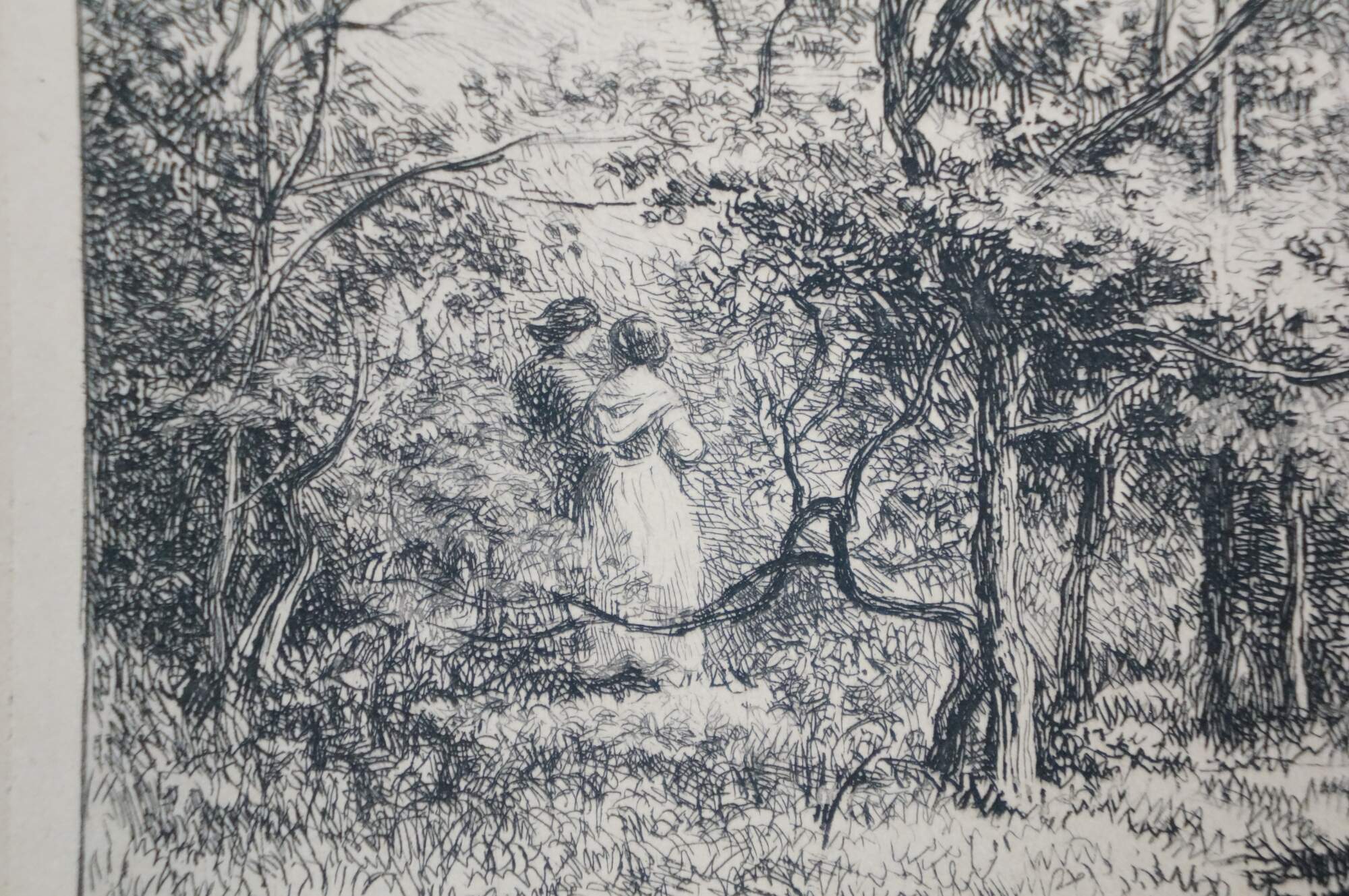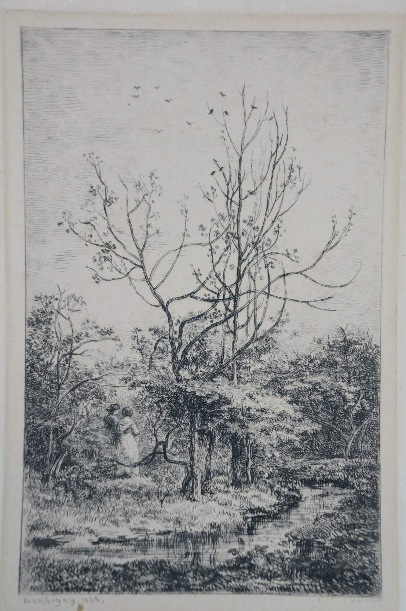 Late 19th century black and white etching titled "The Orchard" by Charles Francois Daubigny. Landscape showing a pair of women walking through trees at the side of a creek. Signed in pate Daubigny 1868, lower left and right. Heavy paper/cardstock; unframed.