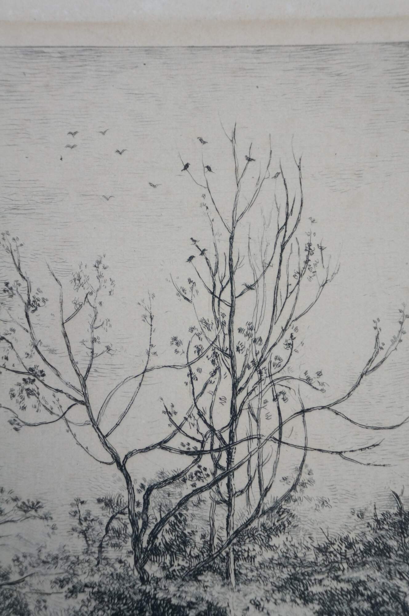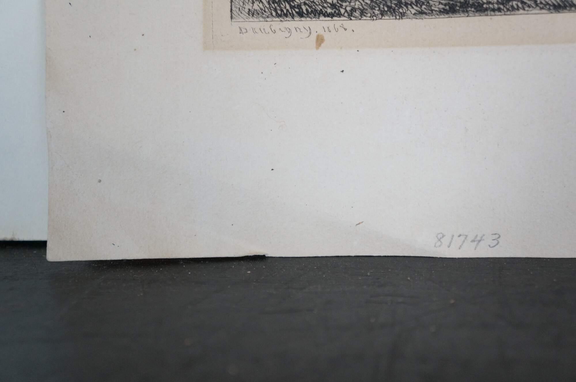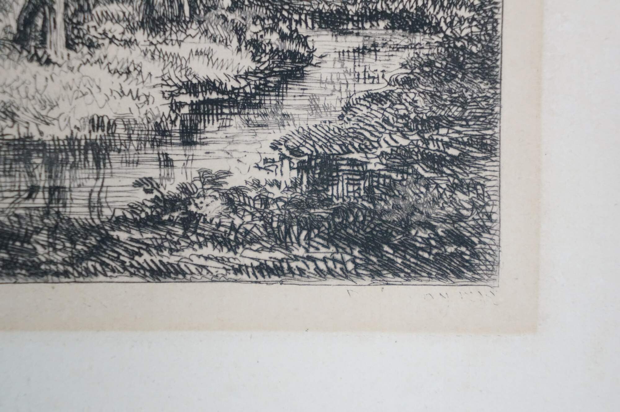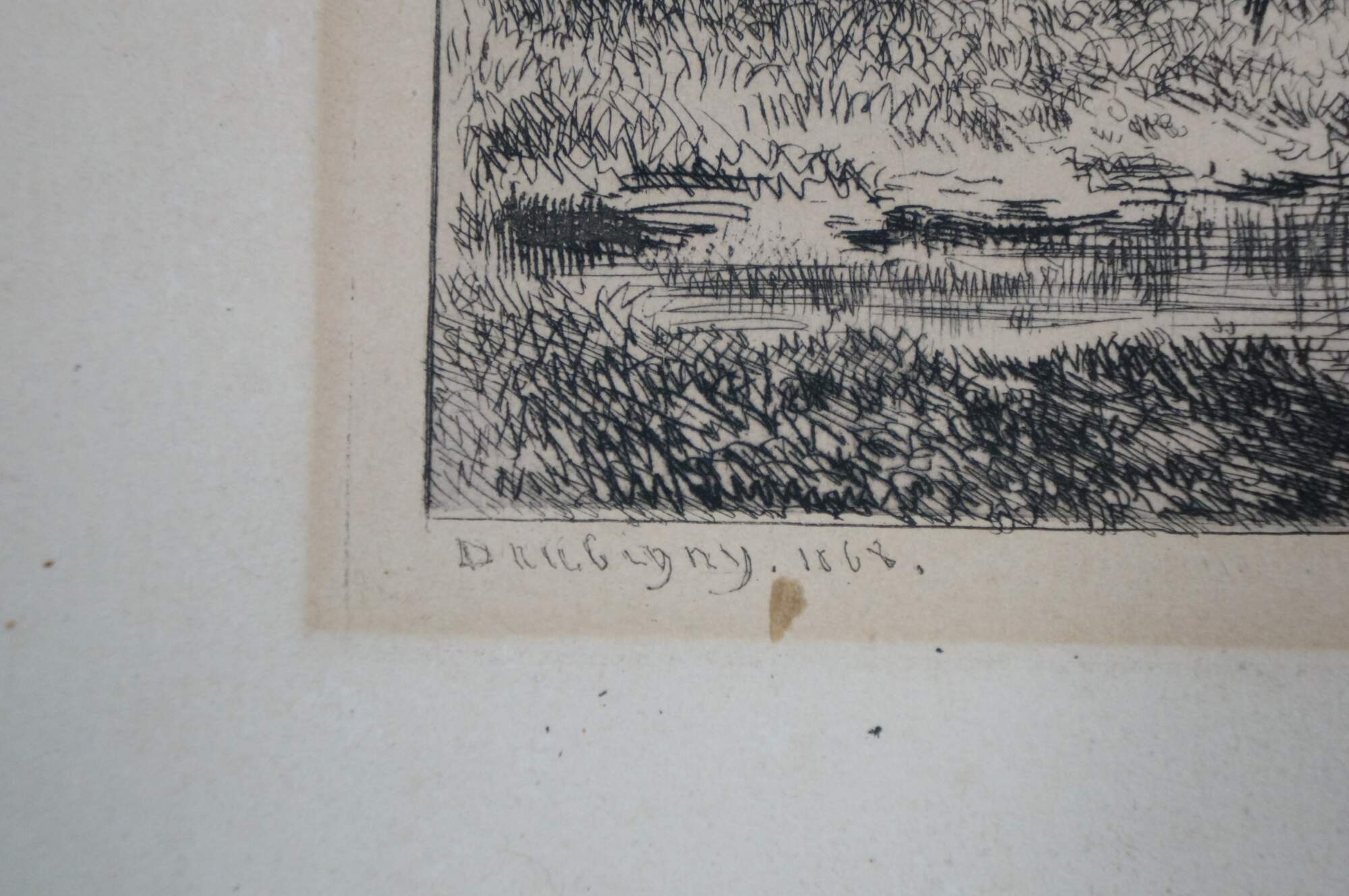 Late 19th century black and white etching titled "The Orchard" by Charles Francois Daubigny. Landscape showing a pair of women walking through trees at the side of a creek. Signed in pate Daubigny 1868, lower left and right. Heavy paper/cardstock; unframed.