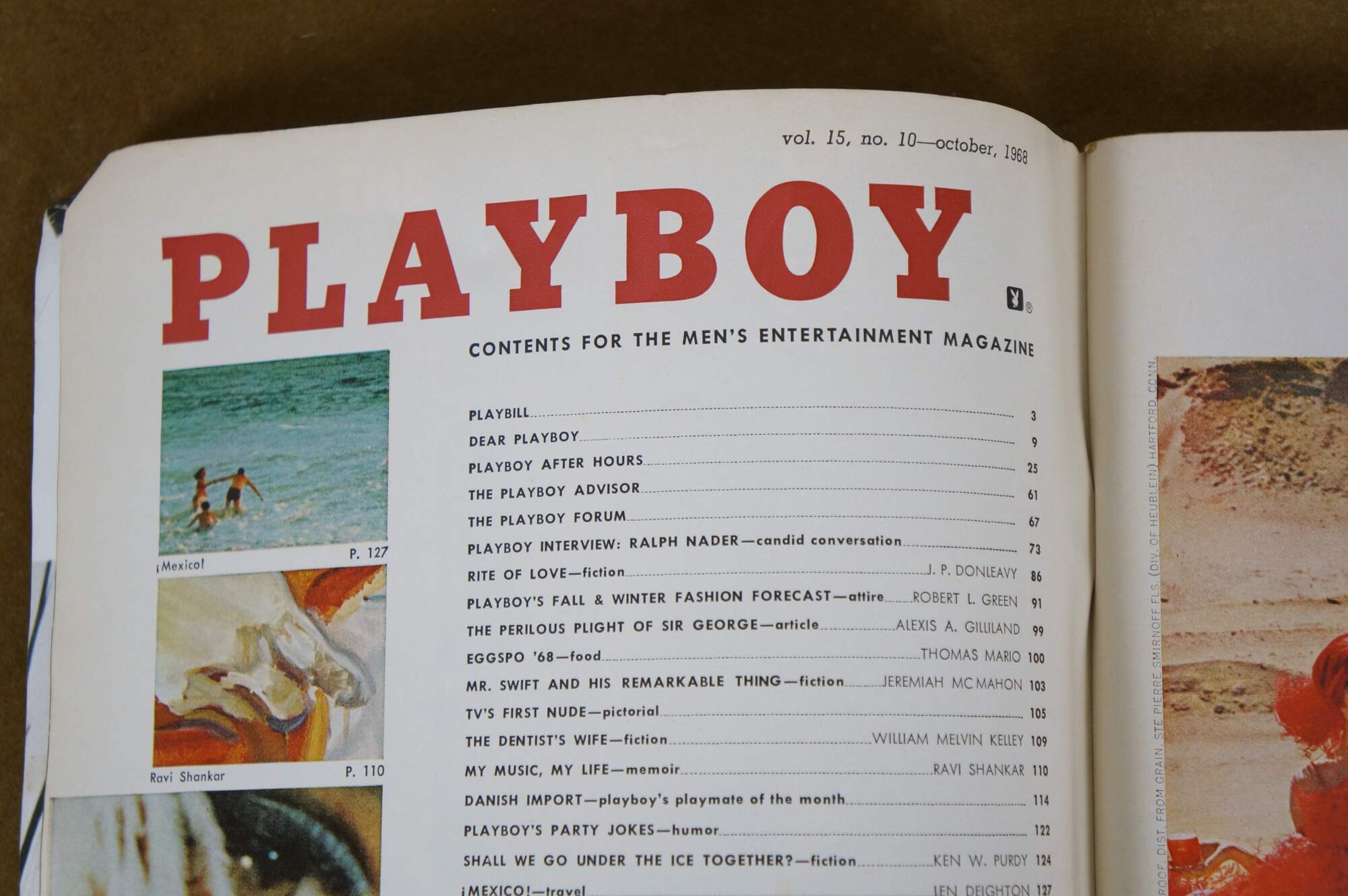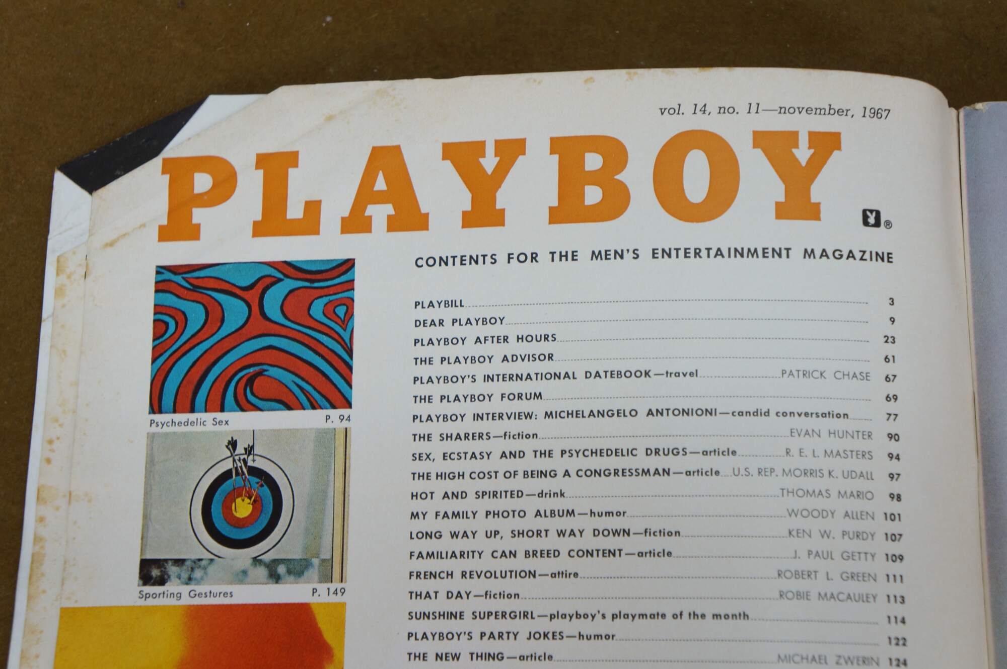 Set of three vintage mid 20th century pornographic / erotic magazines: Playboy Vol 14, No 11, November 1967; Playboy Vol 15, No 10, October 1968; and Release (no date). Playboy centerfolds are intact.