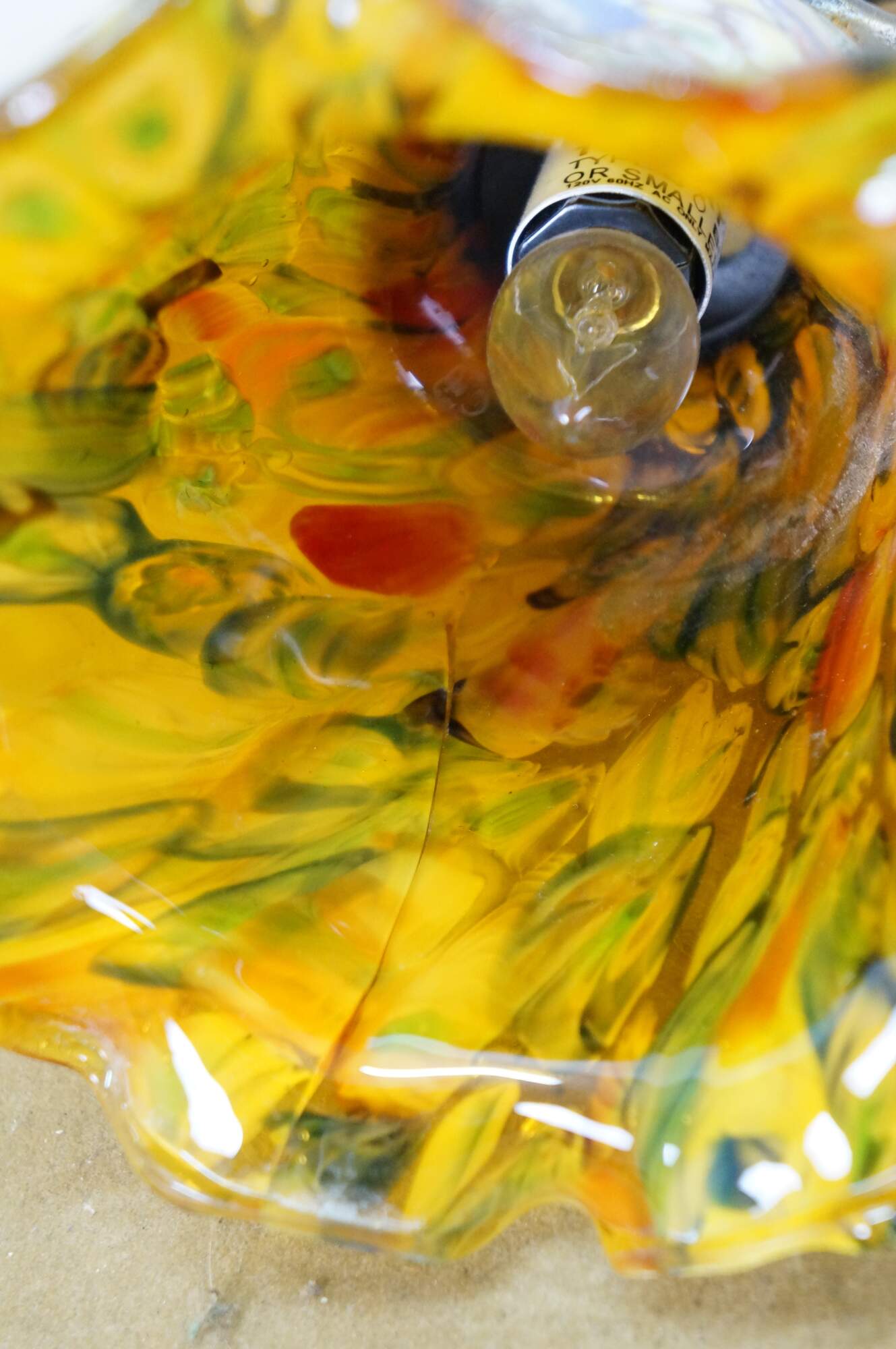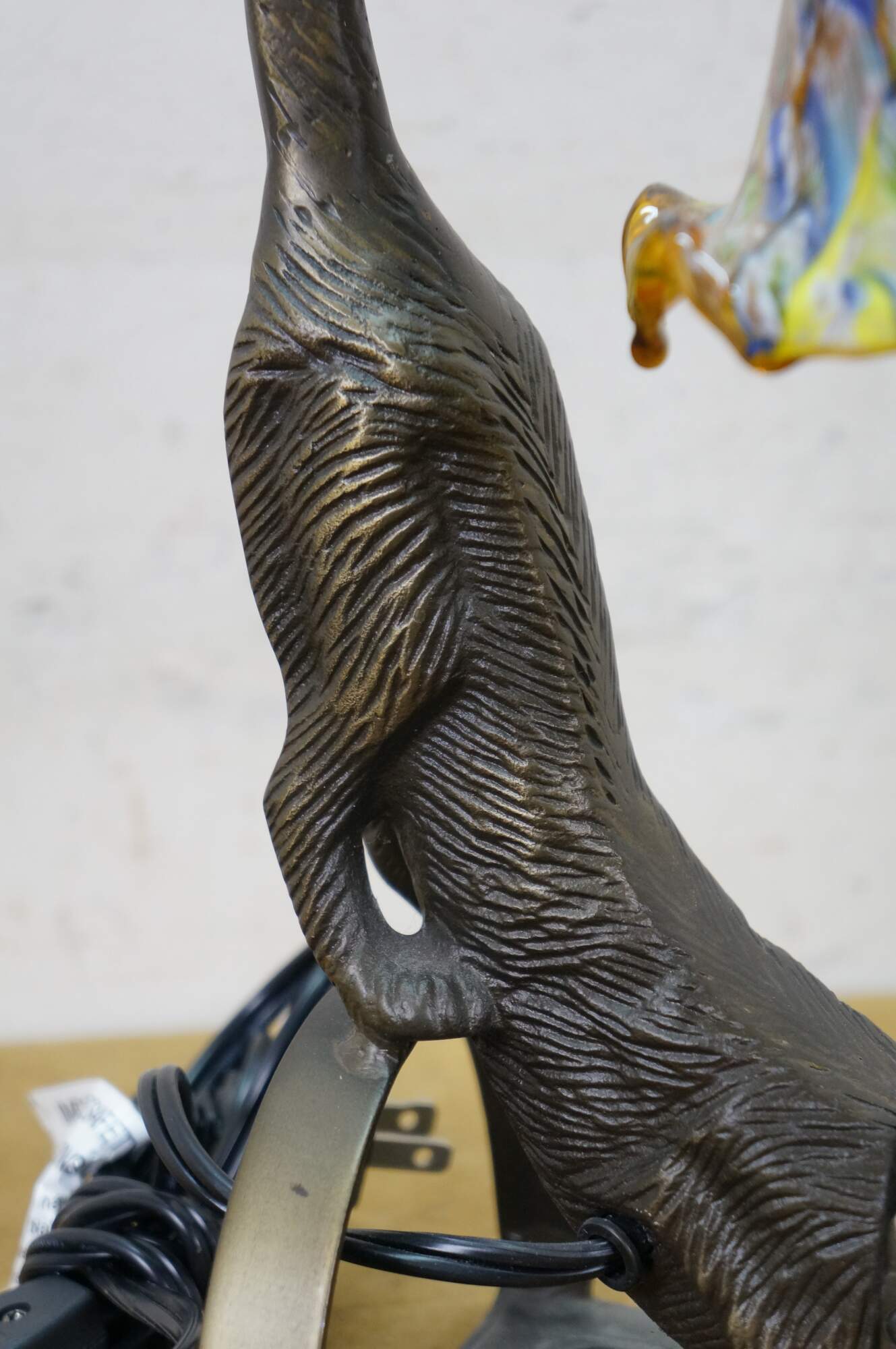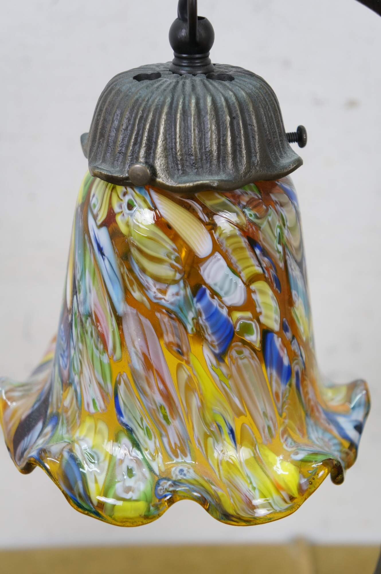 Late 20th to early 21st century Art Deco style bronzed metal table lamp in the shape of a stretching cat with amber eyes, with a millefiored Murano glass style flower shade suspended from its tail. Original design by Charles Pallet.