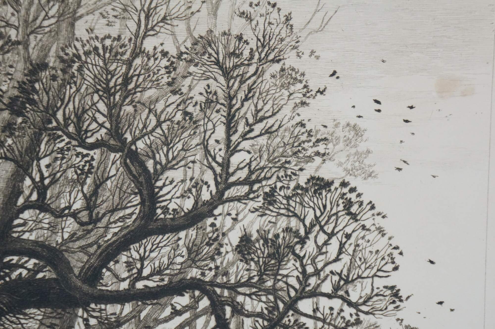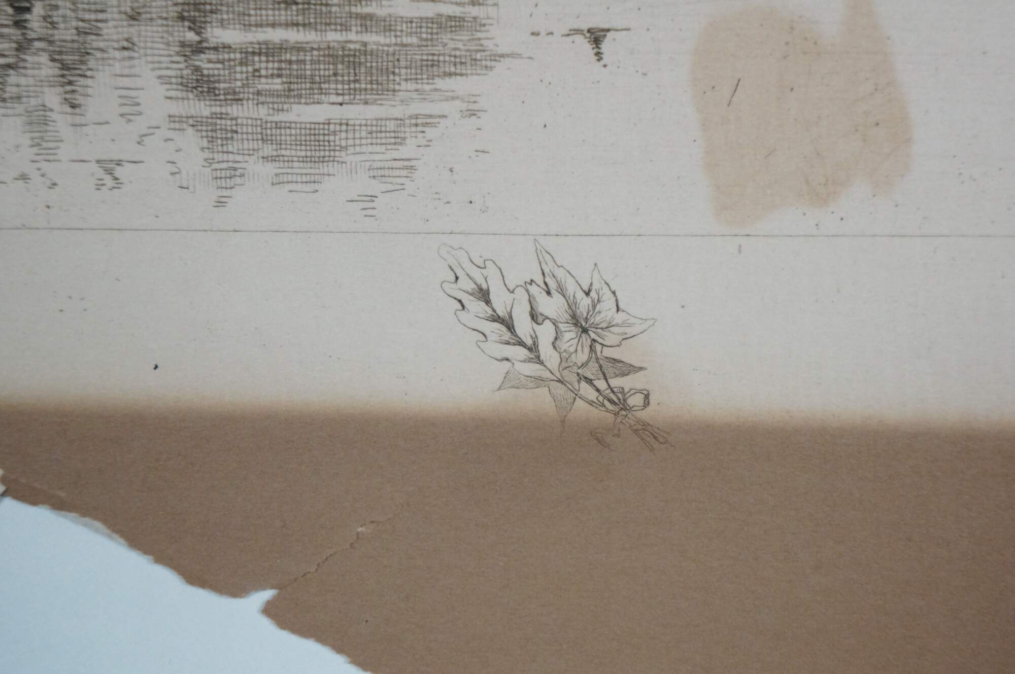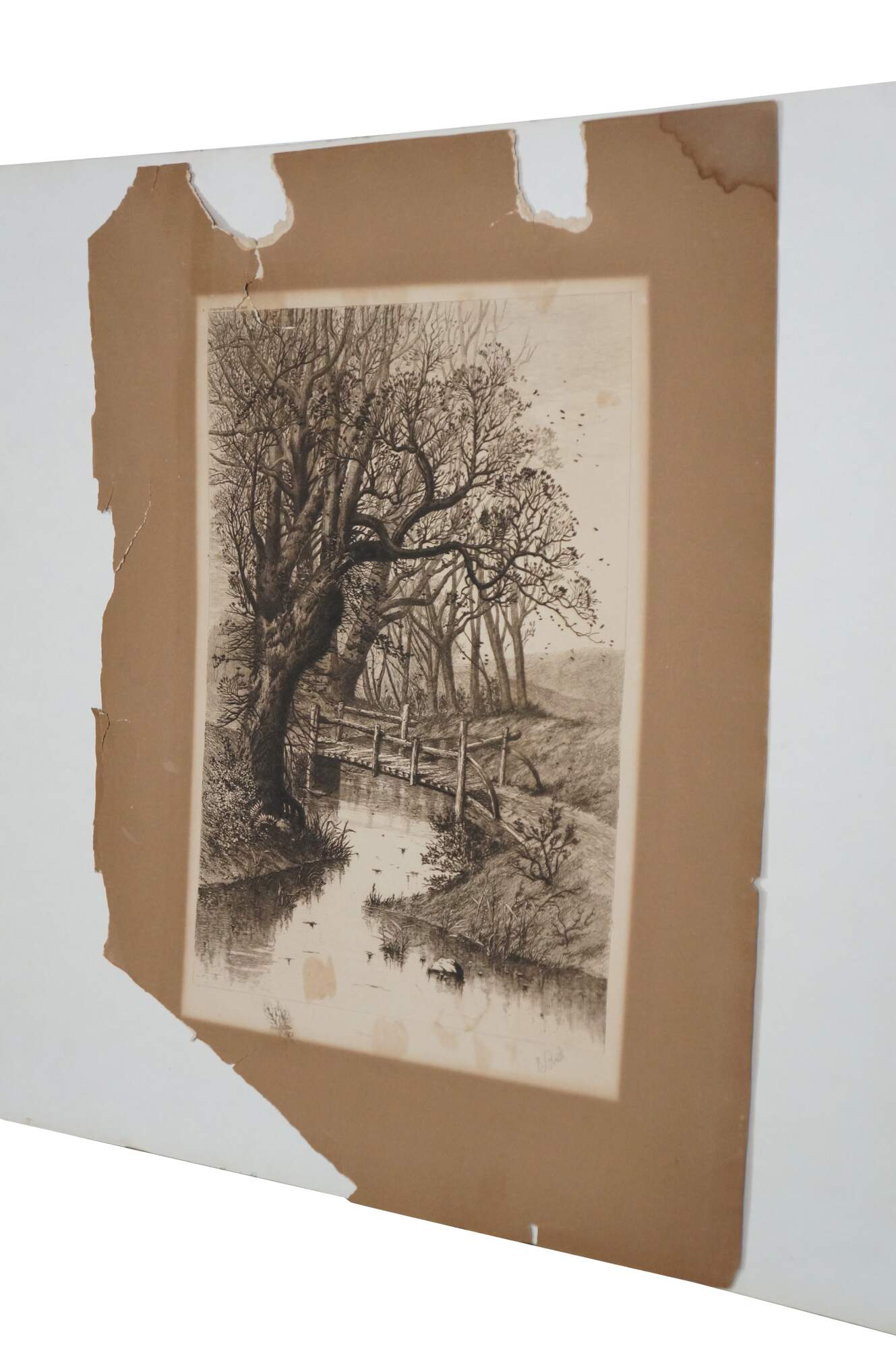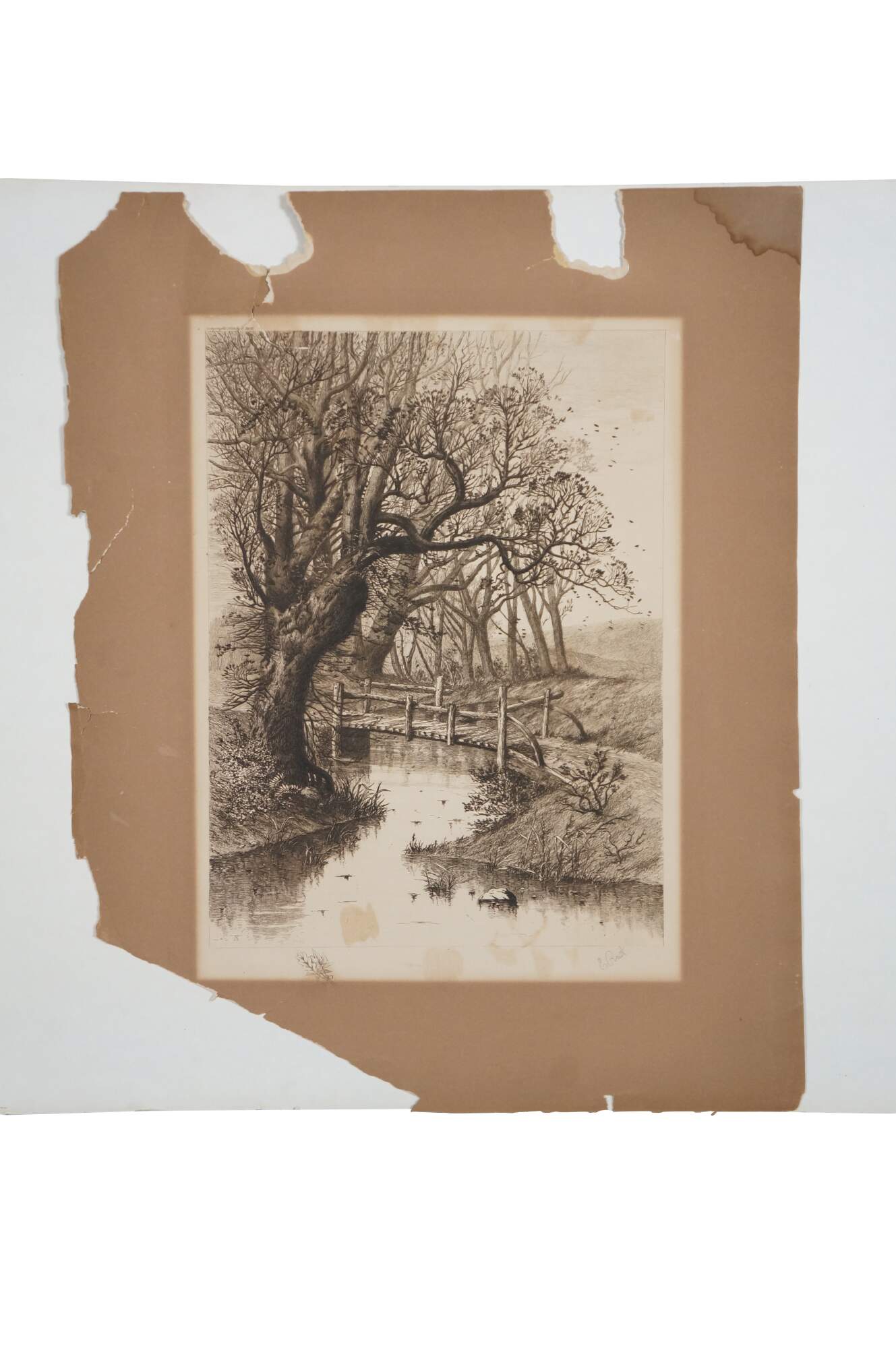 Late 19th century black and white etching by Ernest C. Rost. Landscape showing a path over a rustic wooden bridge at the edge of a forest. Remarke of a pair of leaves, lower left. Pencil signed, lower right. Copyright 1896 by E. Rost. Heavy paper/cardstock; unframed.