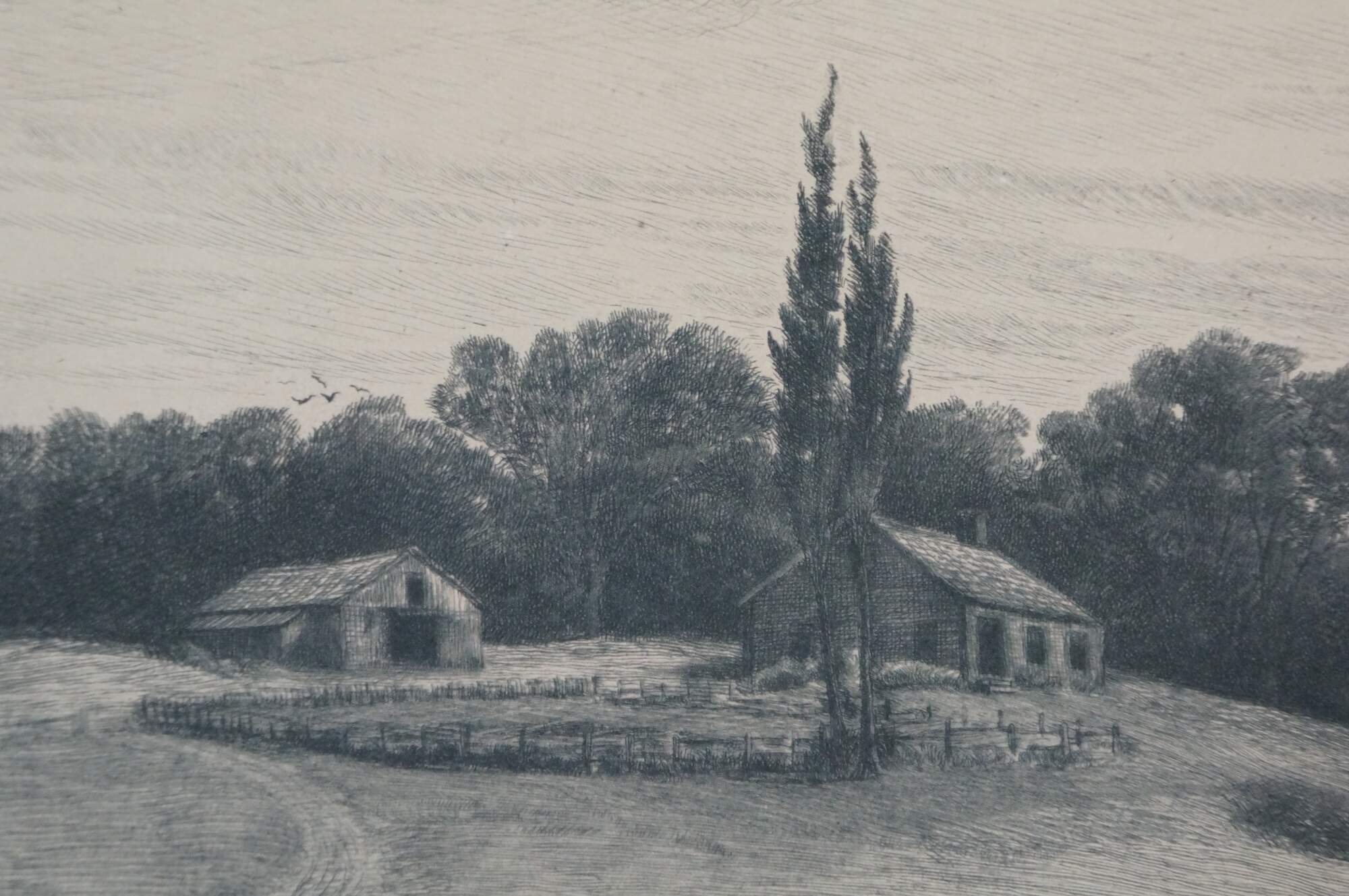 Late 19th century black and white etching by John Hill Millspaugh. Sweeping landscape of a cottage on a low hill by a river. Signed in plate Jn H Millspaugh 91, lower left and Etched by J.H. Milspaugh, lower right. Remarke of a miniature landscape, lower edge. Copyright 1891 by Radtke Lauckner & Co, N.Y. Heavy paper/cardstock; unframed.