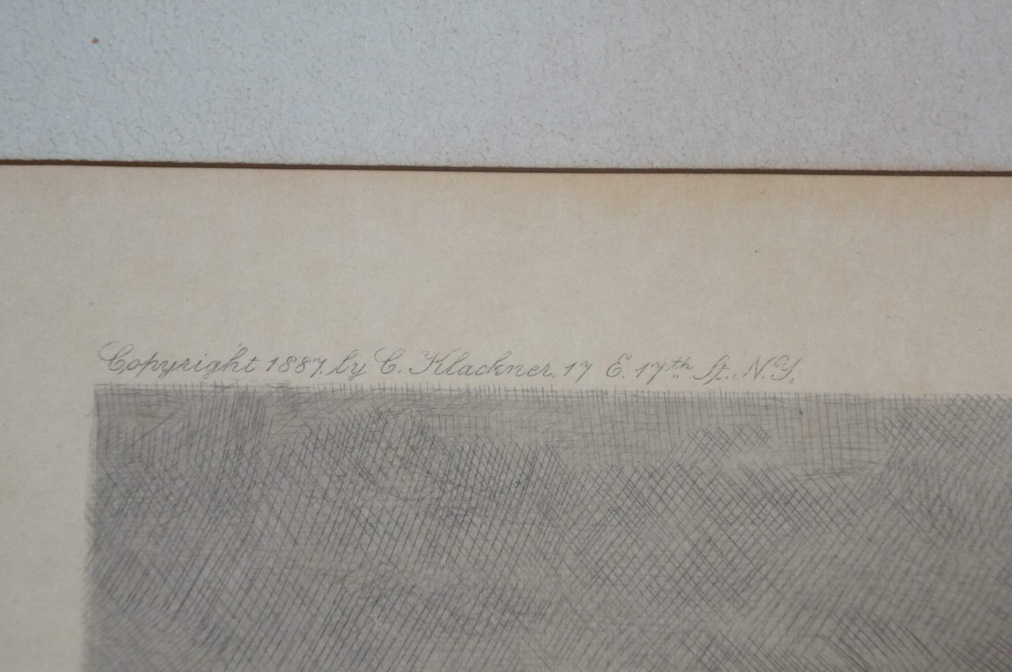 "The following information is from the research and writing of Michael McCue, art historian and curator: John Hill Millspaugh (1822 - 1894), born at Crawford in New York State, became a painter and etcher in the late 19th century and earned much respect for the quality of his work. However, he is little known today. He was raised at Crawford on the Hudson River. At age 16, he went to New York City to apprentice as a stereotyper, which was highly detailed work creating relief plates of metal from original woodcuts. By the mid 1840s, he was working in Waverly as a stereotyper, and then moved to Ithaca where he met his wife, Marion Elizabeth Cornell. Her uncle, Ezra Cornell became exceedingly wealthy from the telegraph business and founded Cornell University. John had a brother, Edward, who showed early talent as an artist and studied with Henry Inman, a leading Hudson River School painter. He died at age 31 from smallpox. Hoping to carry on his brother's work, John began studying art, and his most influential teacher was George Lafayette Clough (1824-1901), also a Hudson River School painter. John Millspaugh's career between 1851 and 1871 remains undocumented, but according to his obituary, he considered himself an amateur artist. It is thought he made his living during this period as a stereotyper. A description of one of his oil paintings shows a family picnic, and one person reported seeing an etching of Cornell University. The only known painting in a public collection is dated 1872 and is titled "Autumn in the Susquehannock." It is a pastoral landscape in the Hudson River School style and is in the Palmer Art Museum at Pennsylvania State University. In 1872, Millspaugh left Ithaca for New York City to take a job for an undetermined period of time at the Customs House. However, his family suffered when a severe depression, the Panic of 1873, hit a year later, and his son had to leave college. By 1882, he reportedly was getting attention in New York City for his etching, an art form that was extremely popular at that time and tried by many artists. Millspaugh was invited to join the New York Etching Club, the country's first organization specifically devoted to that medium. His etchings are highly detailed, and most of them depict quiet landscapes. The earliest one published was likely "Evening on the Delaware," by fine-art publisher Christian Klackner. One of these works is in the Parrish Art Museum at Southampton, Long Island. Millspaugh collaborated with Boston painter and etcher Louis K Harlow to publish works through Klackner. After 1889, Millspaugh did mostly self publishing. At an undetermined date, he left Manhattan and returned to Ithica to live. He and his wife spent the winter of 1893-94 in Denver, Colorado, and he died on the return trip to Ithaca." (Source: askART)