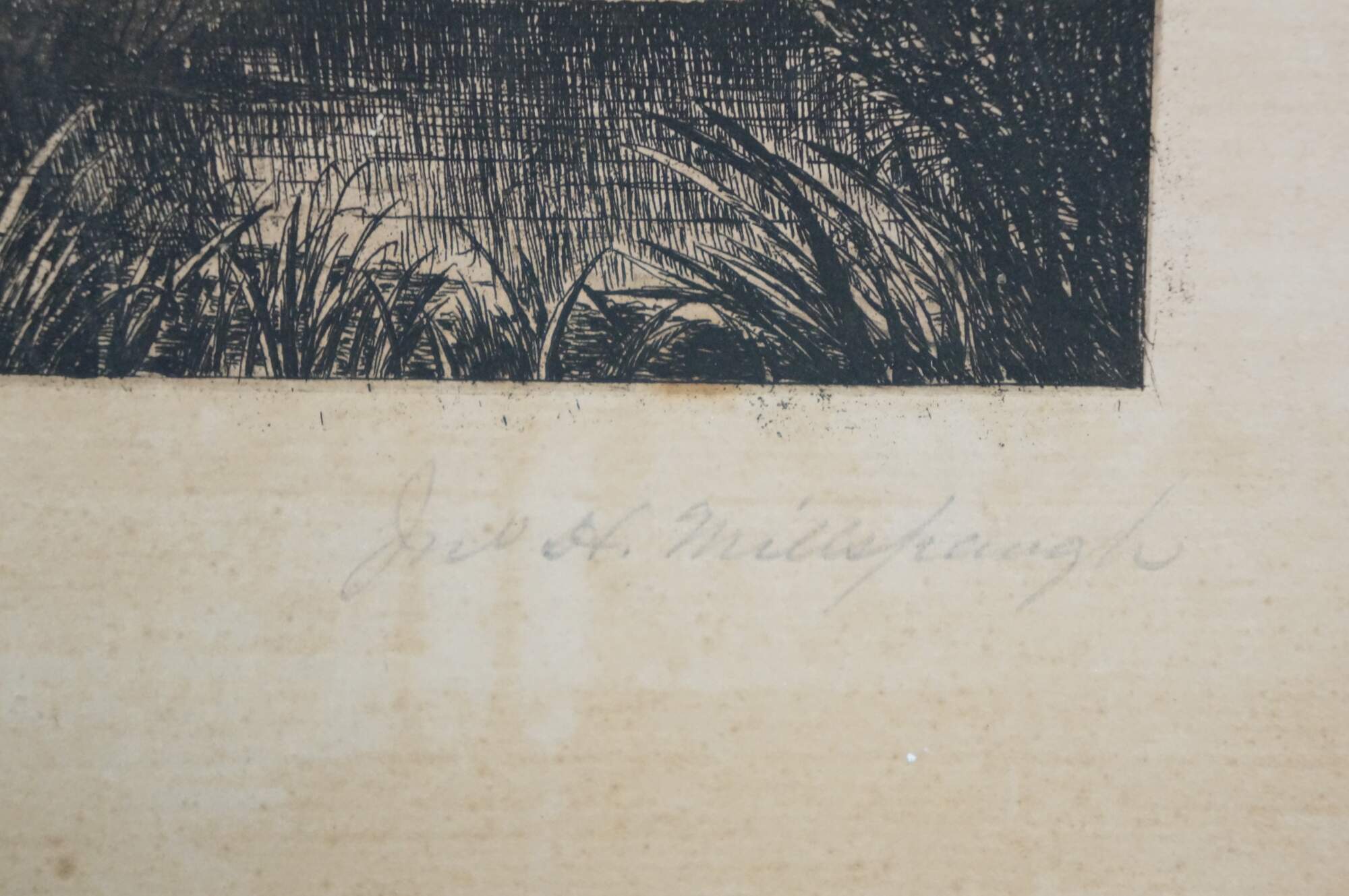 Late 19th century black and white etching by John Hill Millspaugh. Landscape featuring a single bird perched above a wetland / marsh. signed in plate, lower left. Copyright 1884 by C. Klackner, 17 E 17th St, New York. Pencil signed, lower right. Paper mounted on cardstock; unframed.