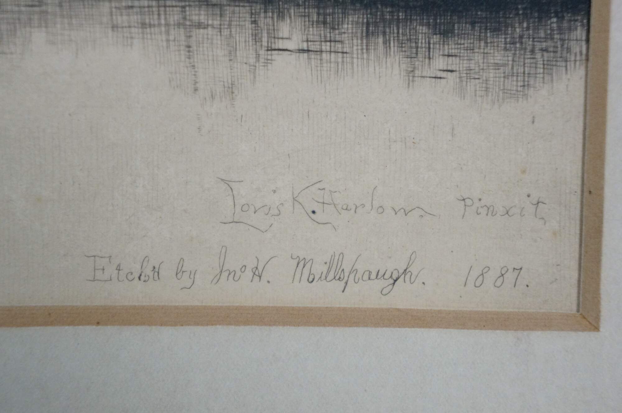 Late 19th century black and white etching by John Hill Millspaugh after a painting by Louis Kinney Harlow. River's edge landscape featuring a cottage and several boats. Signed in plate Louis K Harlow Pinxit and Etch'd by Jn H Millspaugh 1887, lower right. Heavy paper/cardstock; white mat; unframed.