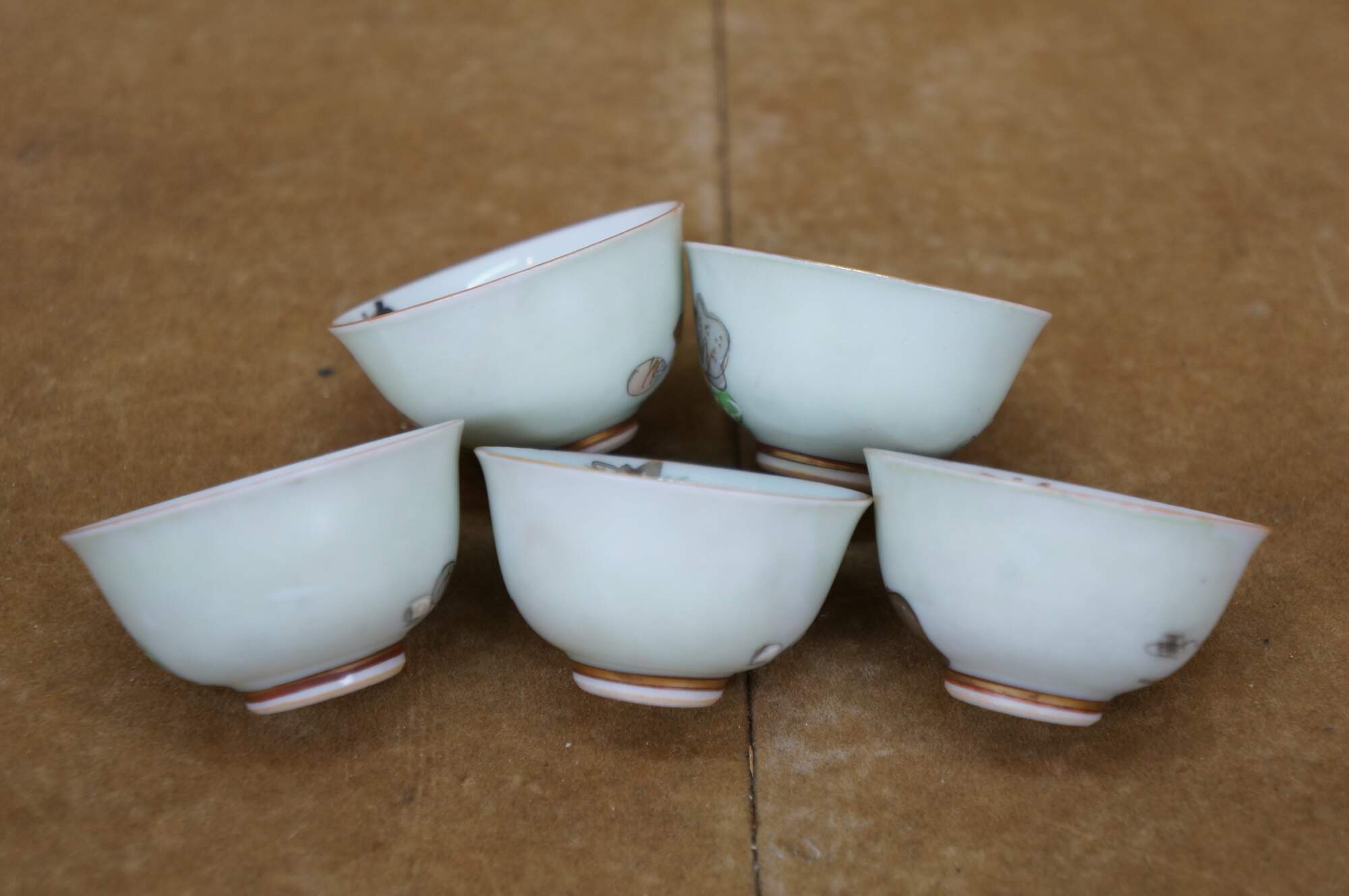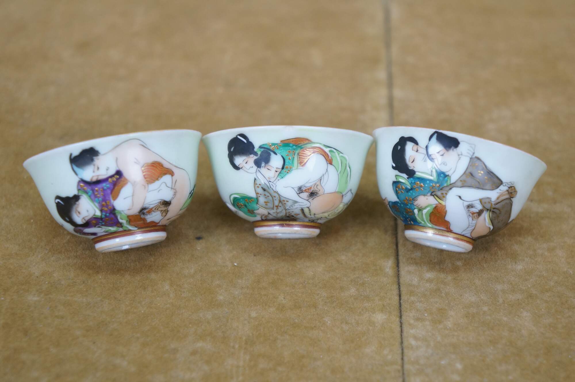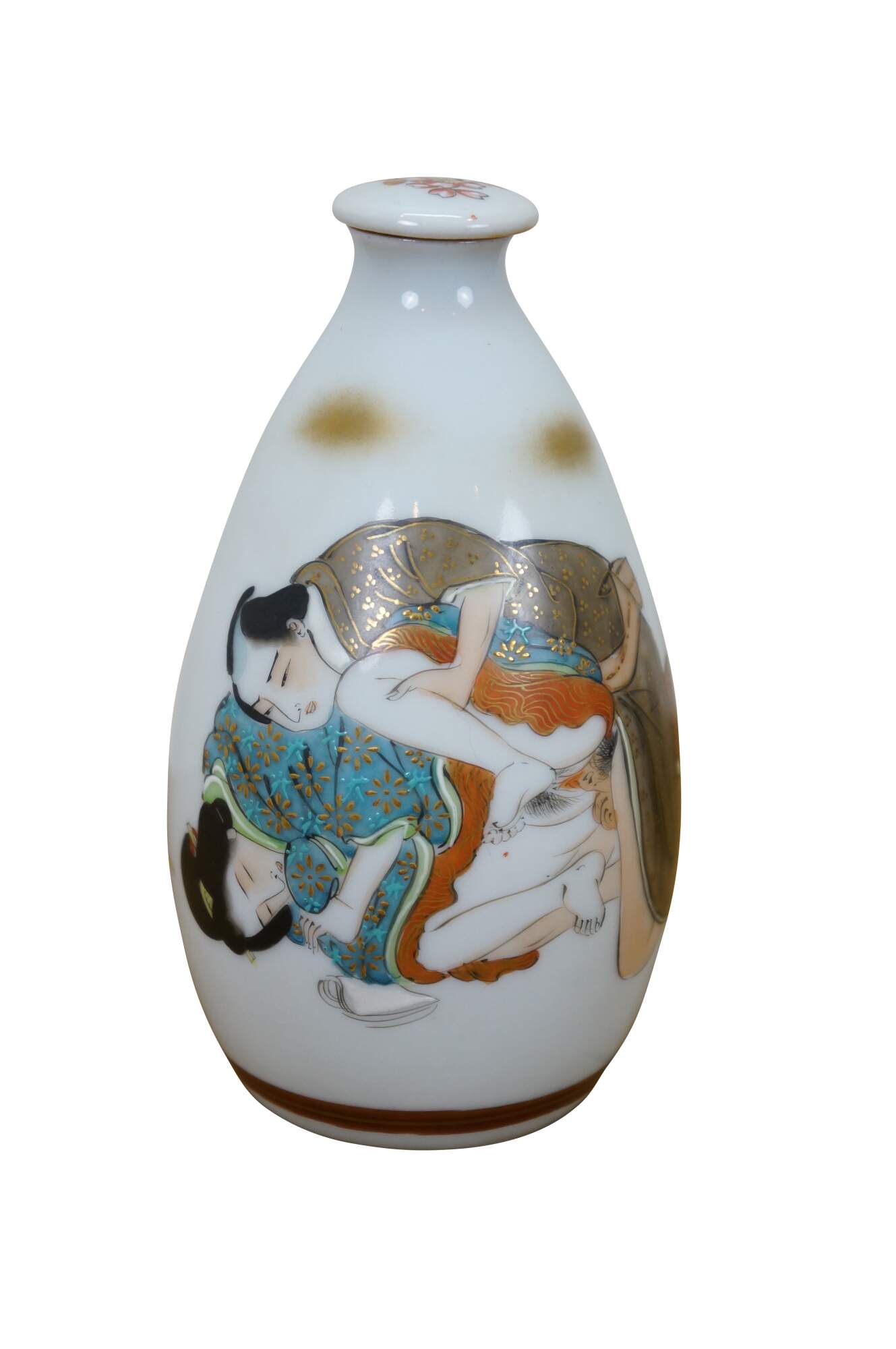 Vintage seven piece Japanese porcelain sake set including two lidded flasks / bottles and five delicate cups, hand painted with figures in a variety of amorous poses.