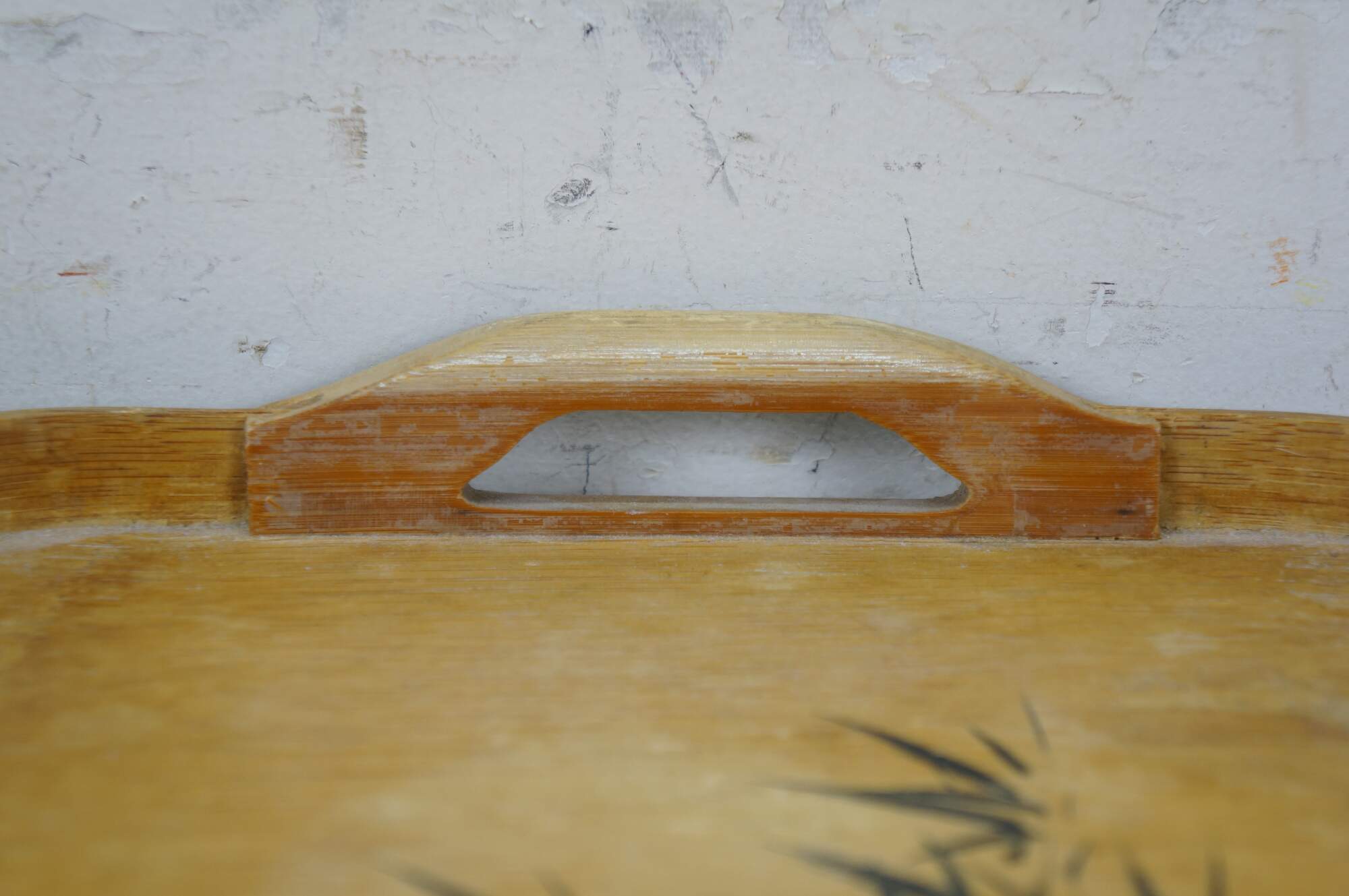 Vintage Japanese serving tray - rectangular shape with rounded corners, raised edge, and pierced handles. Painted in black with bamboo stalks and leaves.