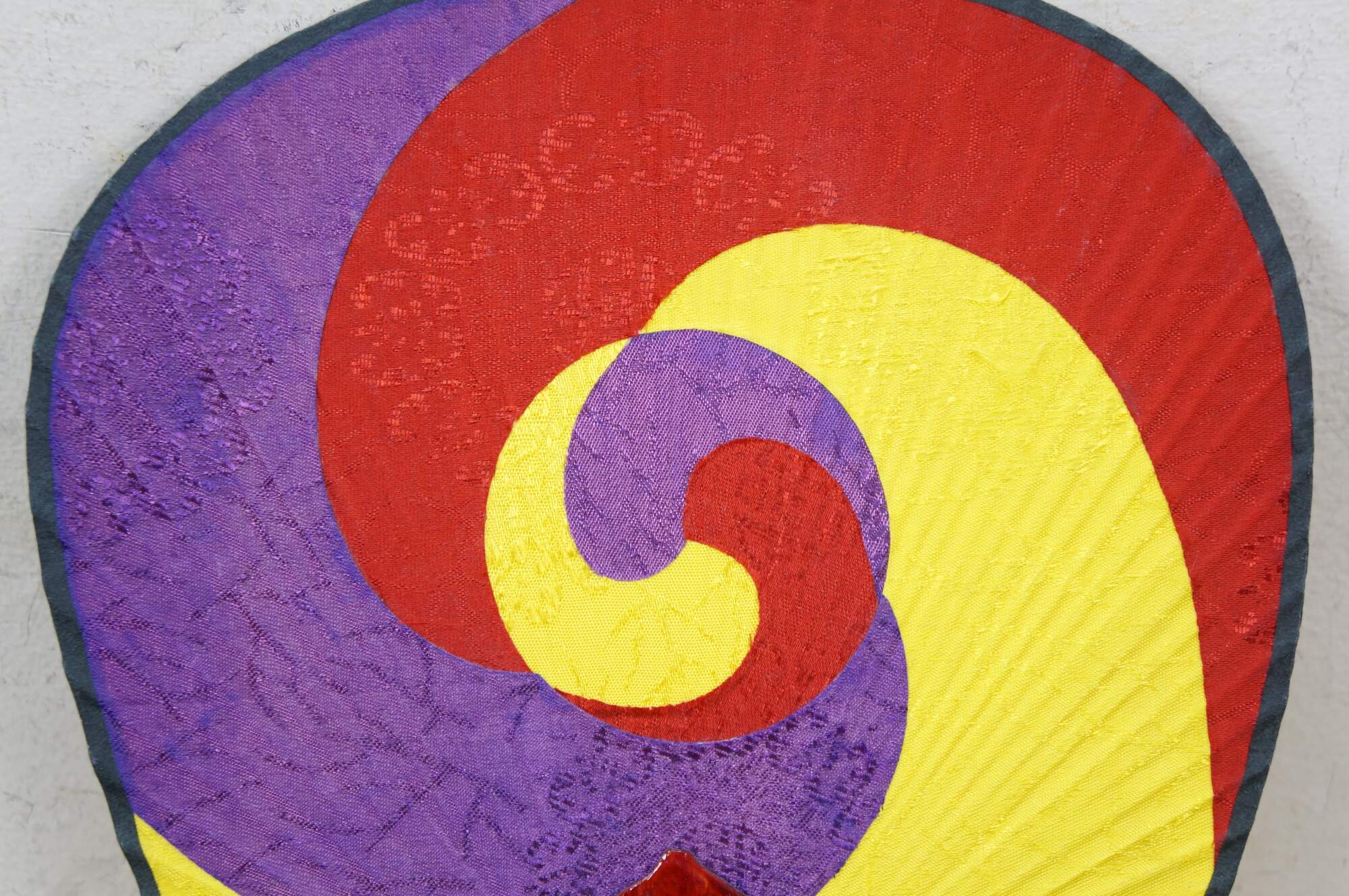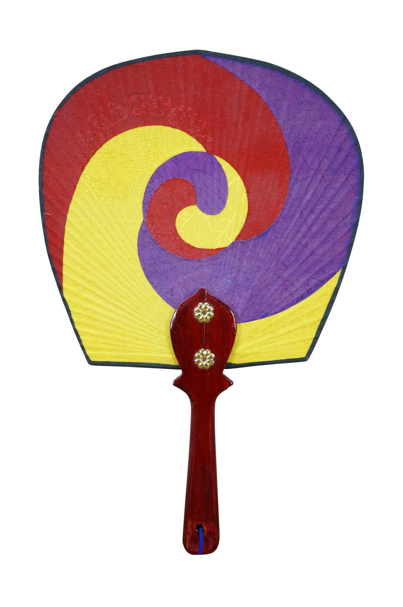 Late 20th century South Korean silk paddle-style hand fan with lacquered wood handle, decorated with a tri-color sam taegeuk design in yellow, red, and purple.