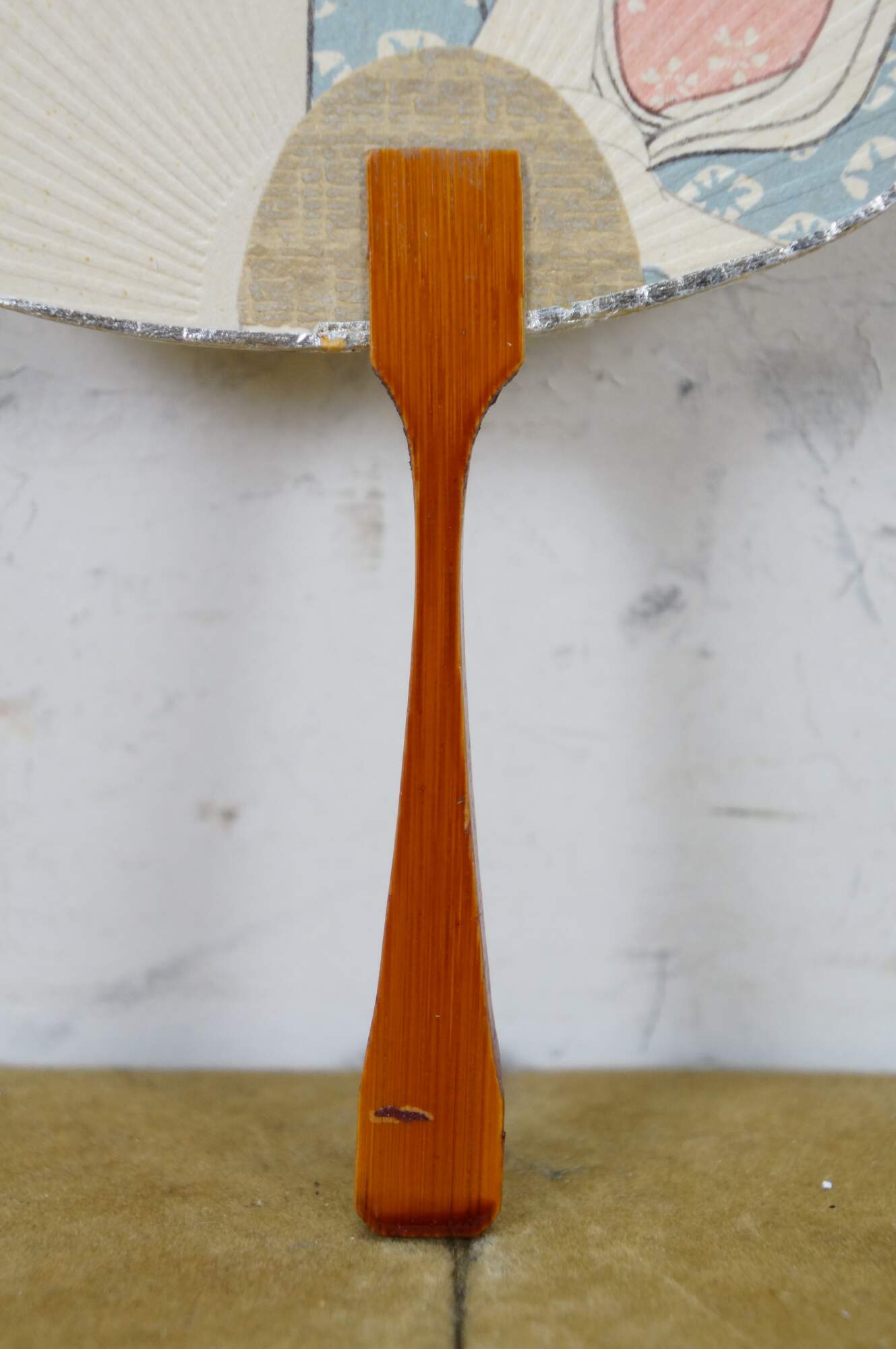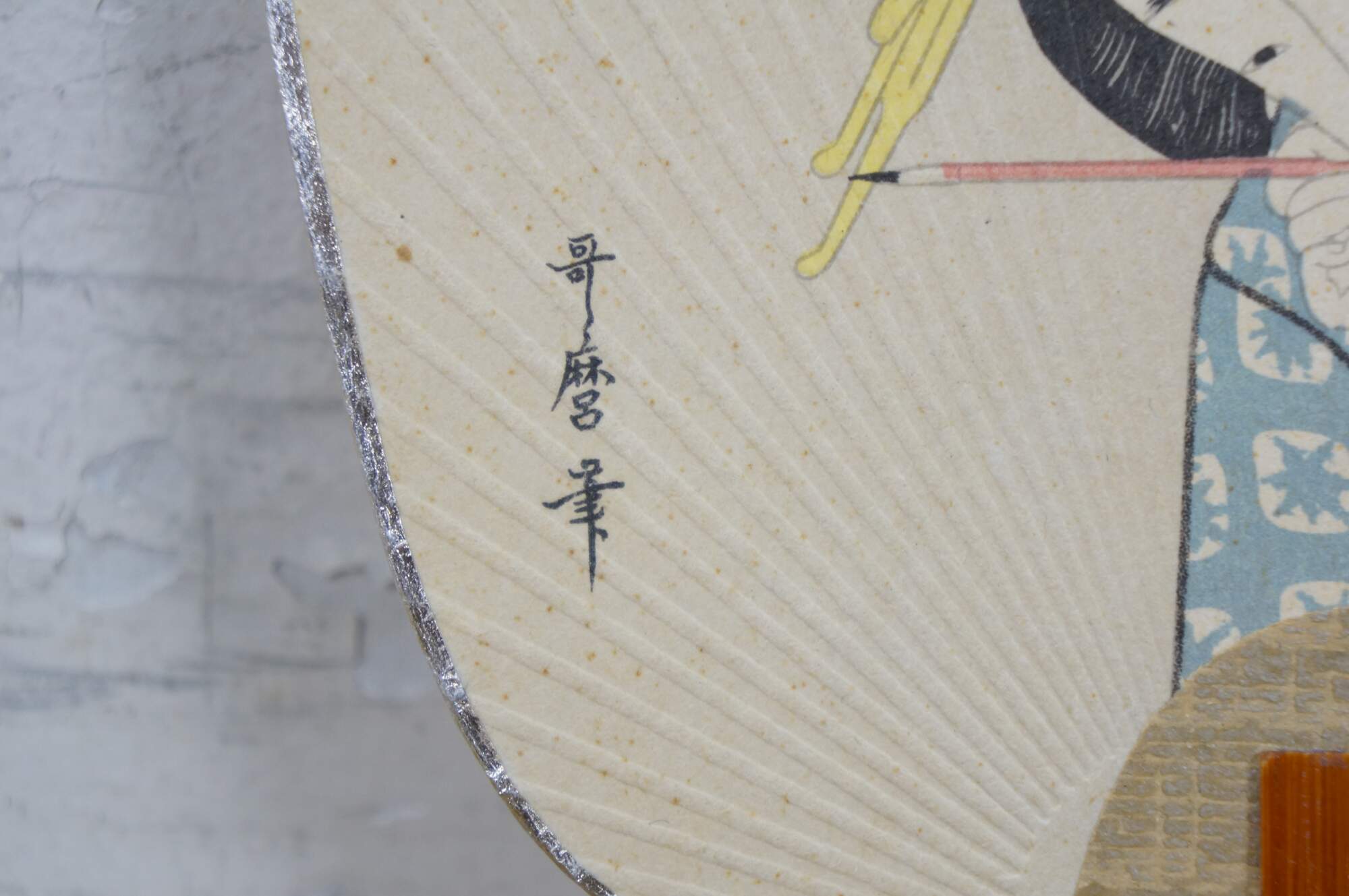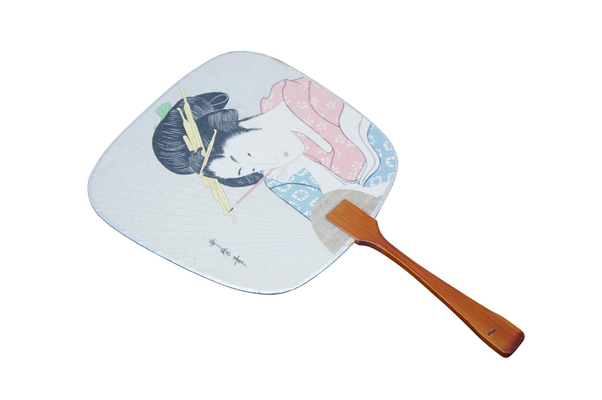 Vintage 20th century paddle style hand fan with lacquered bamboo handle and cardstock top, printed with the image of a Japanese lady or geisha, holding a paintbrush. Postcard style back. Edged in silver.
