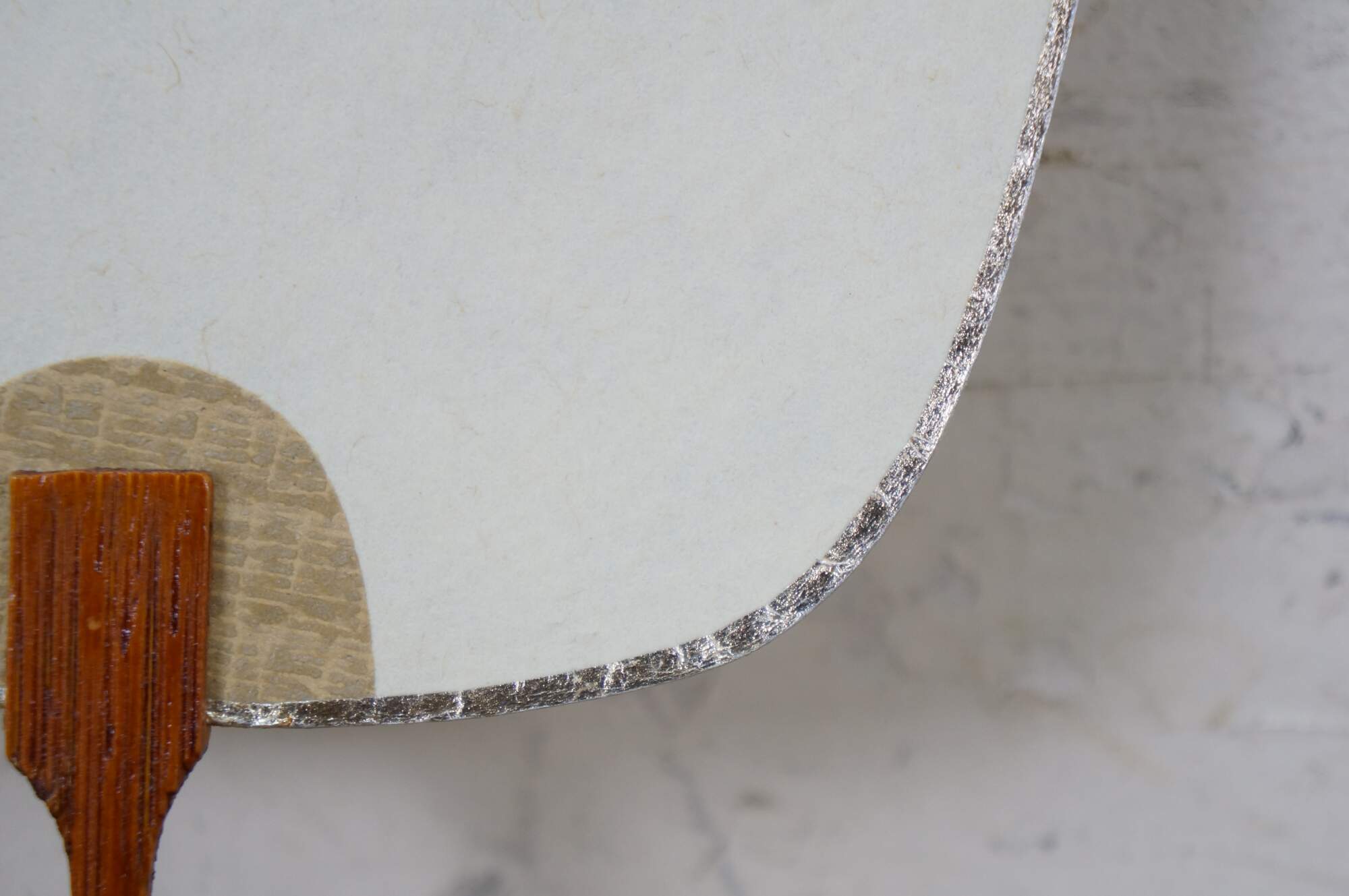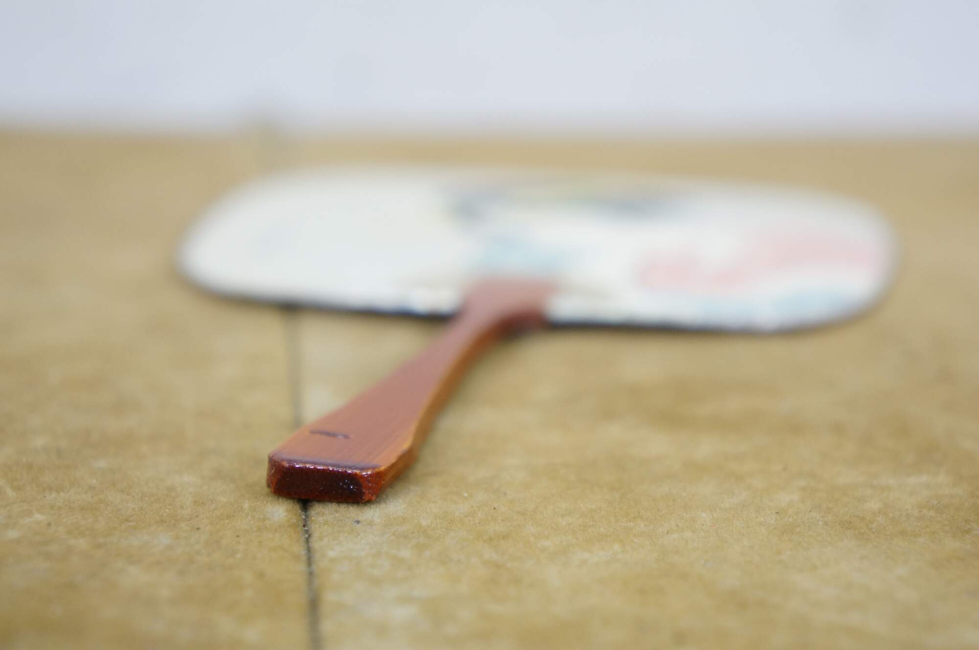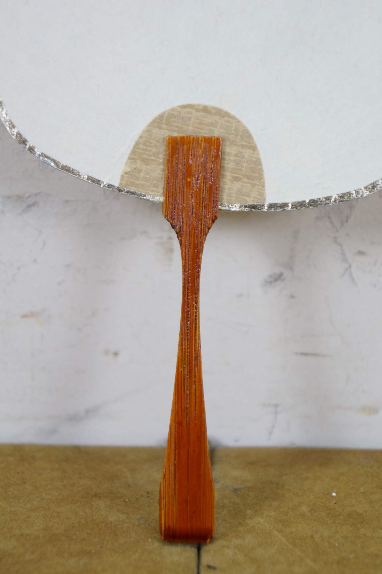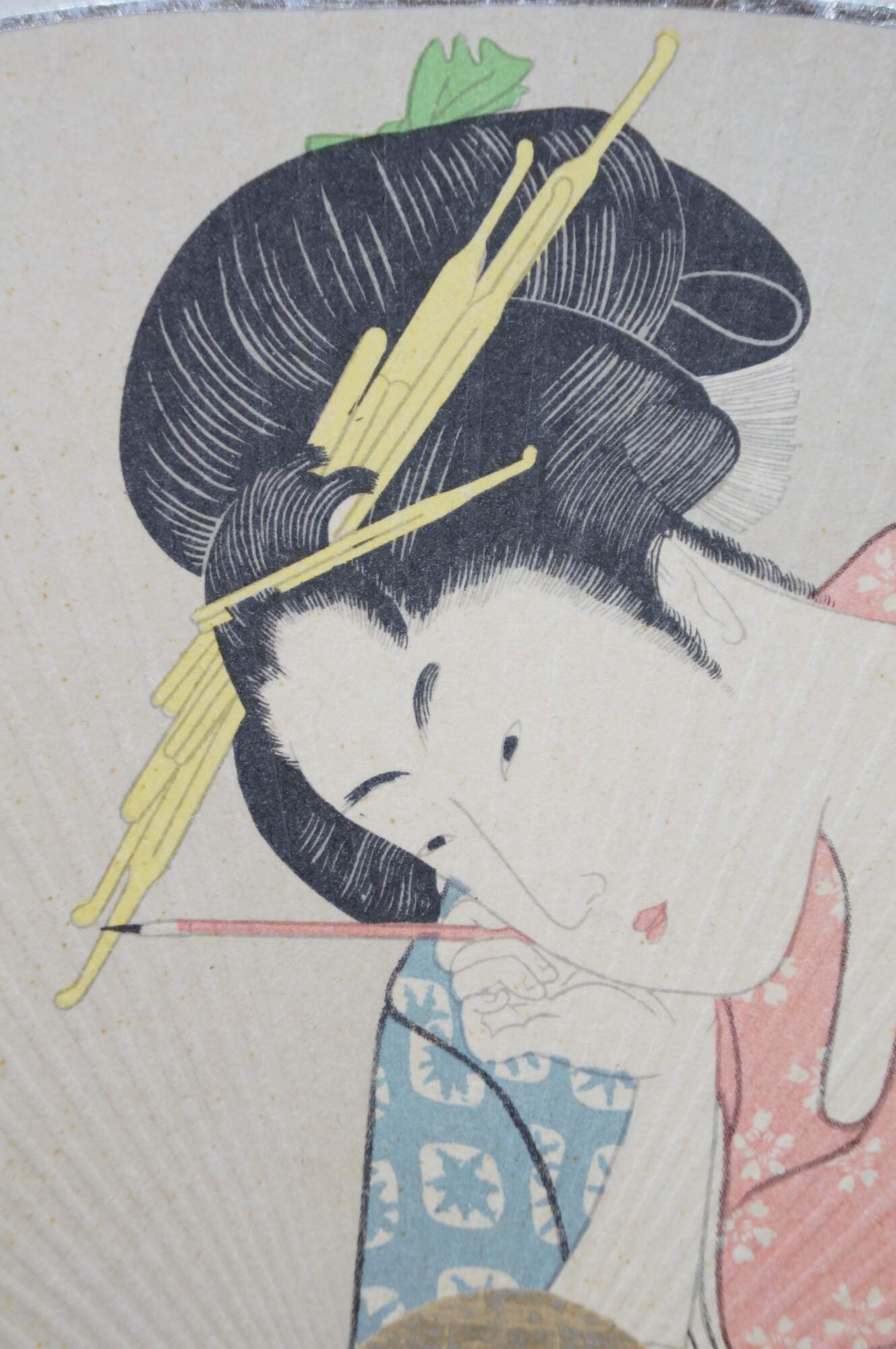 Vintage 20th century paddle style hand fan with lacquered bamboo handle and cardstock top, printed with the image of a Japanese lady or geisha, holding a paintbrush. Postcard style back. Edged in silver.