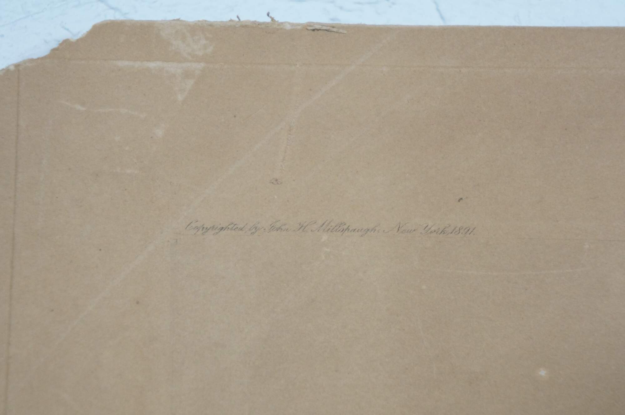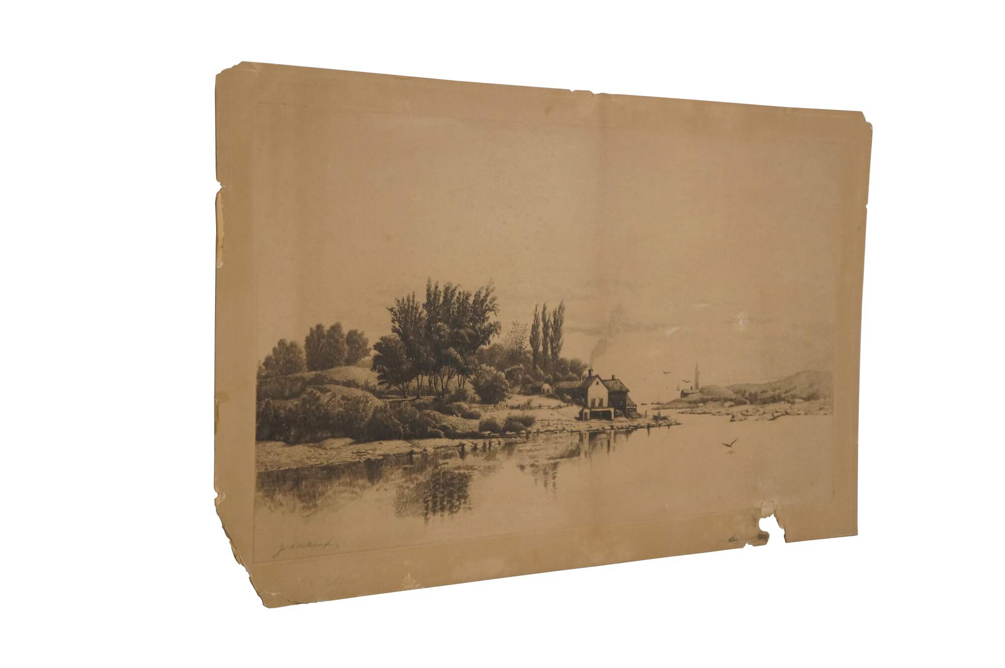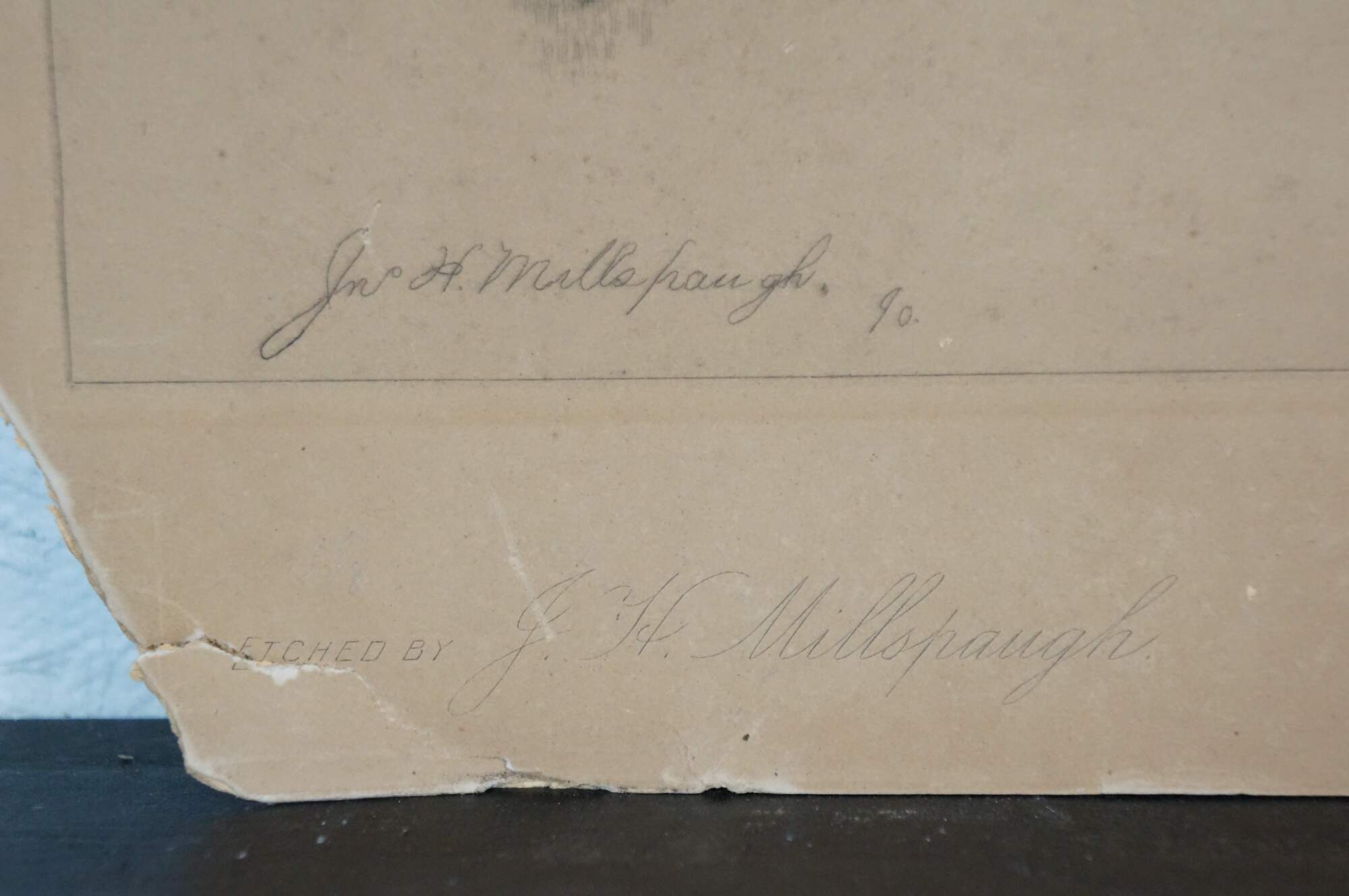 "The following information is from the research and writing of Michael McCue, art historian and curator: John Hill Millspaugh (1822 - 1894), born at Crawford in New York State, became a painter and etcher in the late 19th century and earned much respect for the quality of his work. However, he is little known today. He was raised at Crawford on the Hudson River. At age 16, he went to New York City to apprentice as a stereotyper, which was highly detailed work creating relief plates of metal from original woodcuts. By the mid 1840s, he was working in Waverly as a stereotyper, and then moved to Ithaca where he met his wife, Marion Elizabeth Cornell. Her uncle, Ezra Cornell became exceedingly wealthy from the telegraph business and founded Cornell University. John had a brother, Edward, who showed early talent as an artist and studied with Henry Inman, a leading Hudson River School painter. He died at age 31 from smallpox. Hoping to carry on his brother's work, John began studying art, and his most influential teacher was George Lafayette Clough (1824-1901), also a Hudson River School painter. John Millspaugh's career between 1851 and 1871 remains undocumented, but according to his obituary, he considered himself an amateur artist. It is thought he made his living during this period as a stereotyper. A description of one of his oil paintings shows a family picnic, and one person reported seeing an etching of Cornell University. The only known painting in a public collection is dated 1872 and is titled "Autumn in the Susquehannock." It is a pastoral landscape in the Hudson River School style and is in the Palmer Art Museum at Pennsylvania State University. In 1872, Millspaugh left Ithaca for New York City to take a job for an undetermined period of time at the Customs House. However, his family suffered when a severe depression, the Panic of 1873, hit a year later, and his son had to leave college. By 1882, he reportedly was getting attention in New York City for his etching, an art form that was extremely popular at that time and tried by many artists. Millspaugh was invited to join the New York Etching Club, the country's first organization specifically devoted to that medium. His etchings are highly detailed, and most of them depict quiet landscapes. The earliest one published was likely "Evening on the Delaware," by fine-art publisher Christian Klackner. One of these works is in the Parrish Art Museum at Southampton, Long Island. Millspaugh collaborated with Boston painter and etcher Louis K Harlow to publish works through Klackner. After 1889, Millspaugh did mostly self publishing. At an undetermined date, he left Manhattan and returned to Ithica to live. He and his wife spent the winter of 1893-94 in Denver, Colorado, and he died on the return trip to Ithaca." (Source: askART)